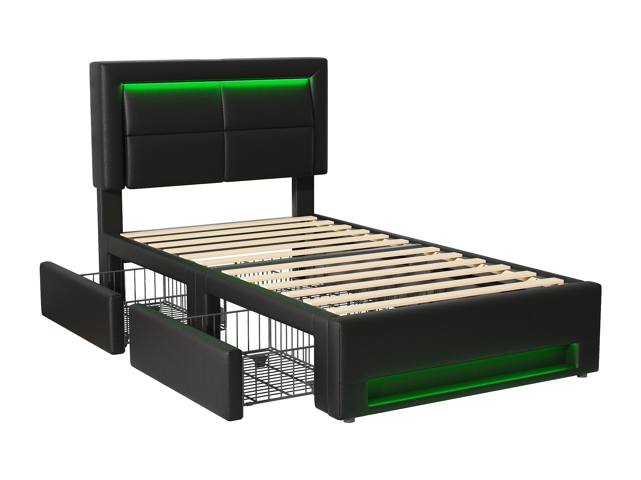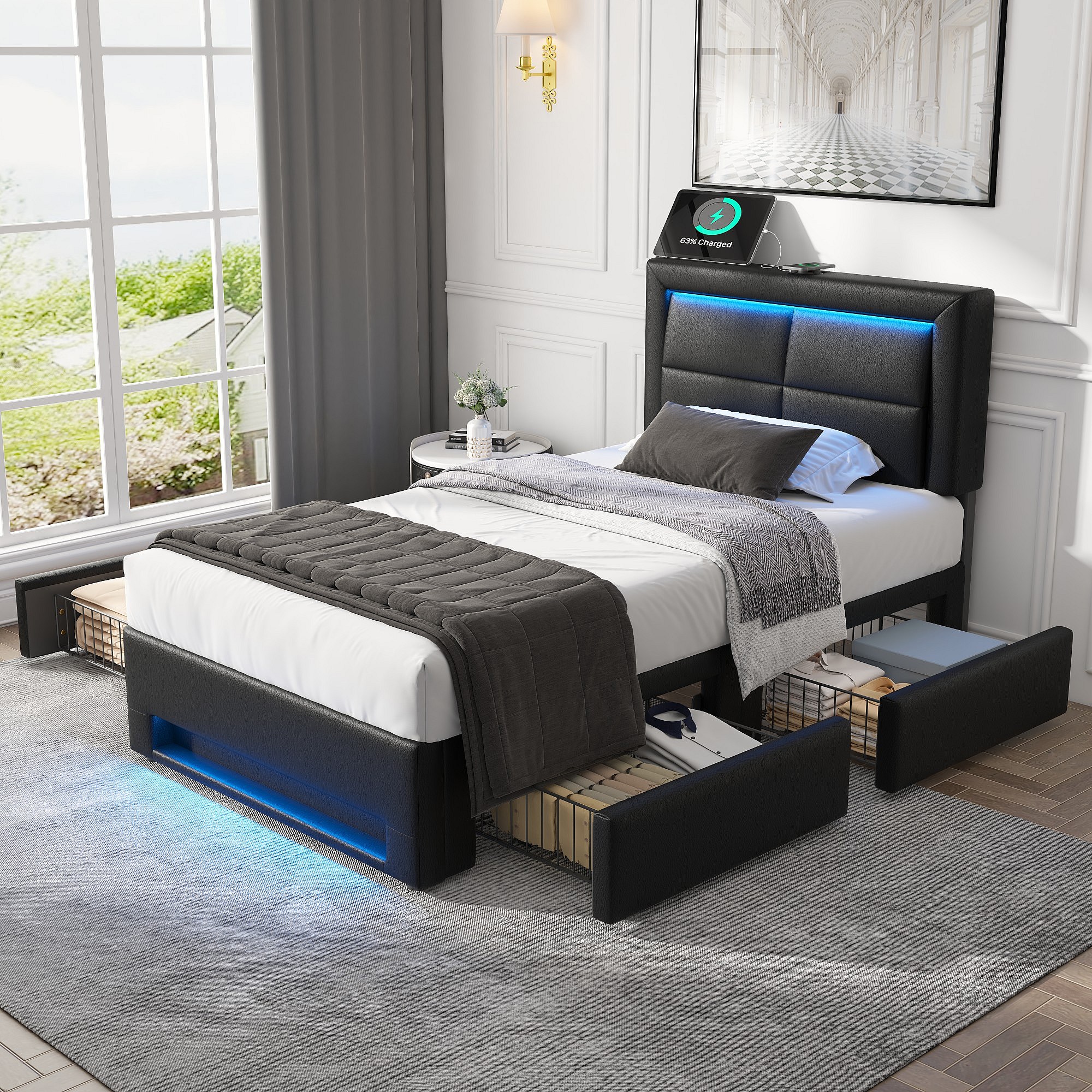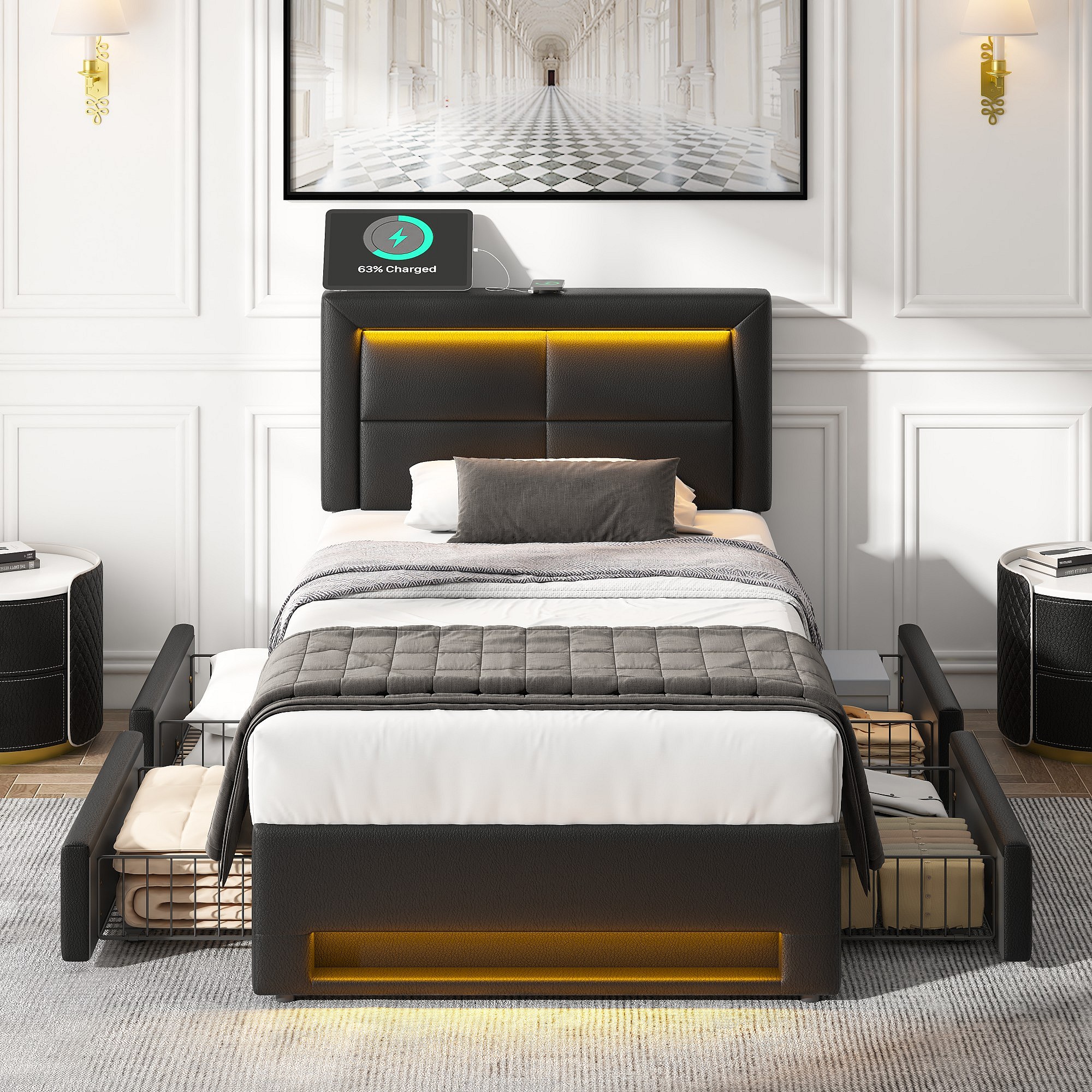 Lit rembourré 90x190 cm avec USB, éclairage LED et 4 tiroirs, noir, design multifonctionnel