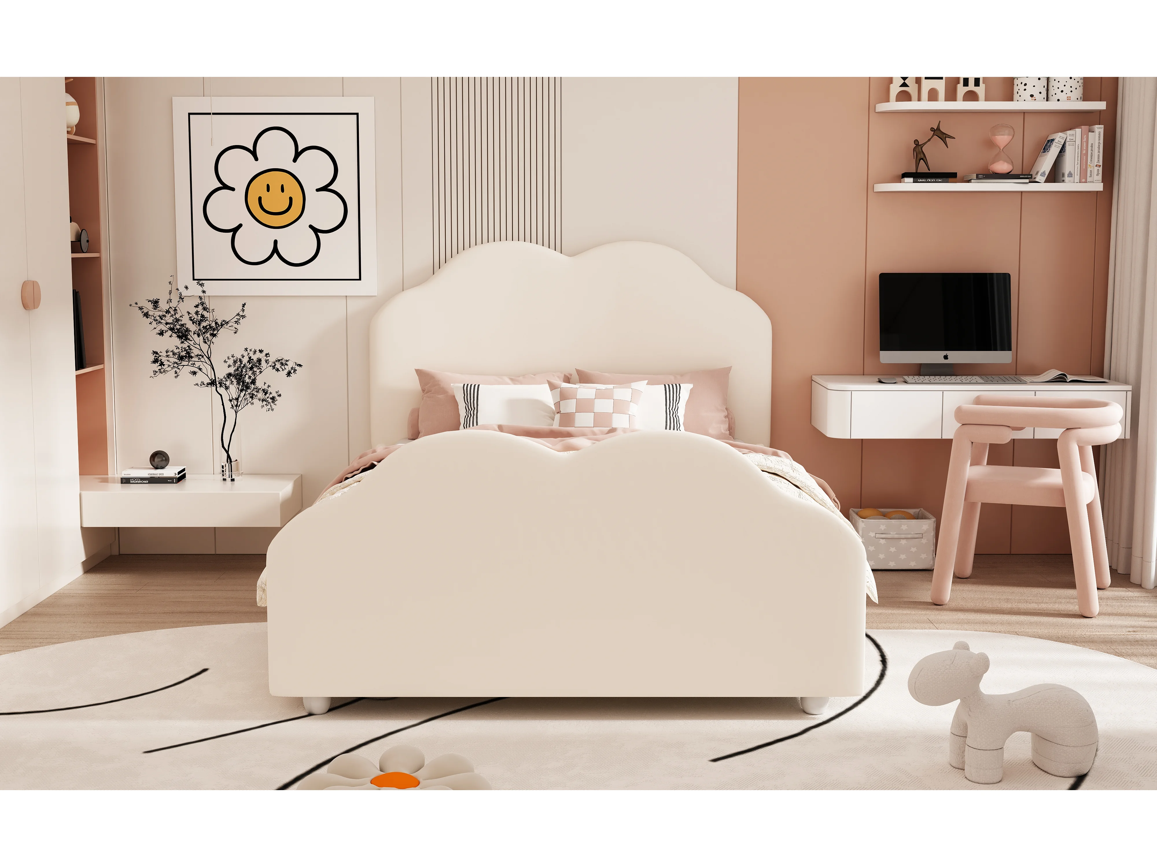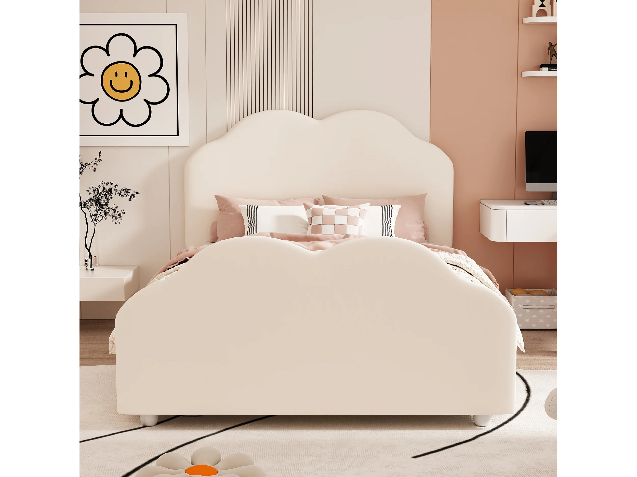 Lit rembourré 90x200 cm avec barrières hautes, tête et pied nuage, velours beige, lit enfant sécurisé