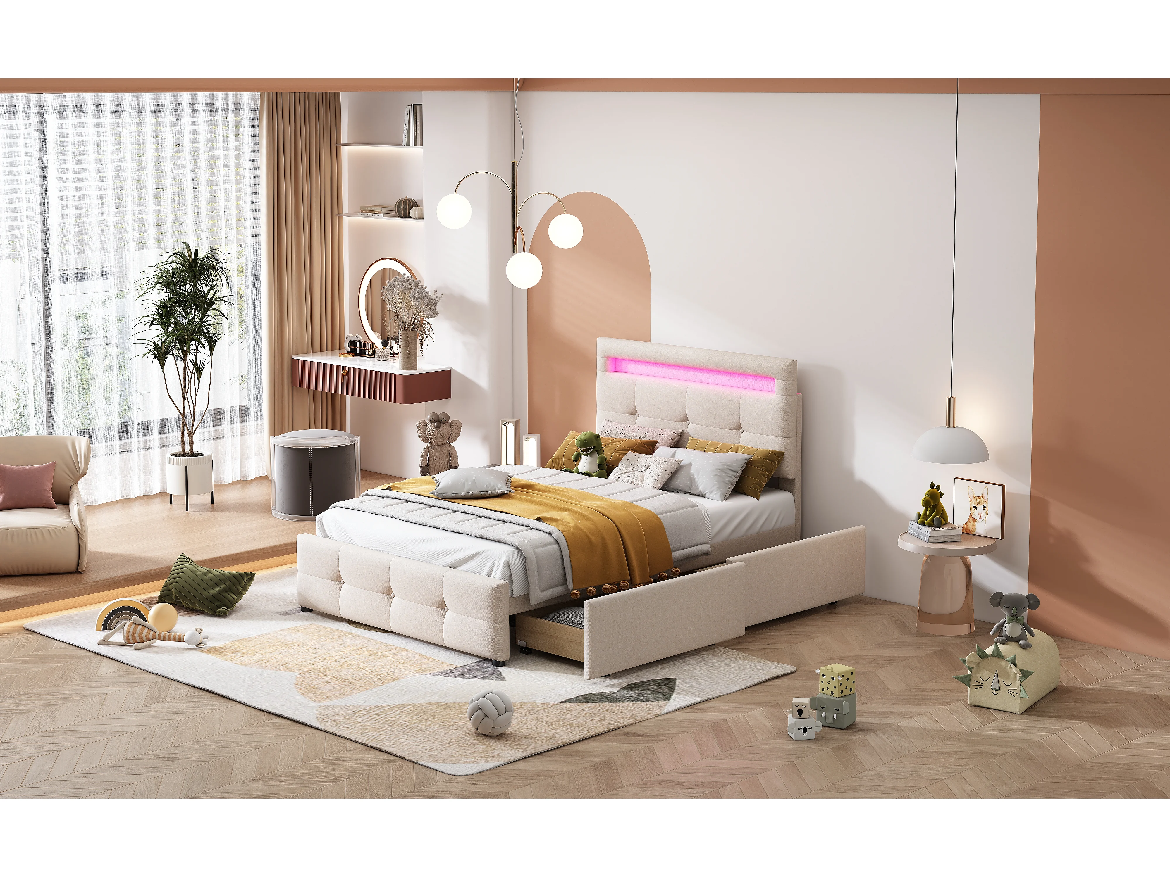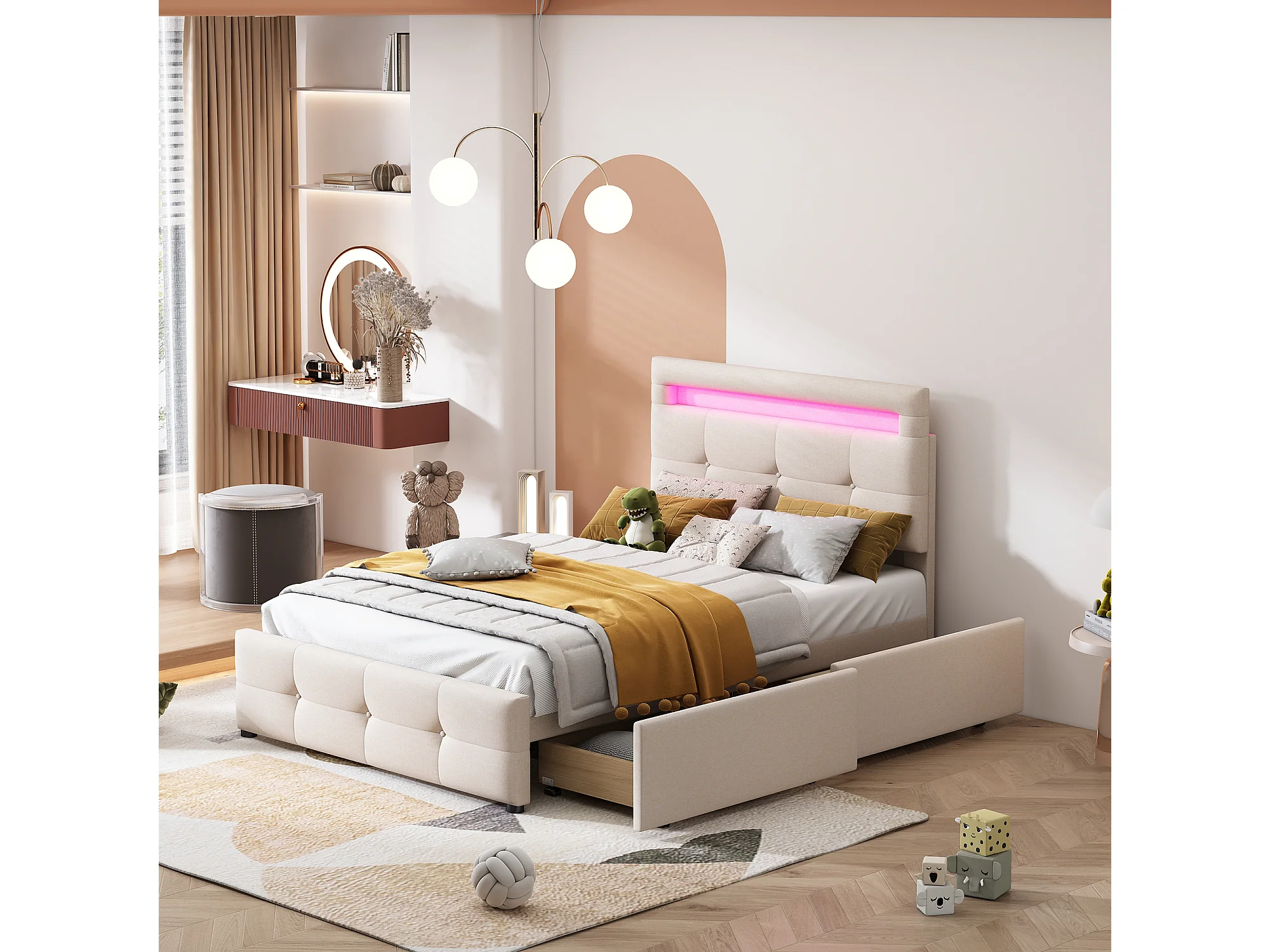Lit rembourré 90x200 cm avec LED, 2 tiroirs, velours lin beige, lit enfant multifonction, pratique