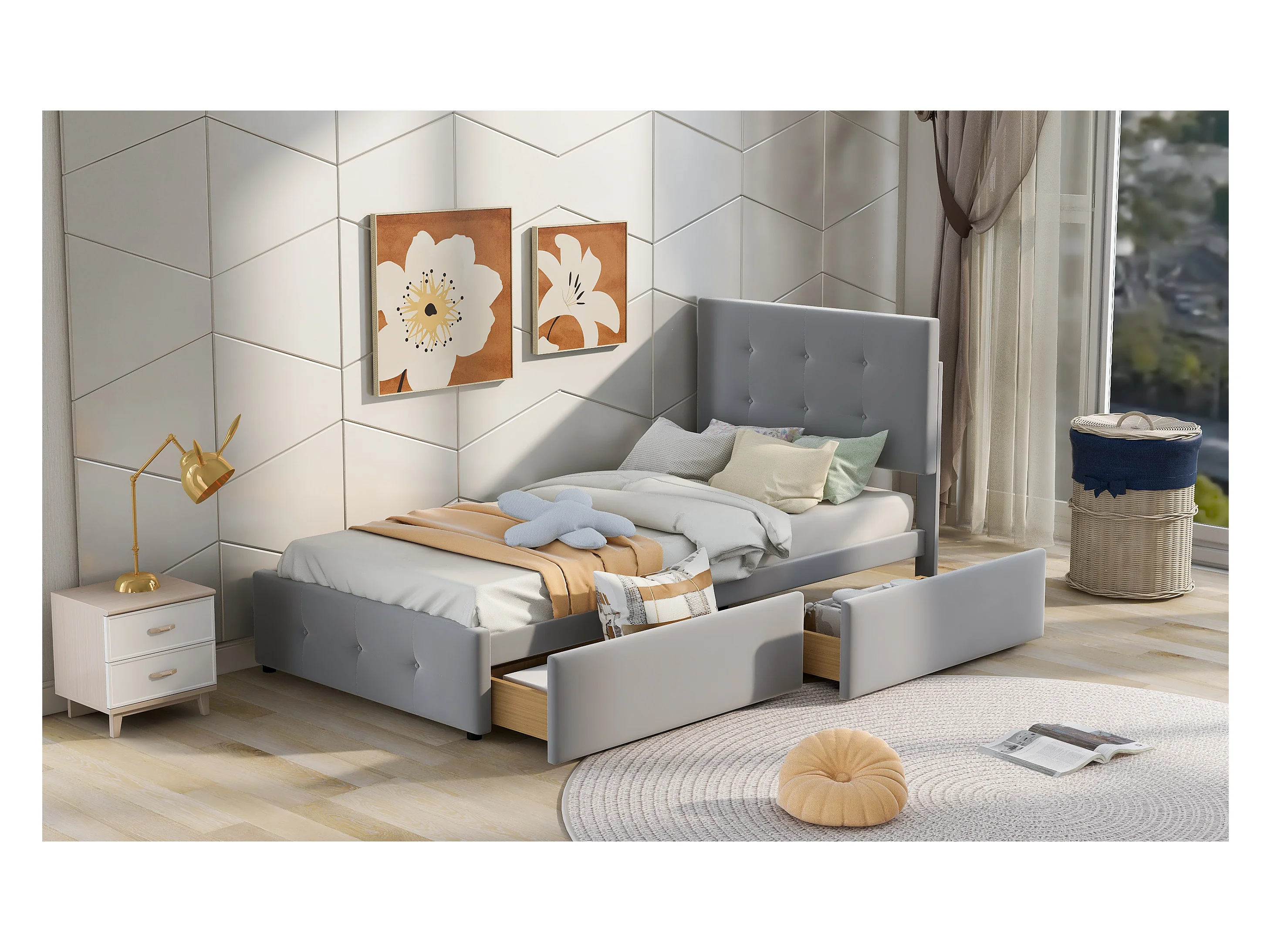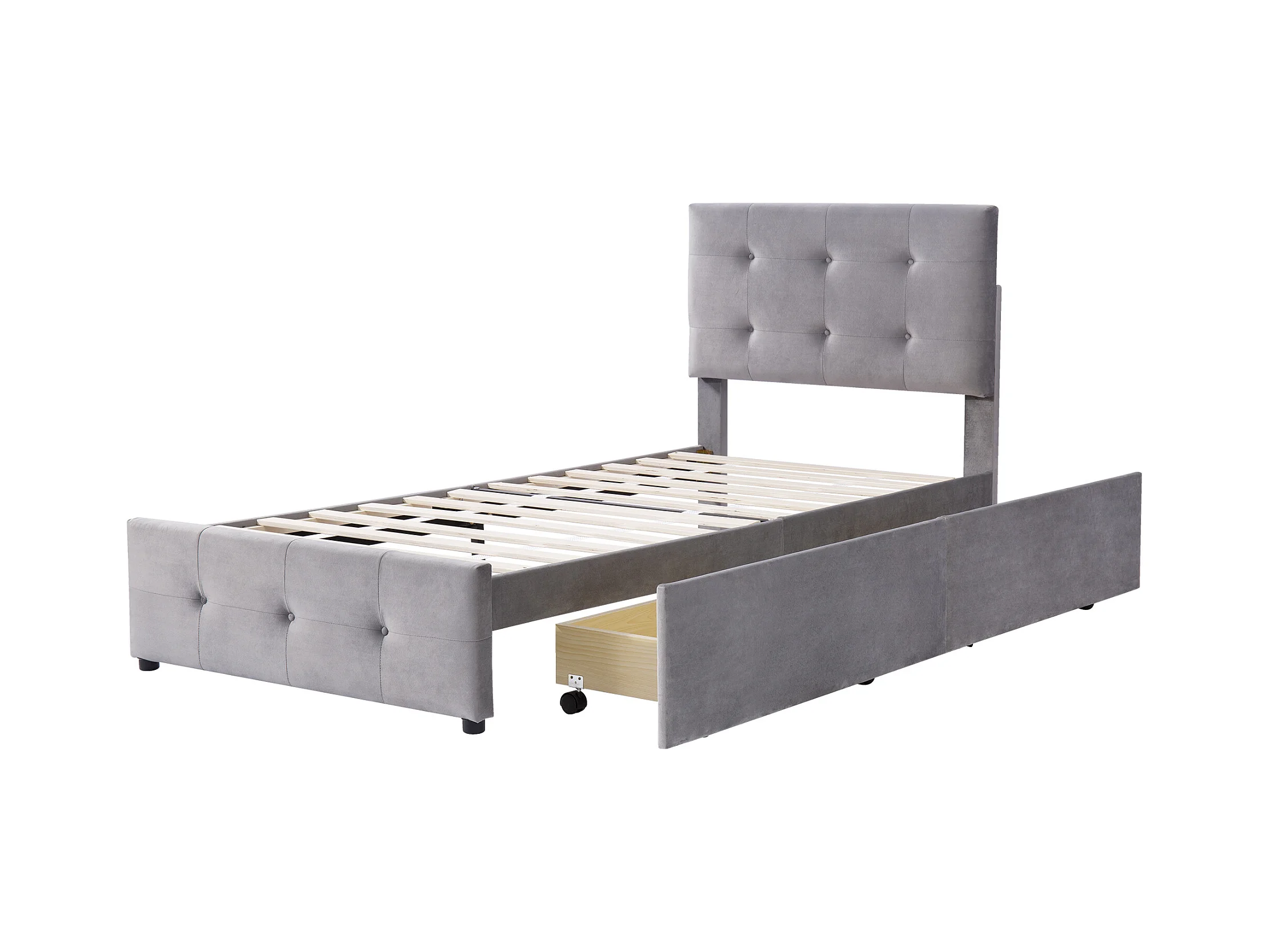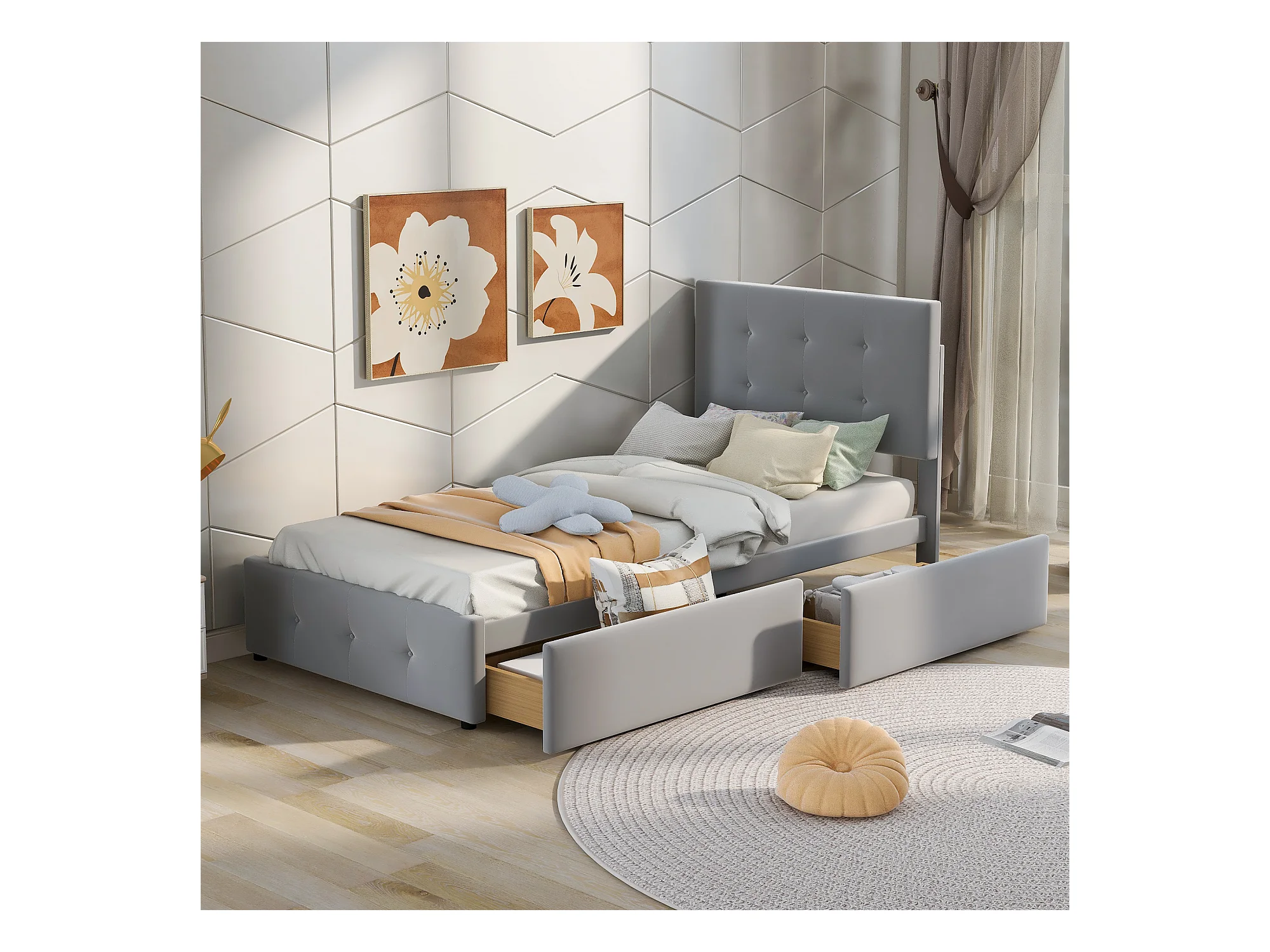 Lit rembourré 90x200 cm avec tiroirs et sommier, tête rembourrée, velours gris, lit enfant multifonction