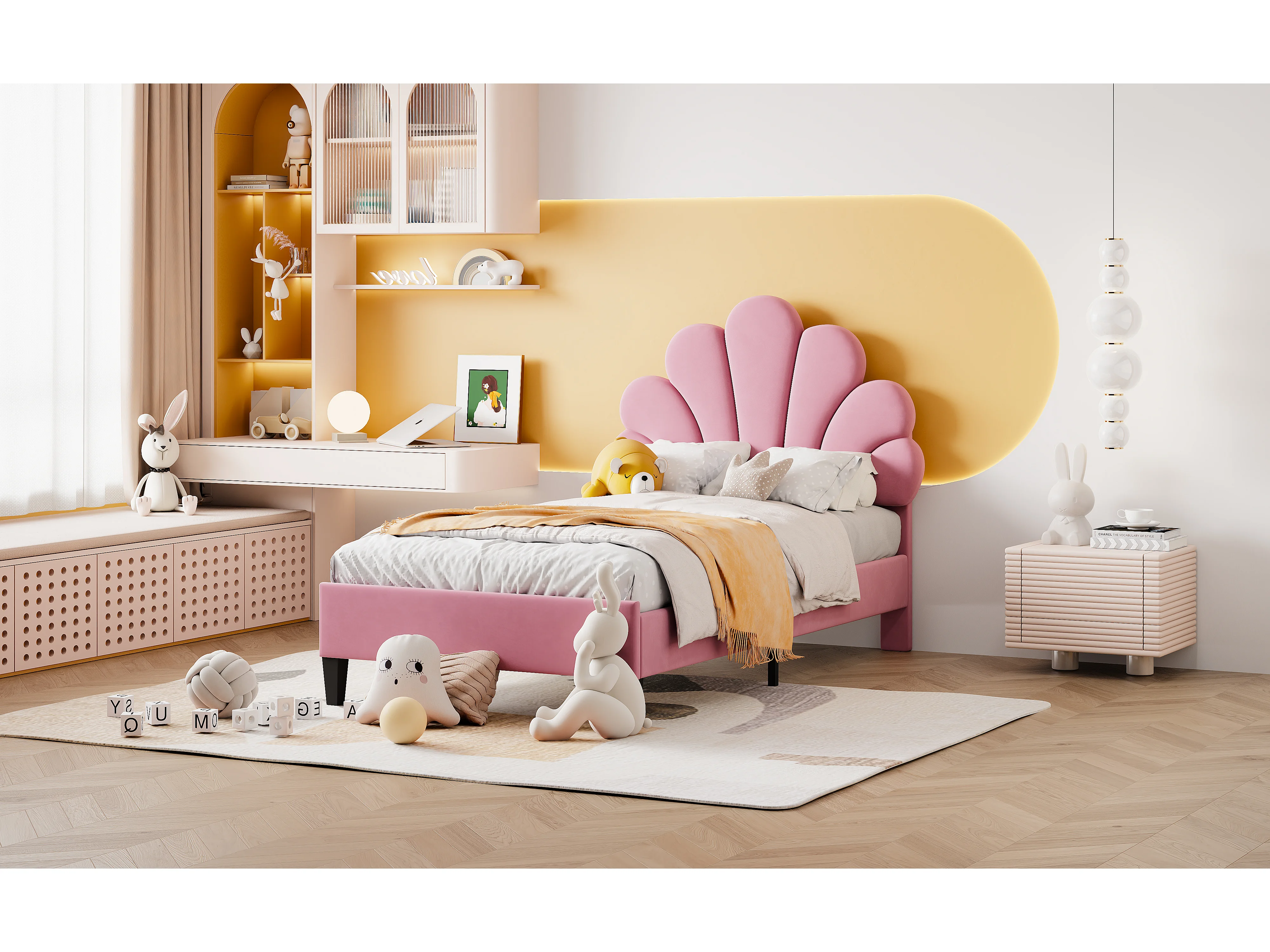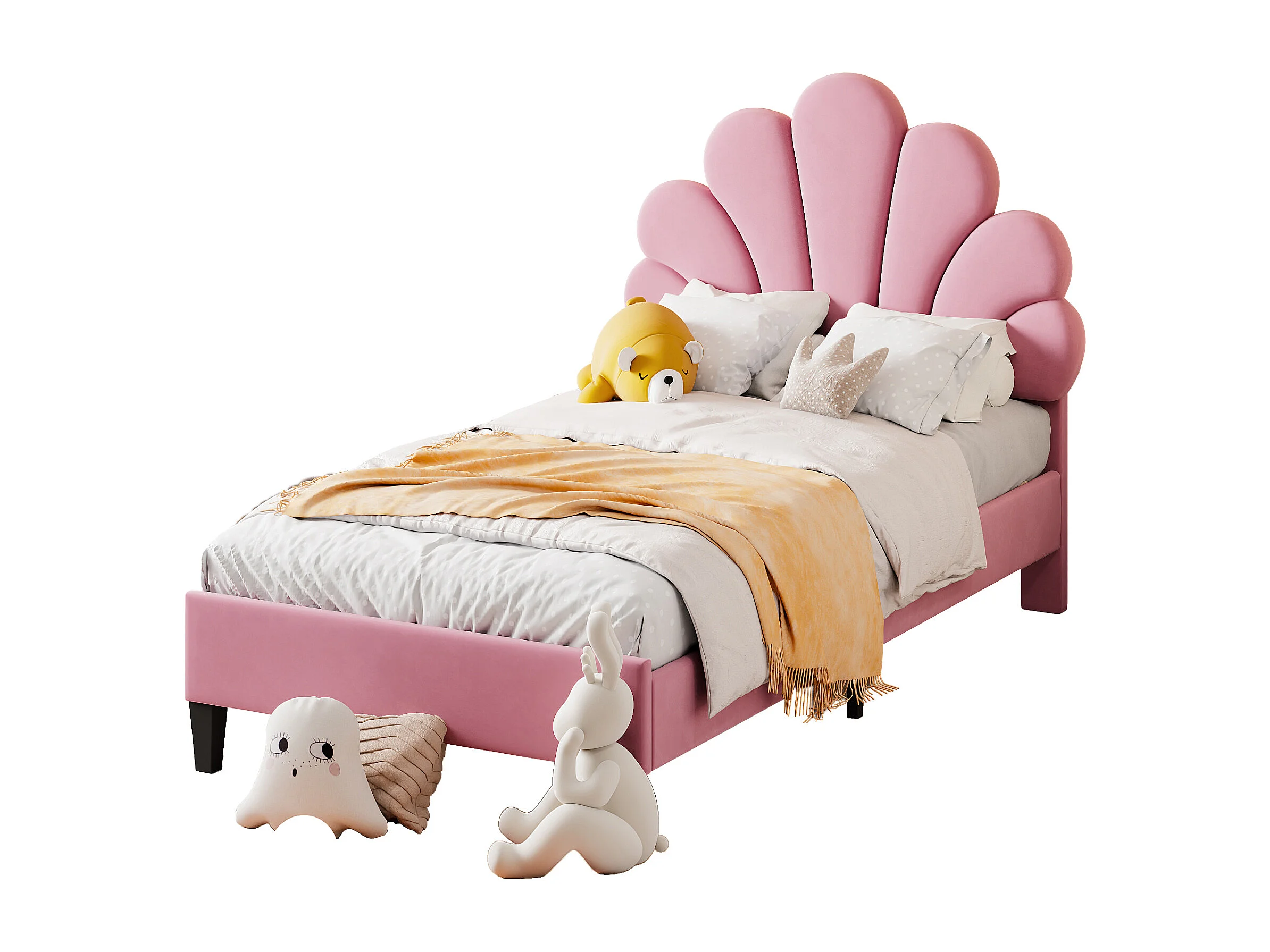 Lit rembourré 90x200 cm tête en forme de fleurs, sommier inclus, velours rose, lit fille multifonction