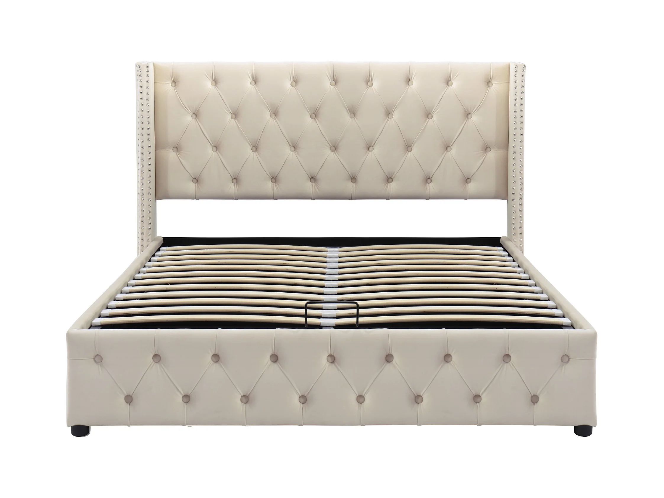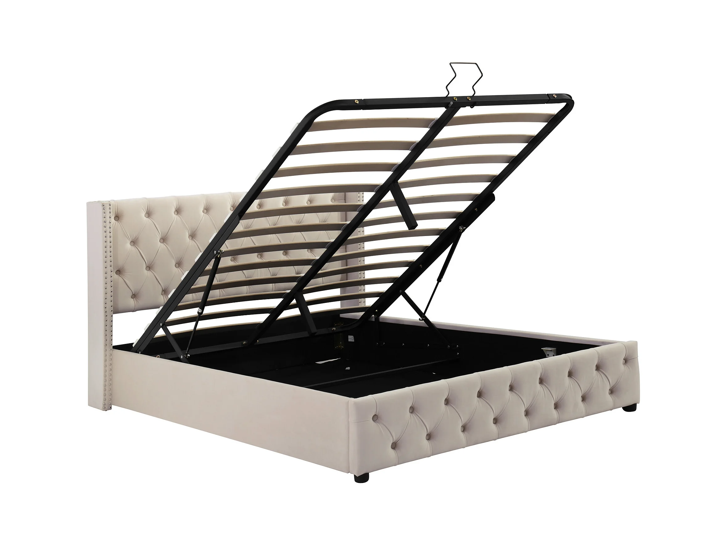 Lit rembourré beige 140x190 cm capitonné avec coffre et système hydraulique, style chic et pratique pour chambre