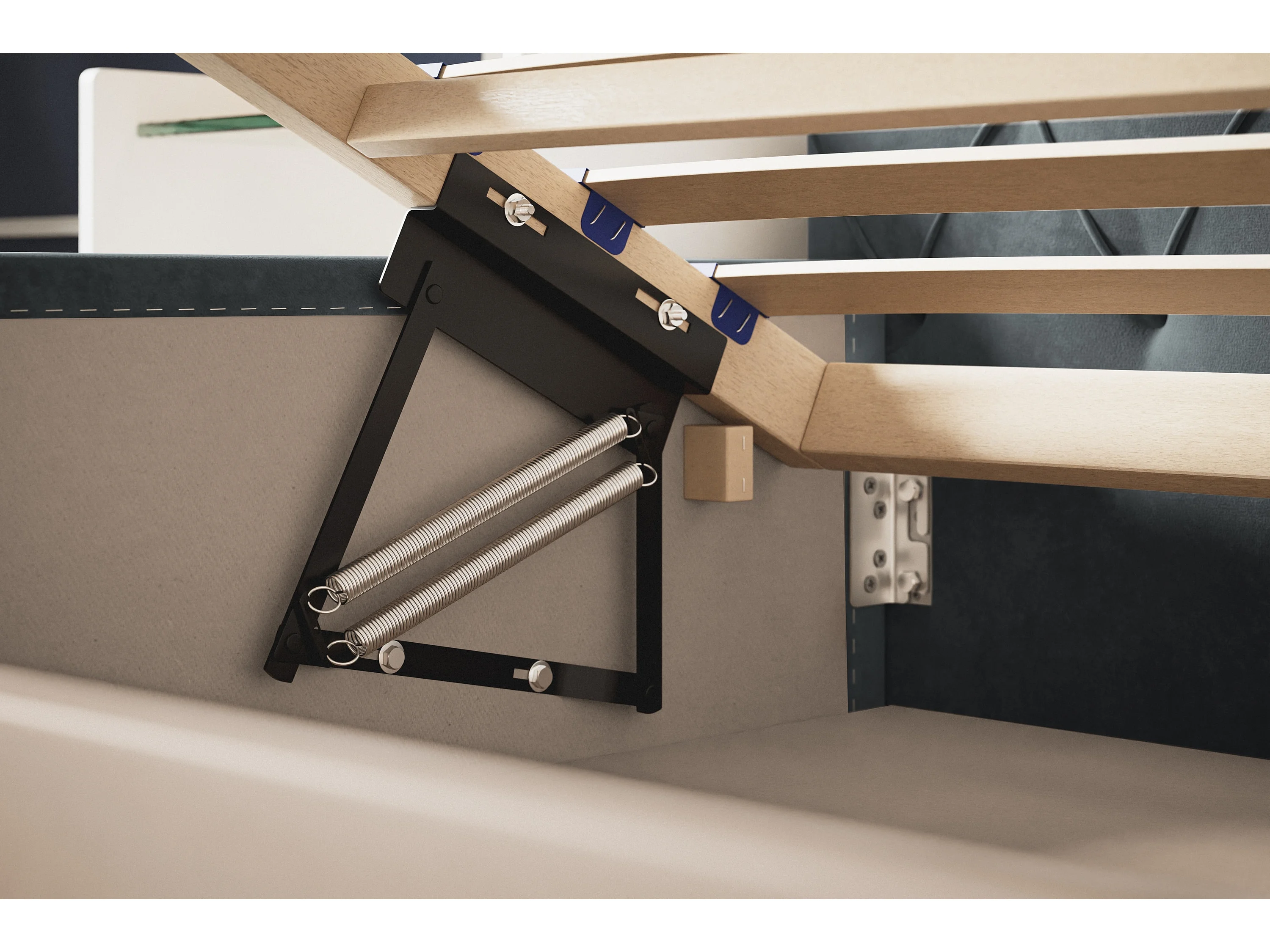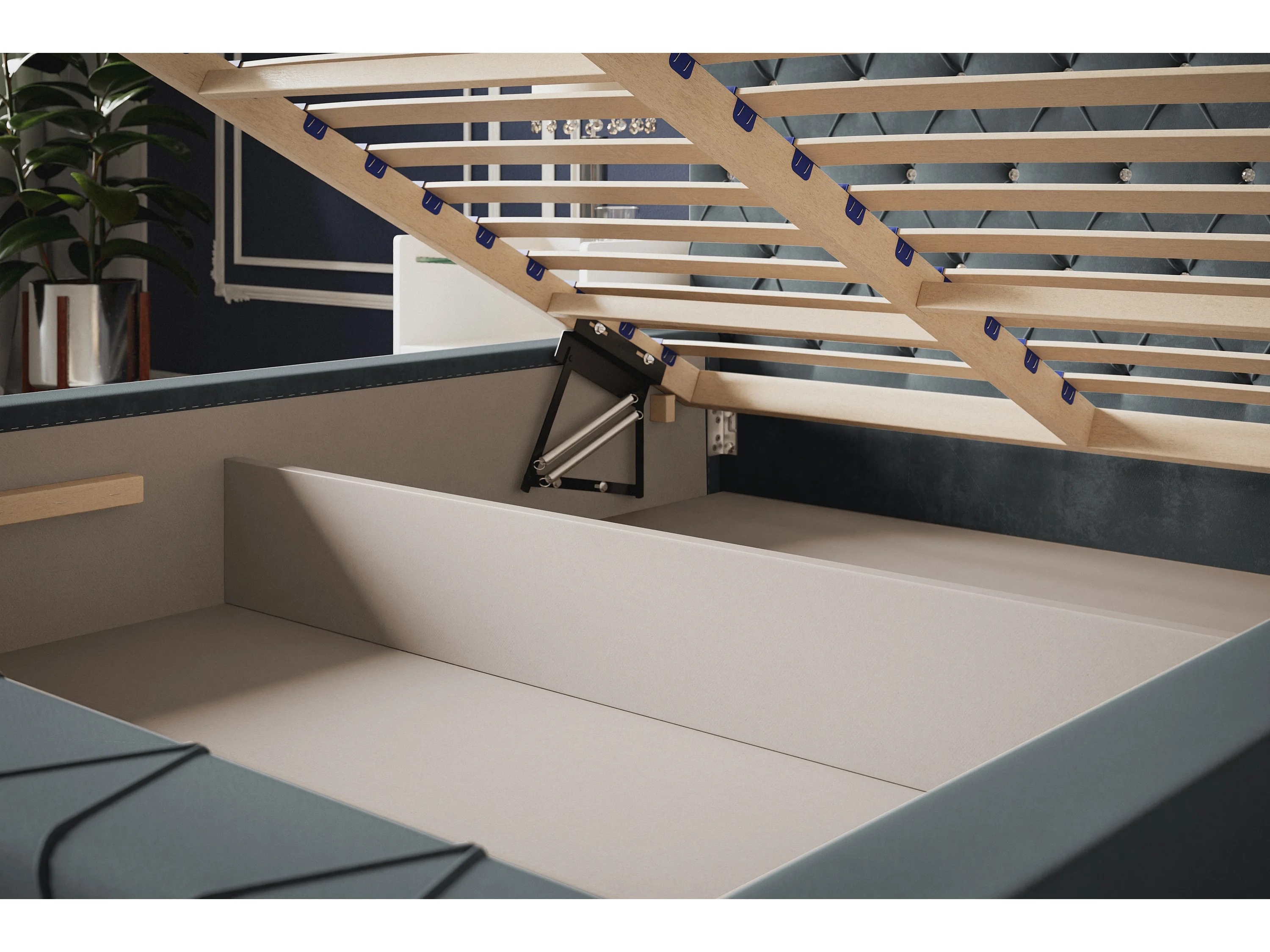 Lit rembourré Berlin avec tête de lit, 160x200 cm, lit double avec coffre de rangement et sommier à lattes en bois, tissu velours, couleur : bleu foncé