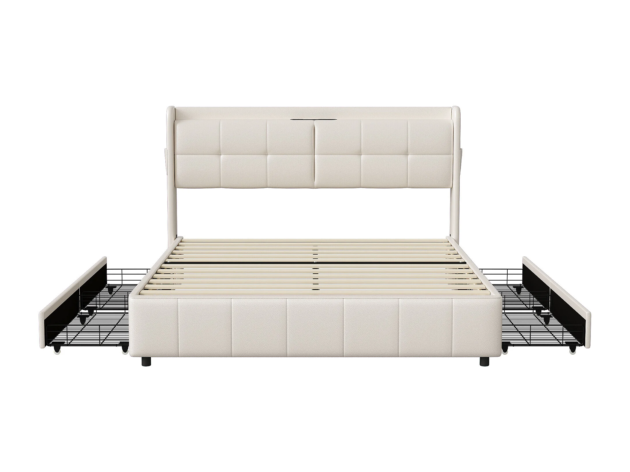 Lit rembourré, cadre de lit rembourré avec tête de lit en cuir PU blanc, lit hydraulique 140*200cm 160cm*200cm avec 4 tiroirs, espace de rangement, sans matelas