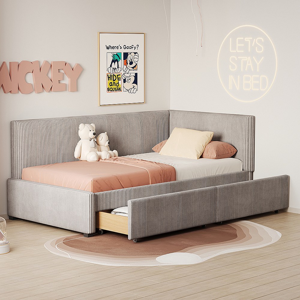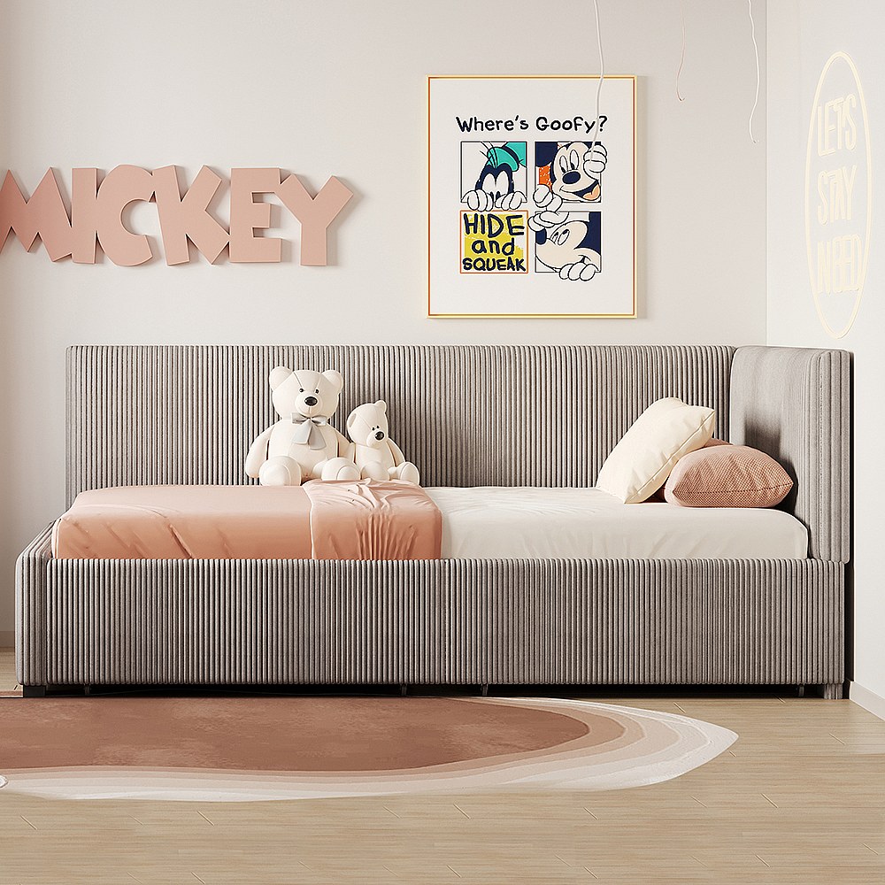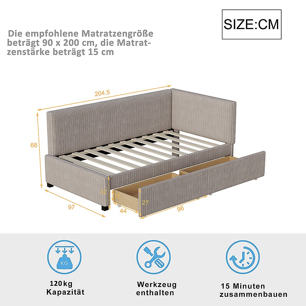 Lit rembourré, canapé-lit 90*200 cm, avec 2 grands tiroirs de rangement, tissu velours doux pour la peau, gris