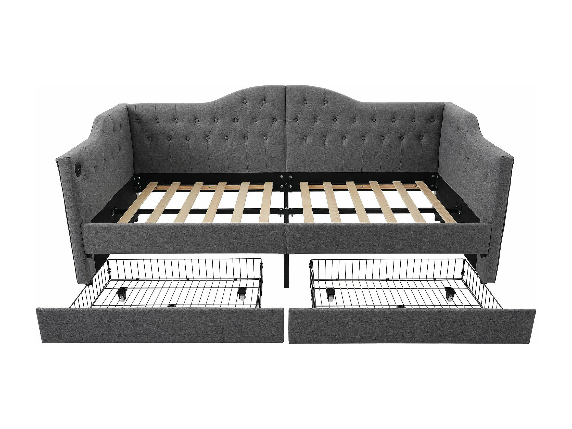 Lit rembourré, canapé-lit, lit de rangement, cadre de lit avec fonction de recharge USB Type C et 2 tiroirs 90x190 cm, lin gris (matelas non inclus)