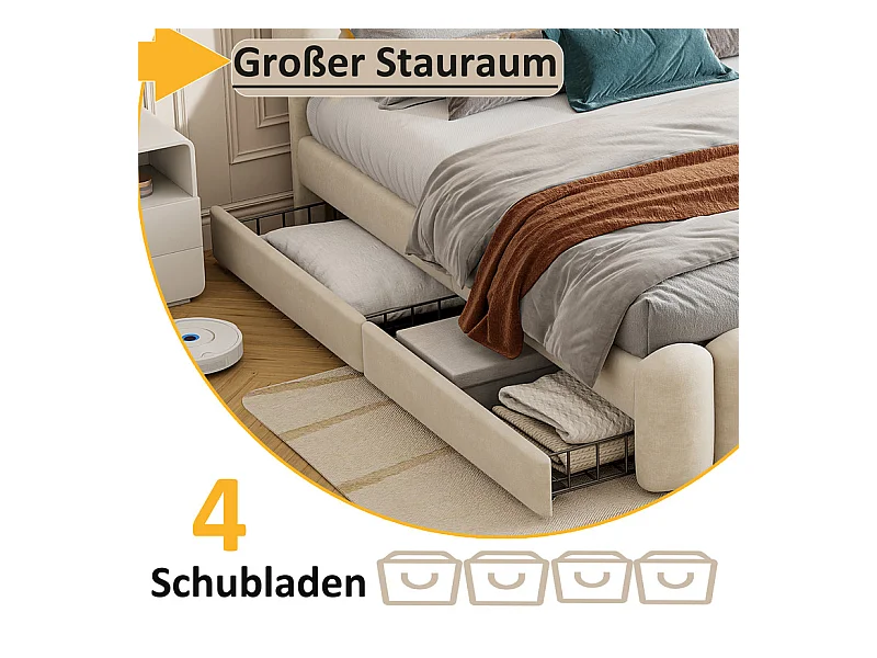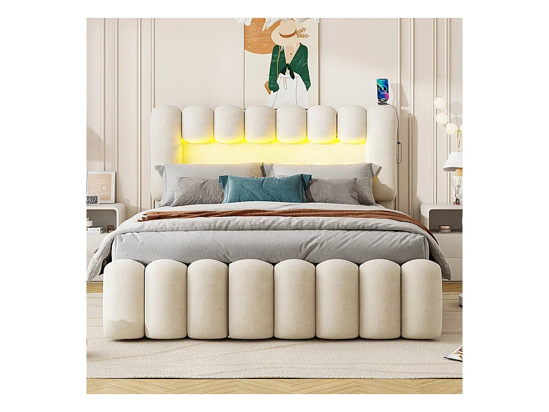 Lit rembourré en velours beige - 160x200cm - 4 tiroirs + LED + USB + Enceintes - tête de lit réglables