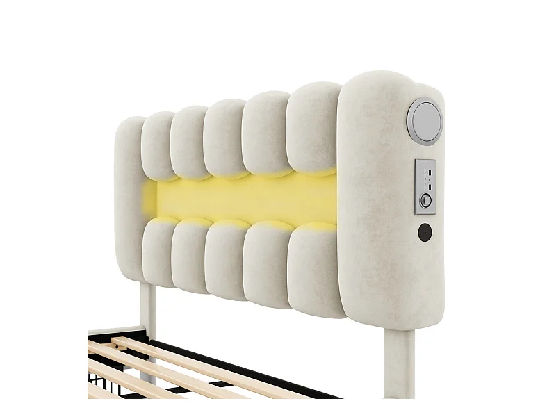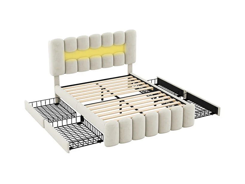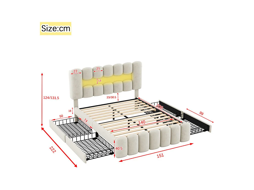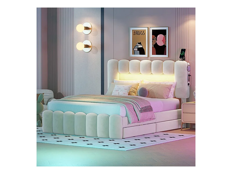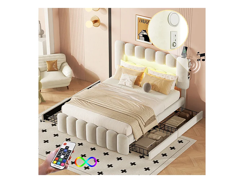 Lit rembourré en velours gris - 140x200cm - 4 tiroirs + LED + USB + Enceintes - tête de lit réglables