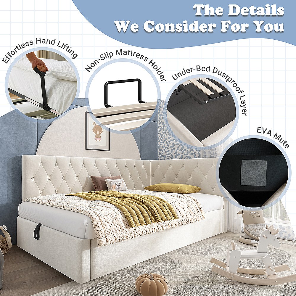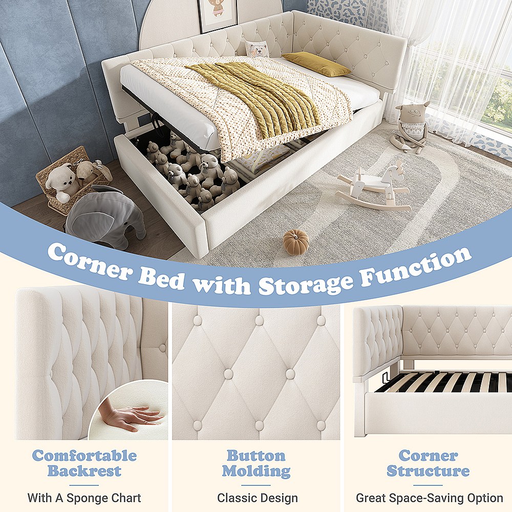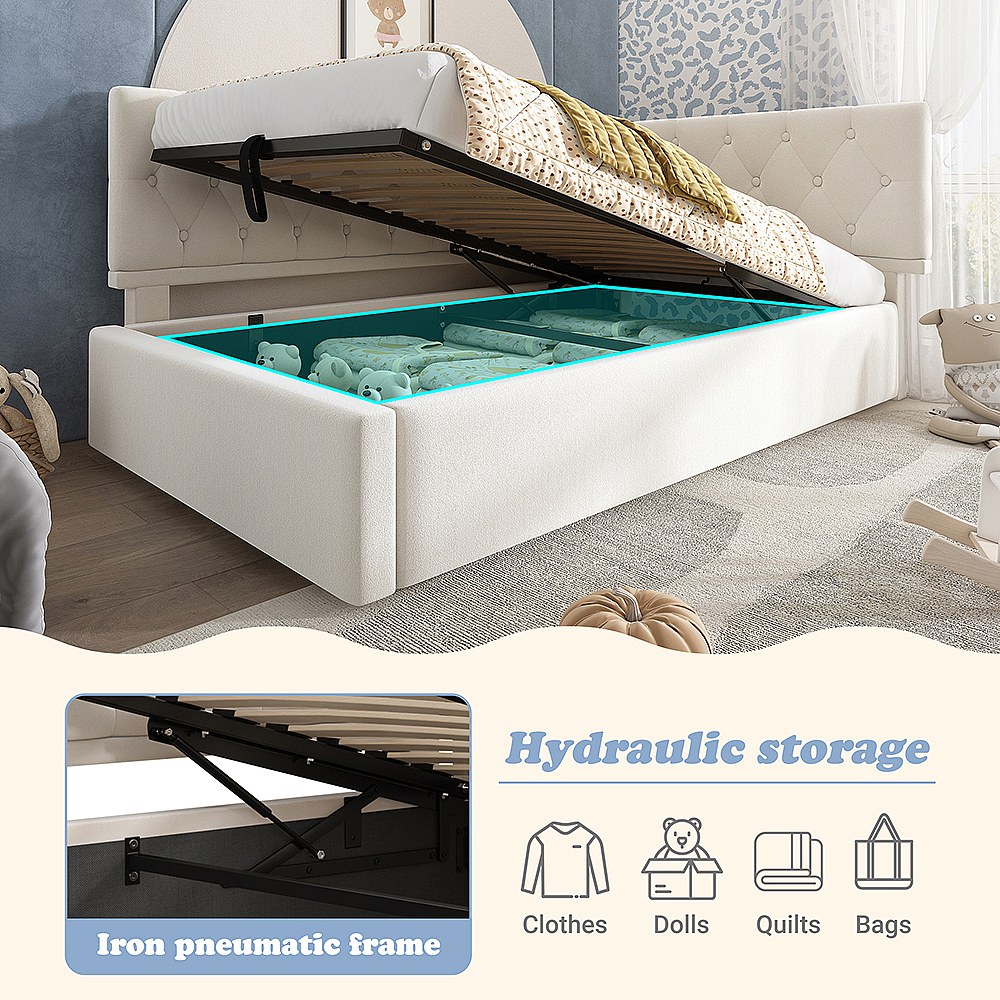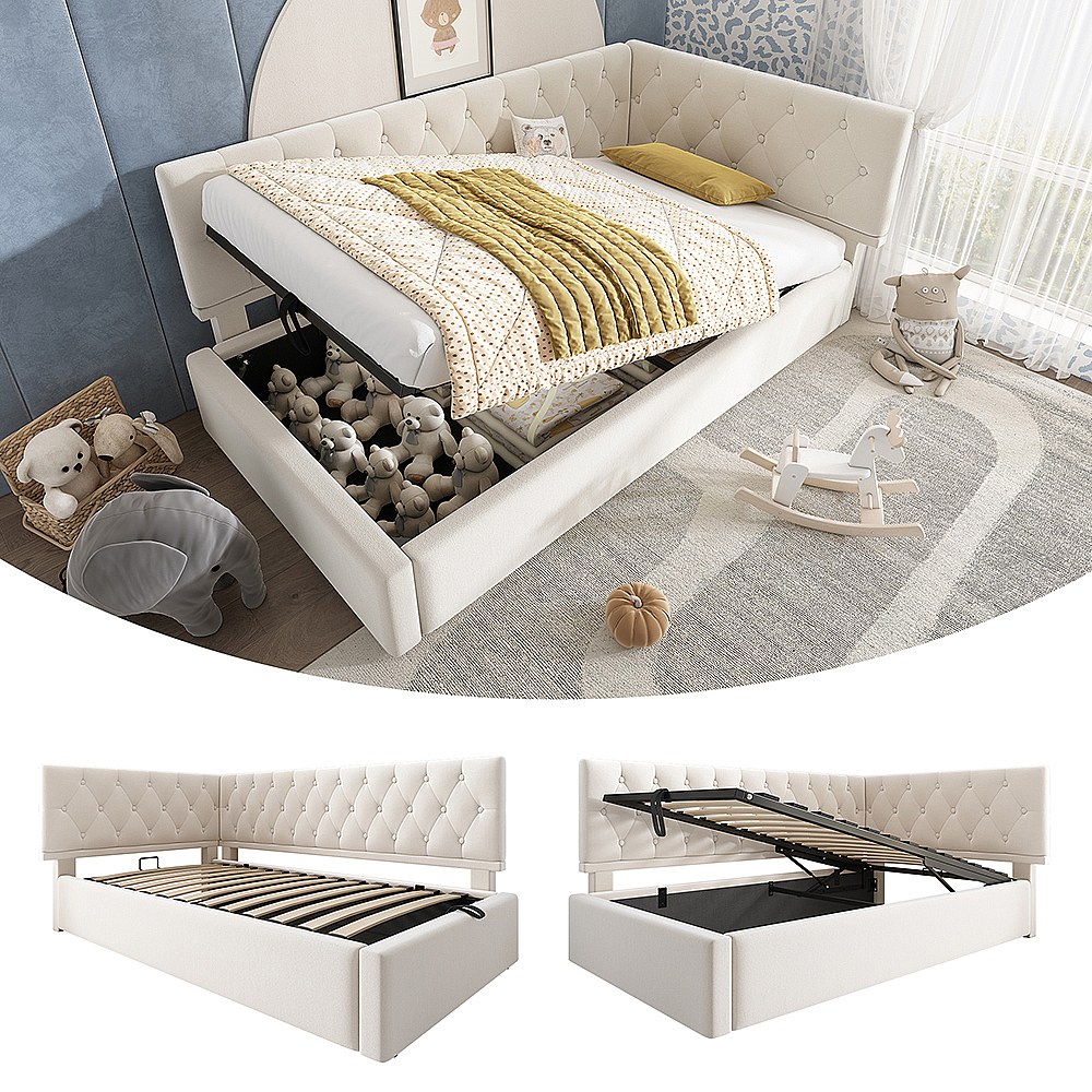 Lit rembourré, lit de repos 90x200cm, canapé convertible avec rangement hydraulique, lit enfant, lit jeune beige, sans matelas.