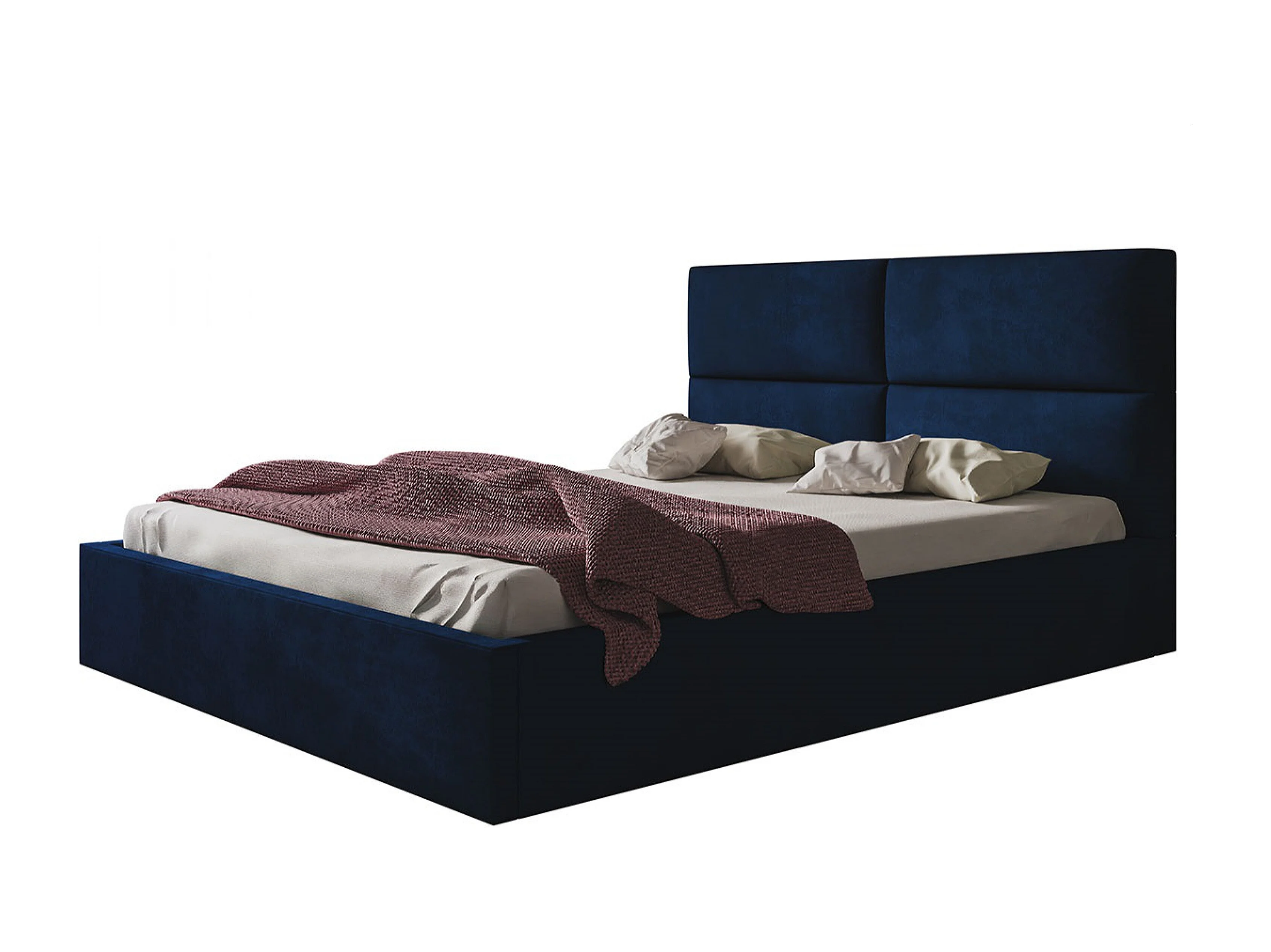 Lit rembourré LIZBONA SLIM avec tête de lit, 140 x 200 cm, lit double avec coffre de rangement et sommier à lattes en bois, couleur : bleu foncé, tissu velours
