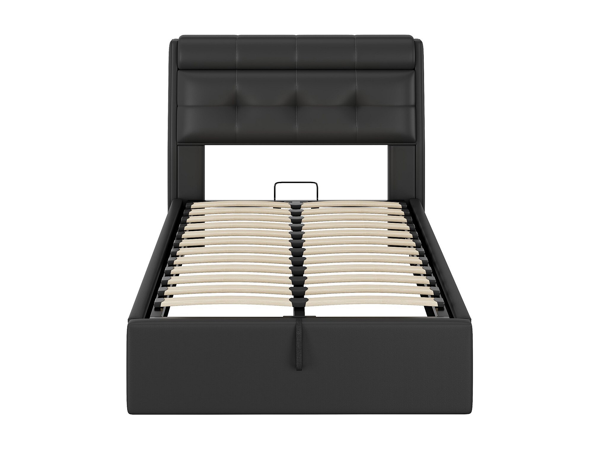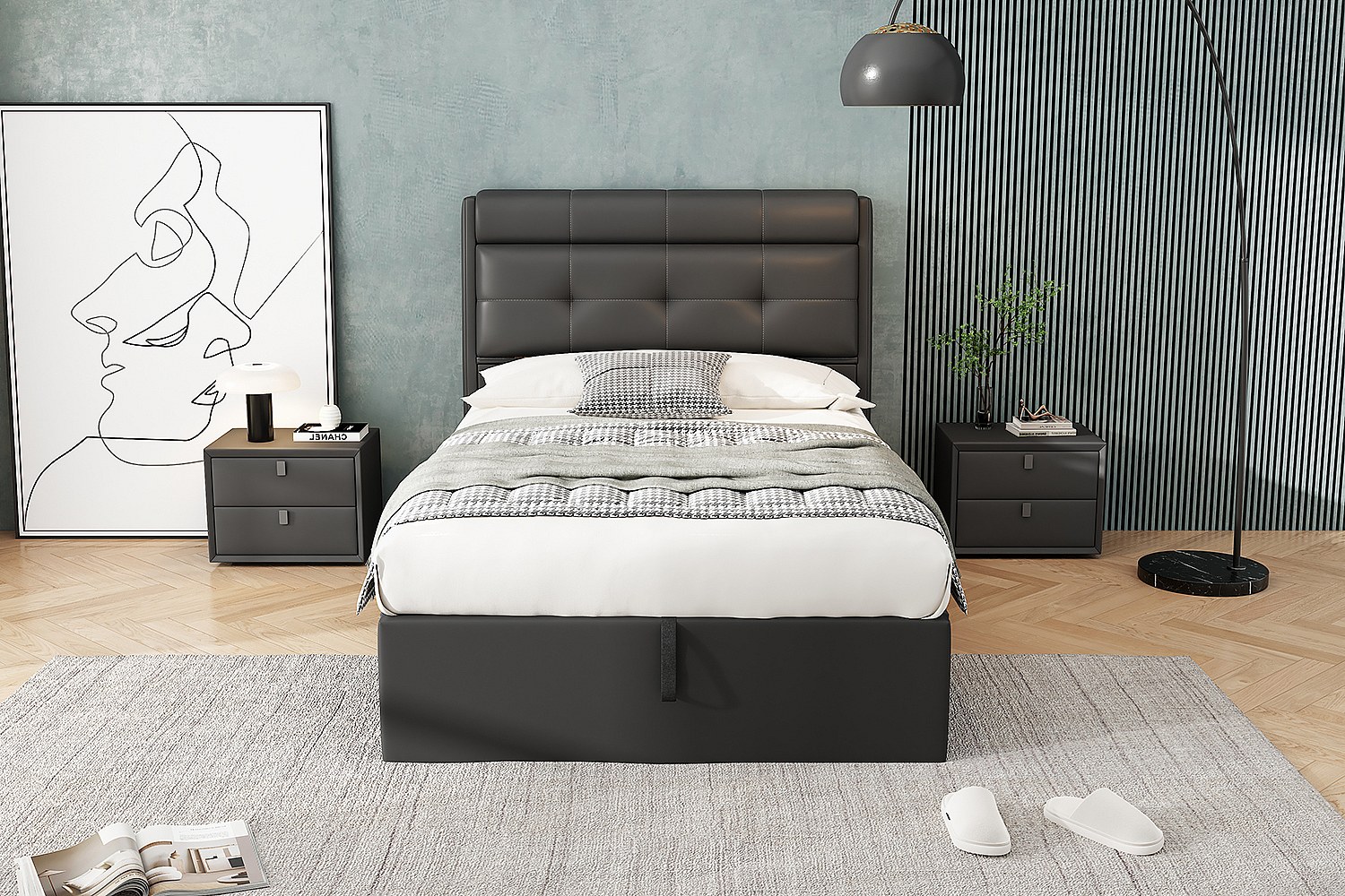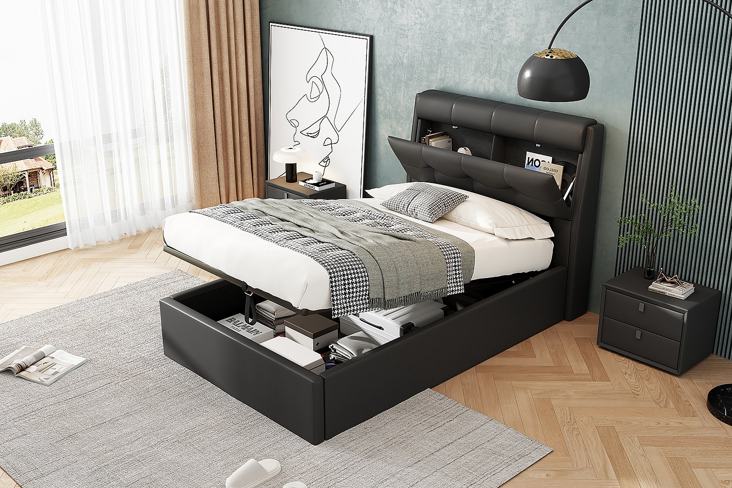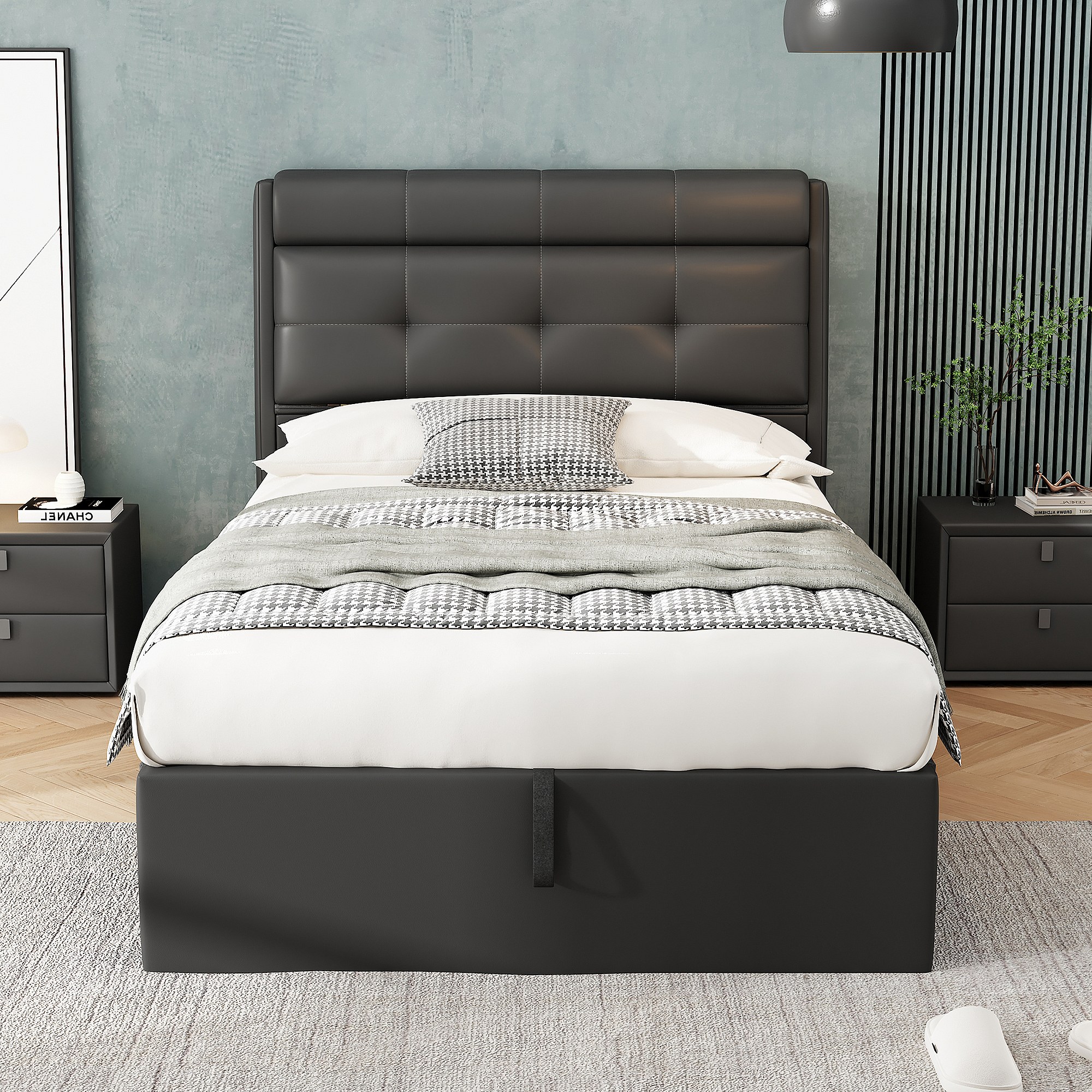 Lit rembourré moderne 90×200 cm, noir, avec espace de rangement hydraulique et tête de lit dissimulée