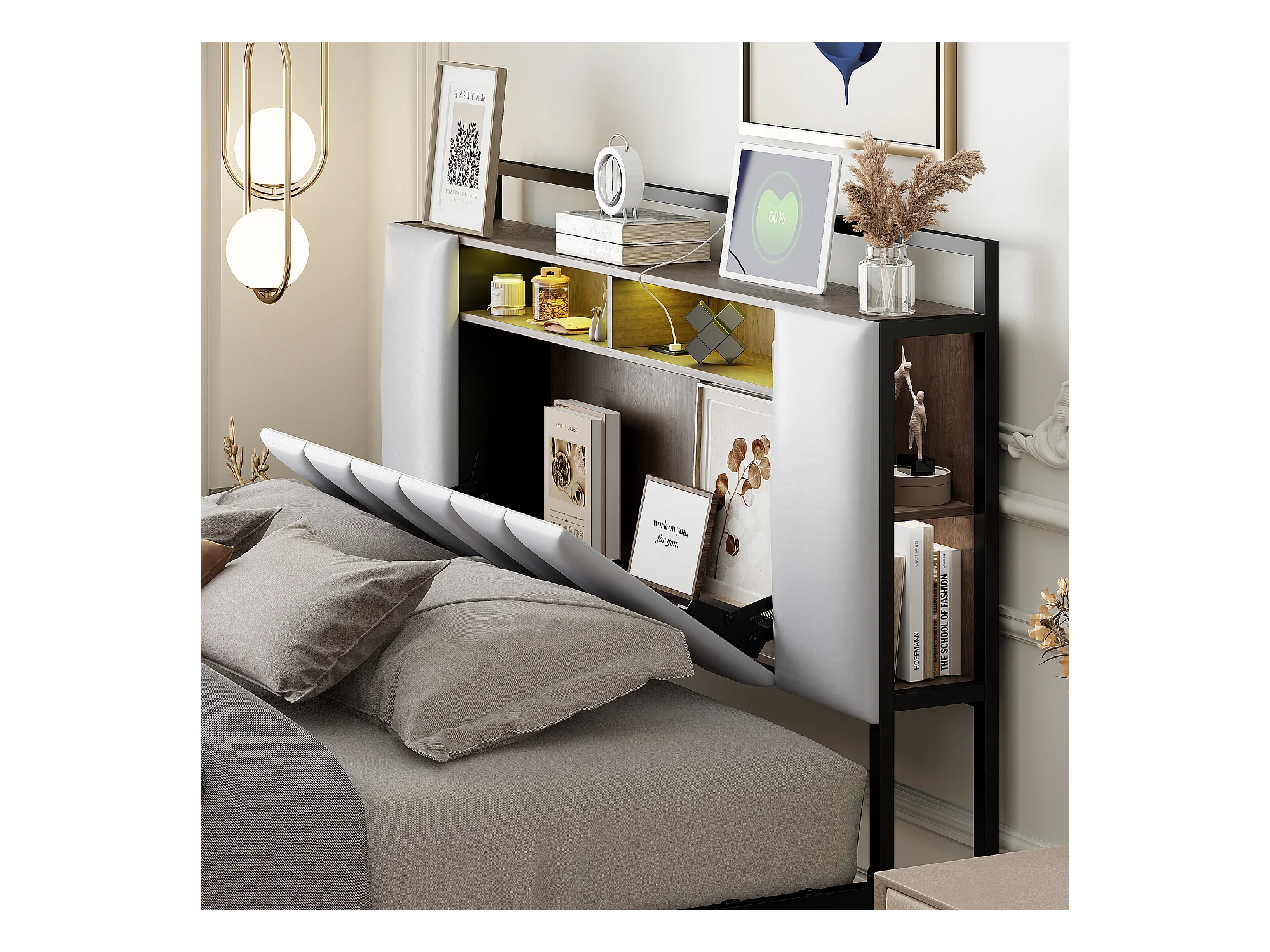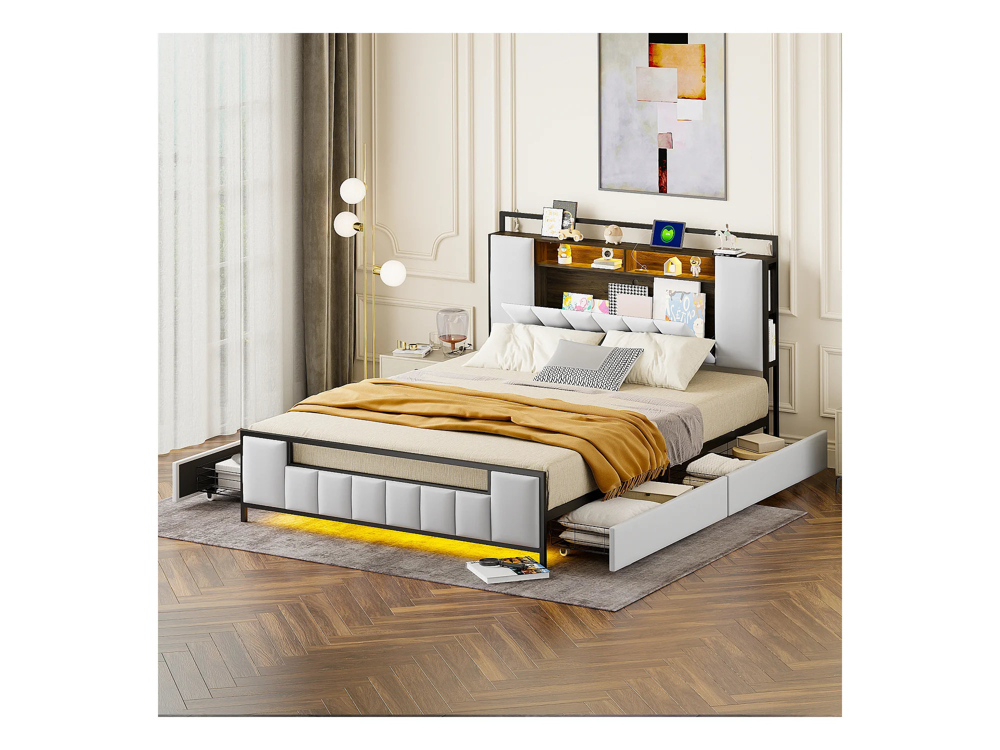 Lit rembourré multifonction 160x200 cm, cadre en fer massif, LED et prise USB, avec tiroirs, simili cuir blanc (219x160x119.5 cm)