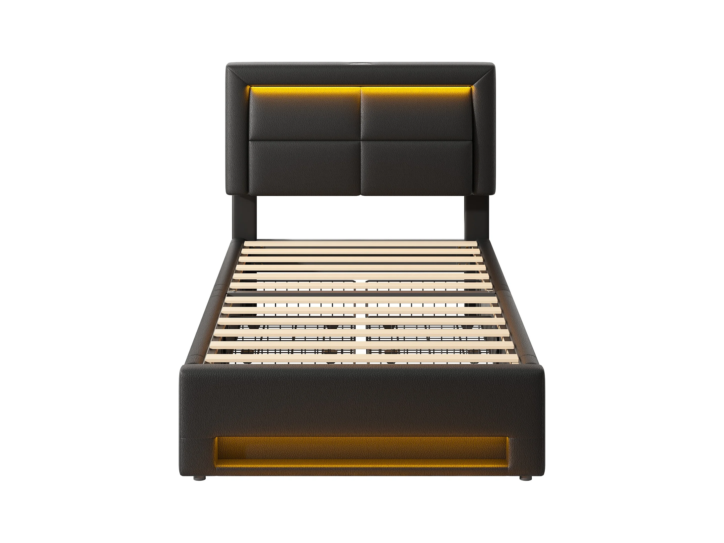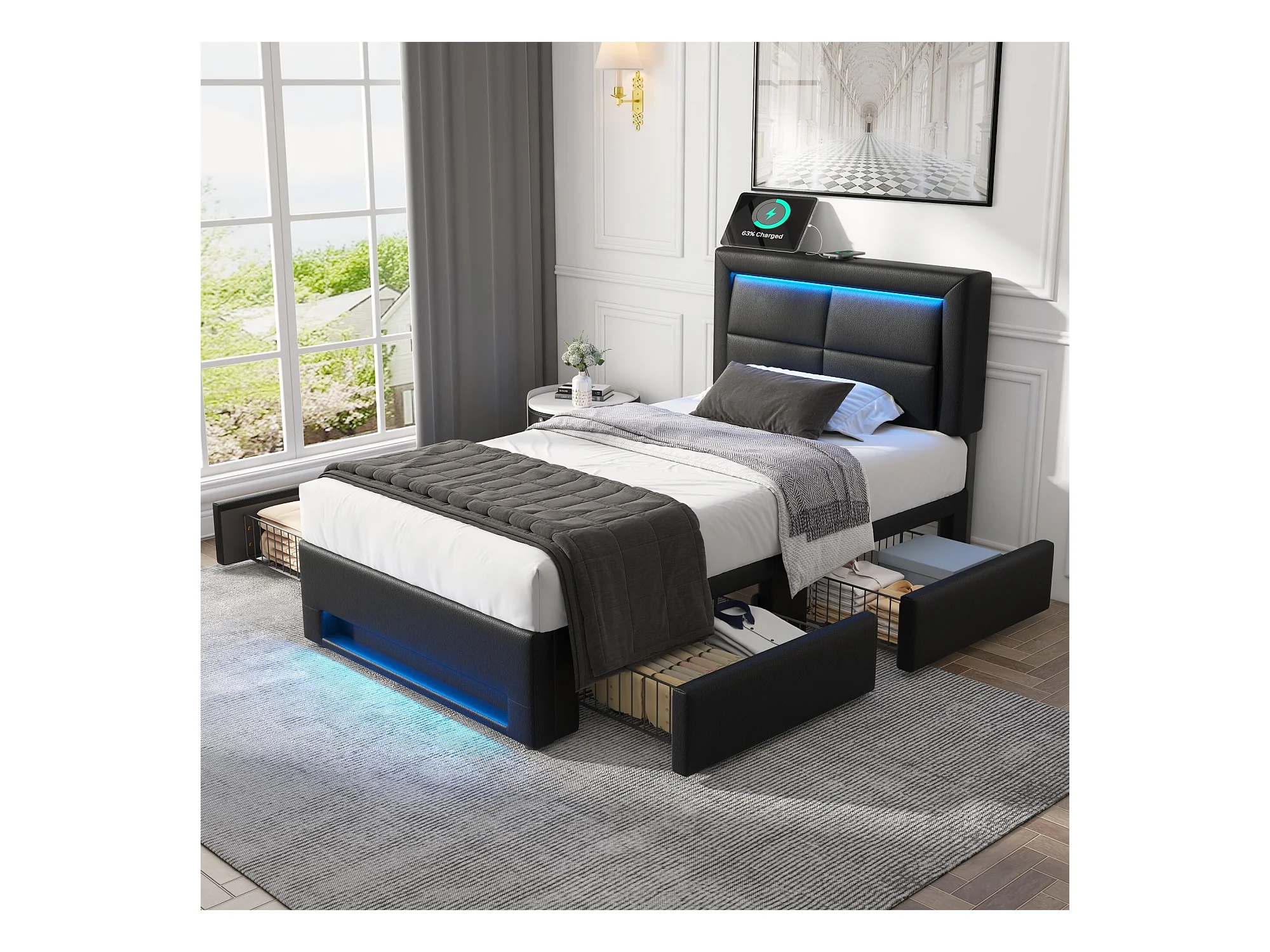 Lit simple 90 x 200 cm - Lit enfant avec quatre tiroirs et éclairage LED - port USB - PU noir - matelas non inclus