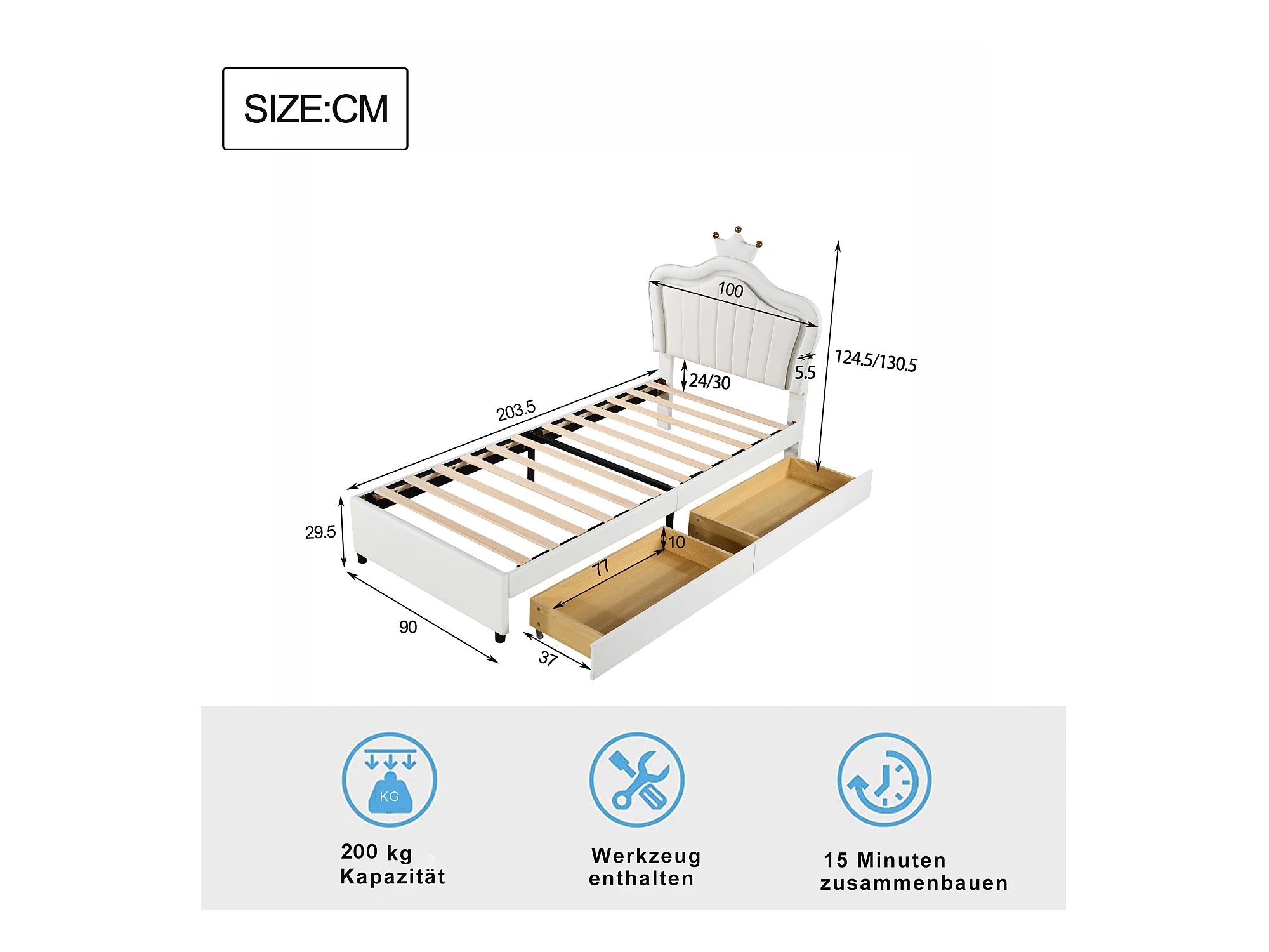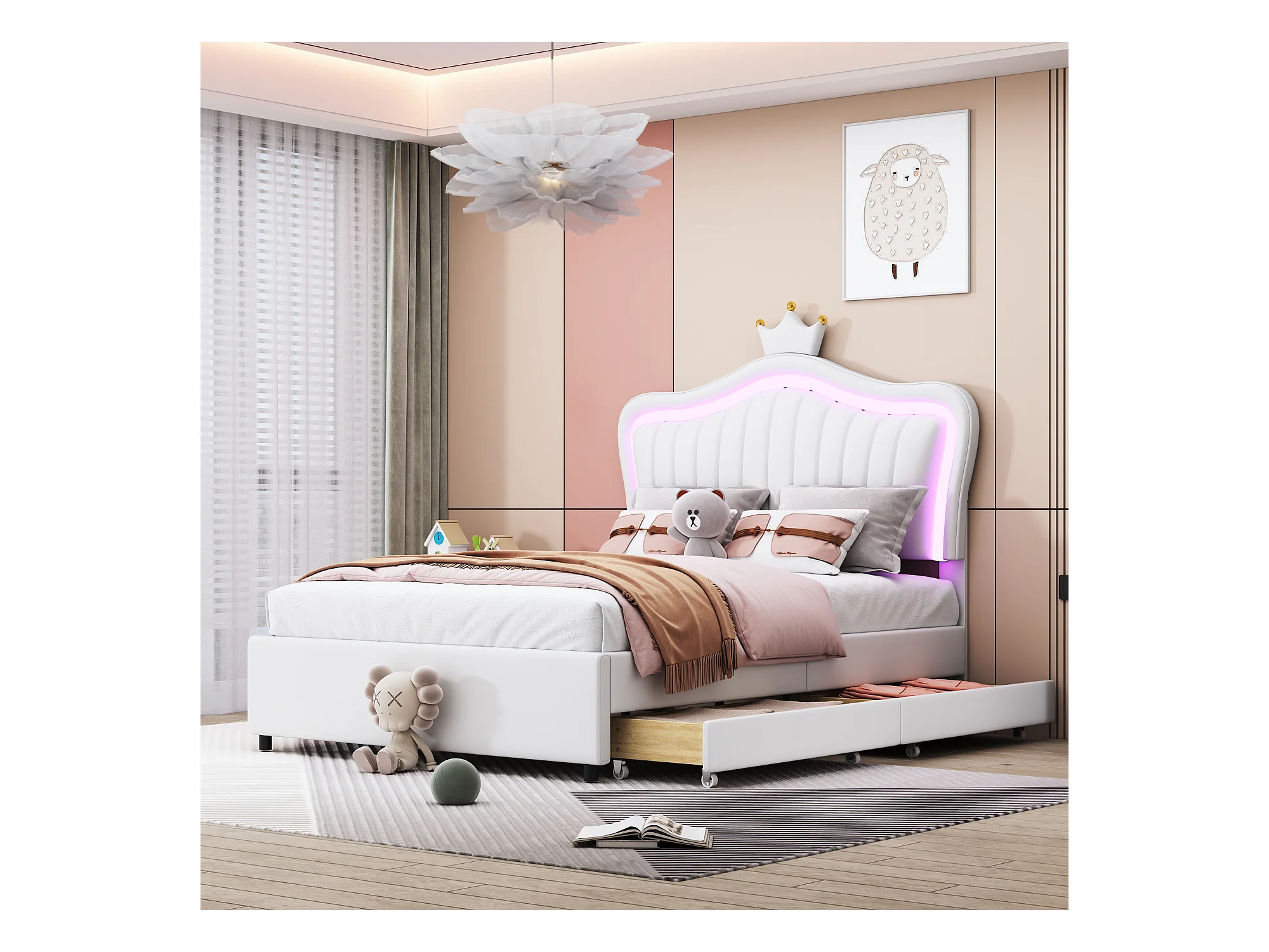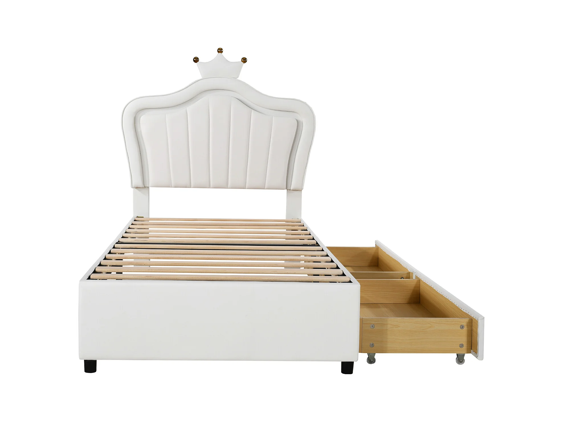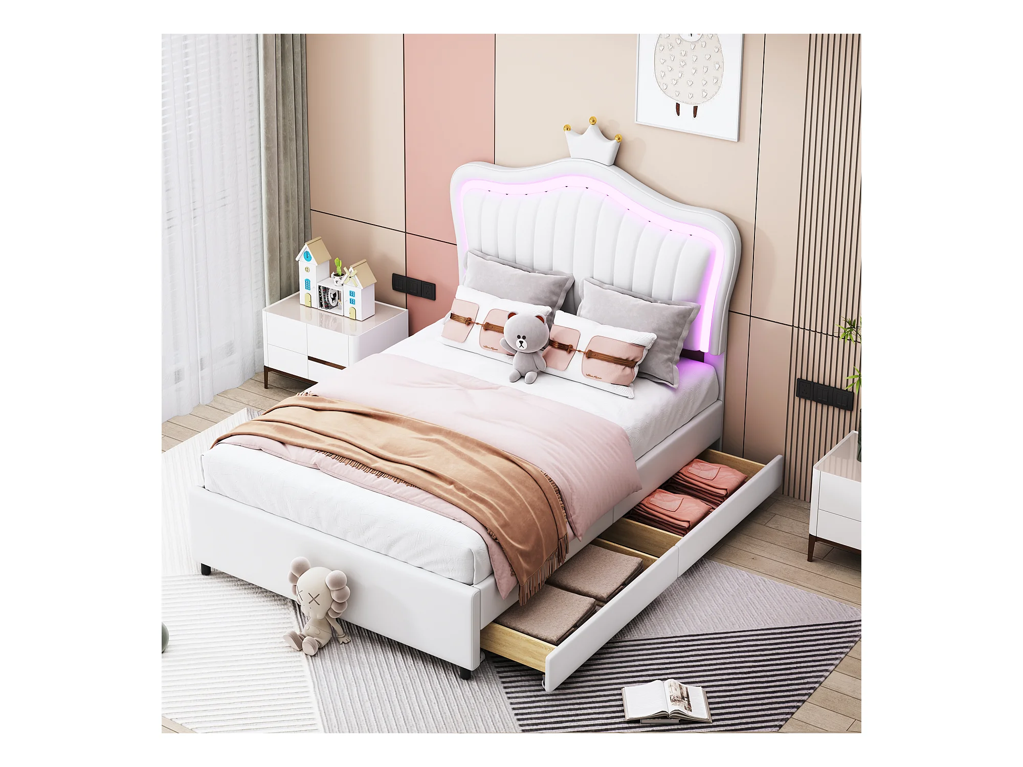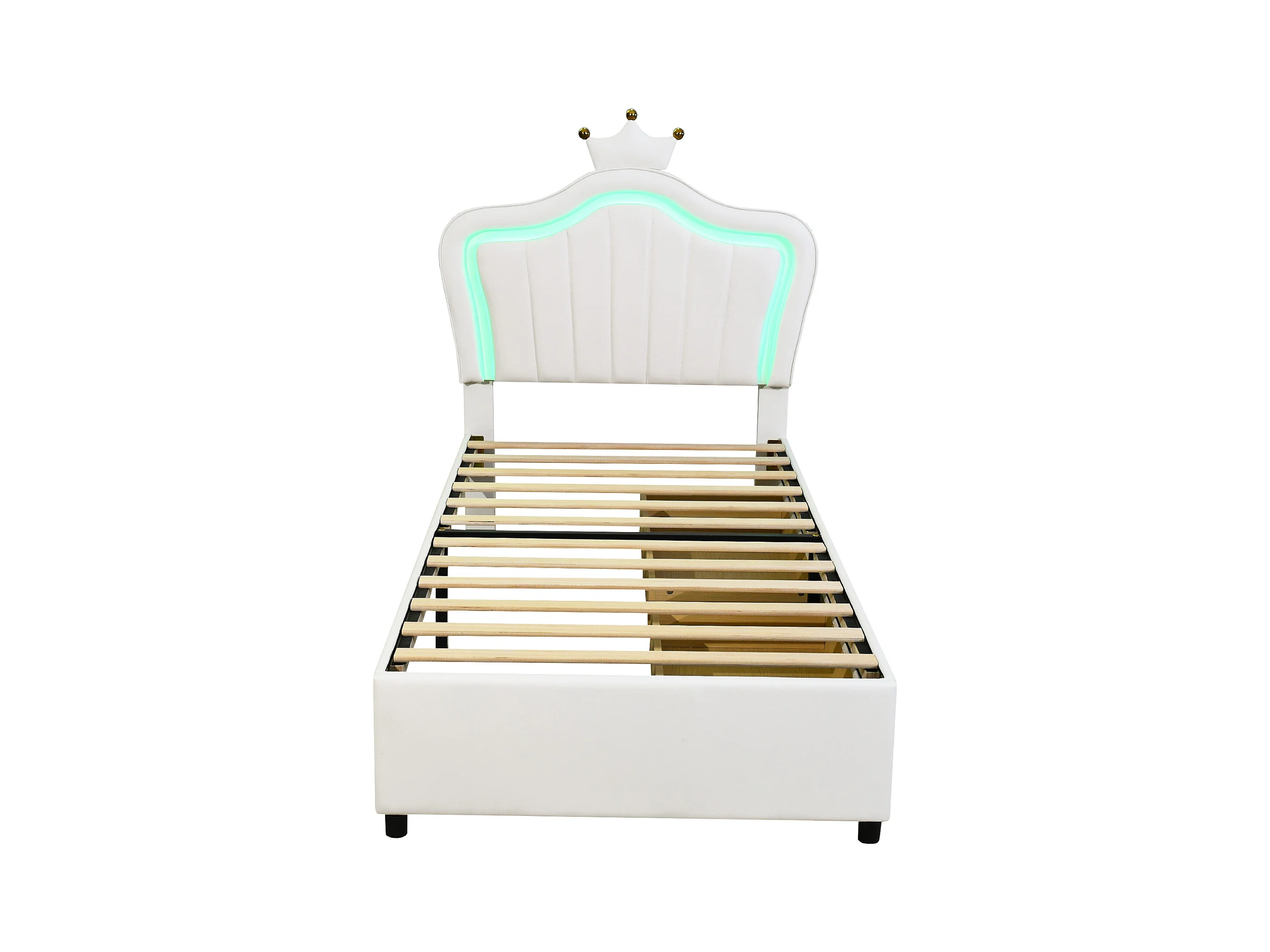 Lit simple 90 x 200 cm - Lit enfant avec tiroir de rangement et éclairage LED - PU blanc