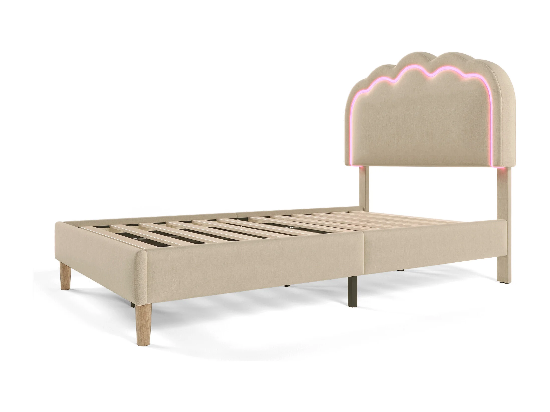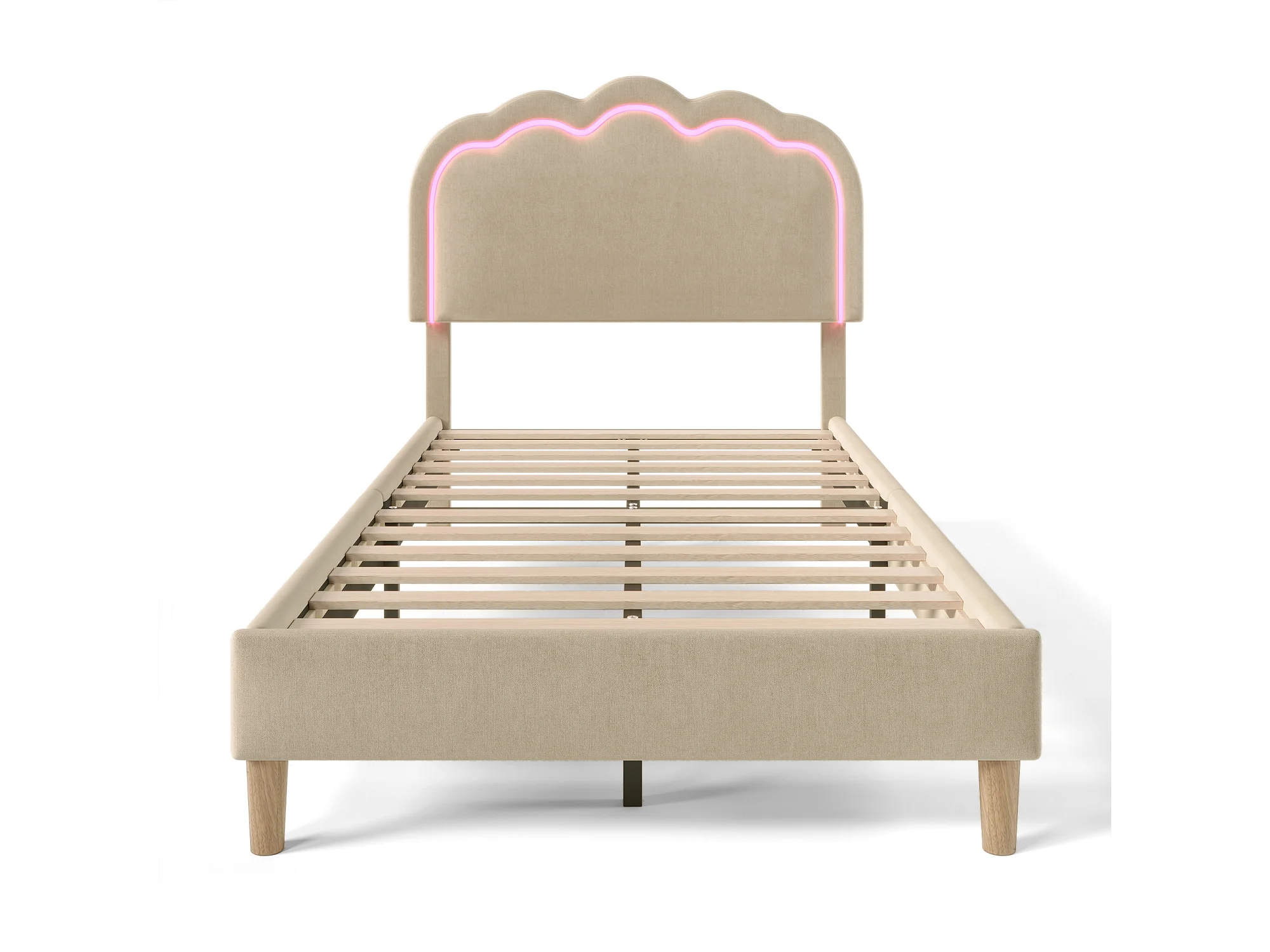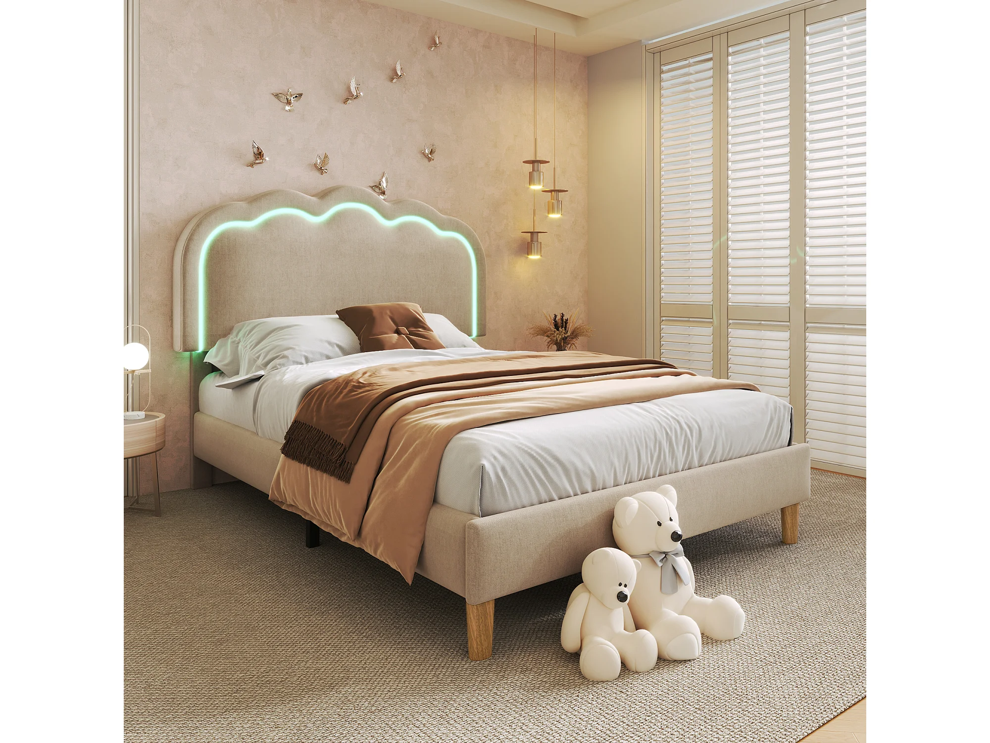 Lit enfant 90x200 cm avec LED, cadre avec sommier à lattes et tête de lit réglable, en lin Beige(sans matelas)