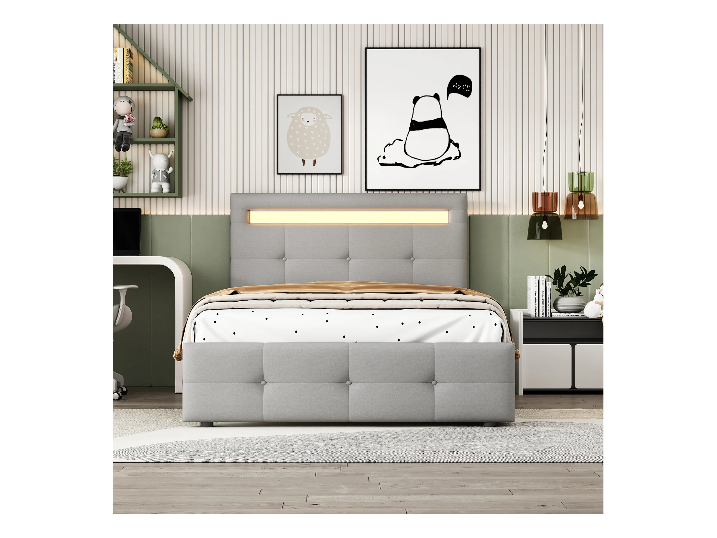 Lit simple 90x200 cm - Lit ado avec éclairage LED - 2 tiroirs de rangement - lin gris