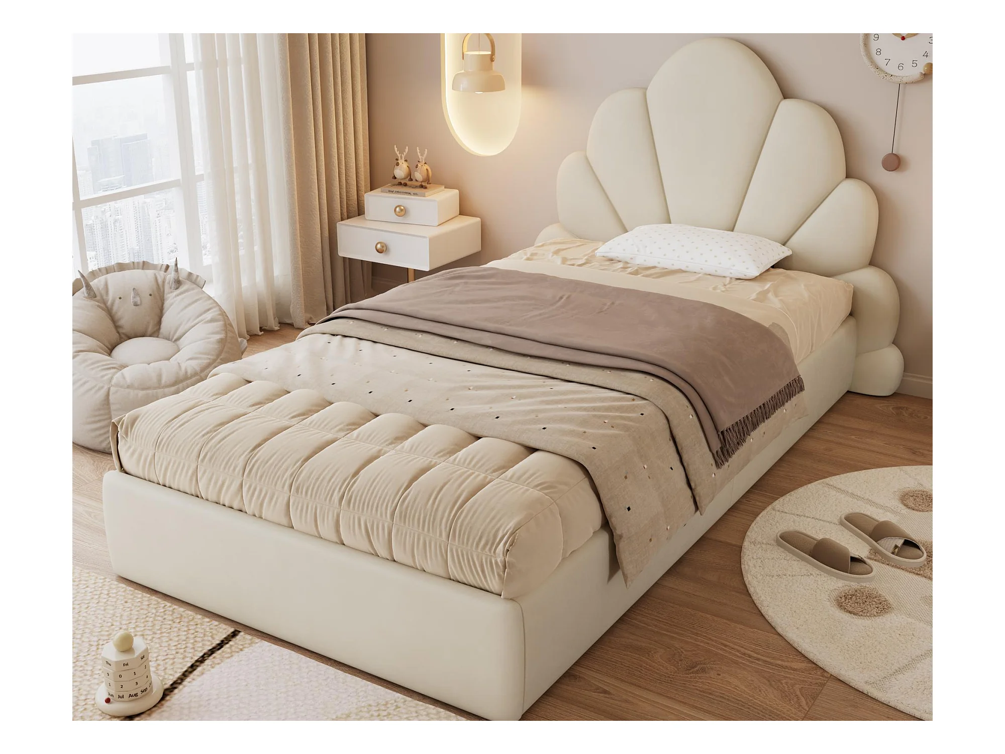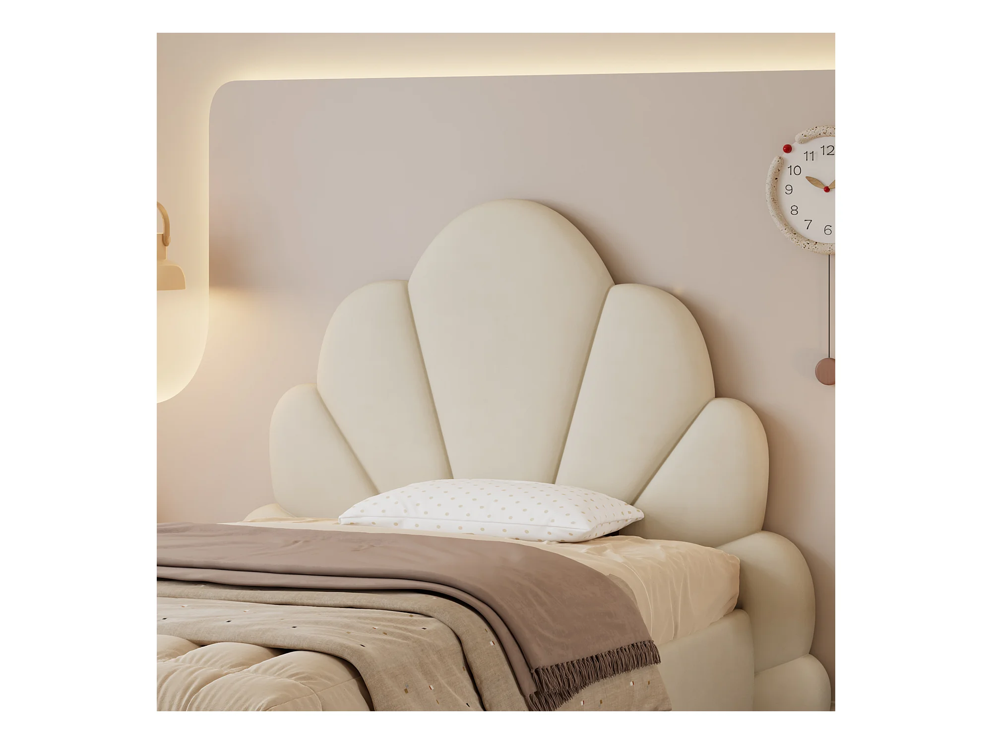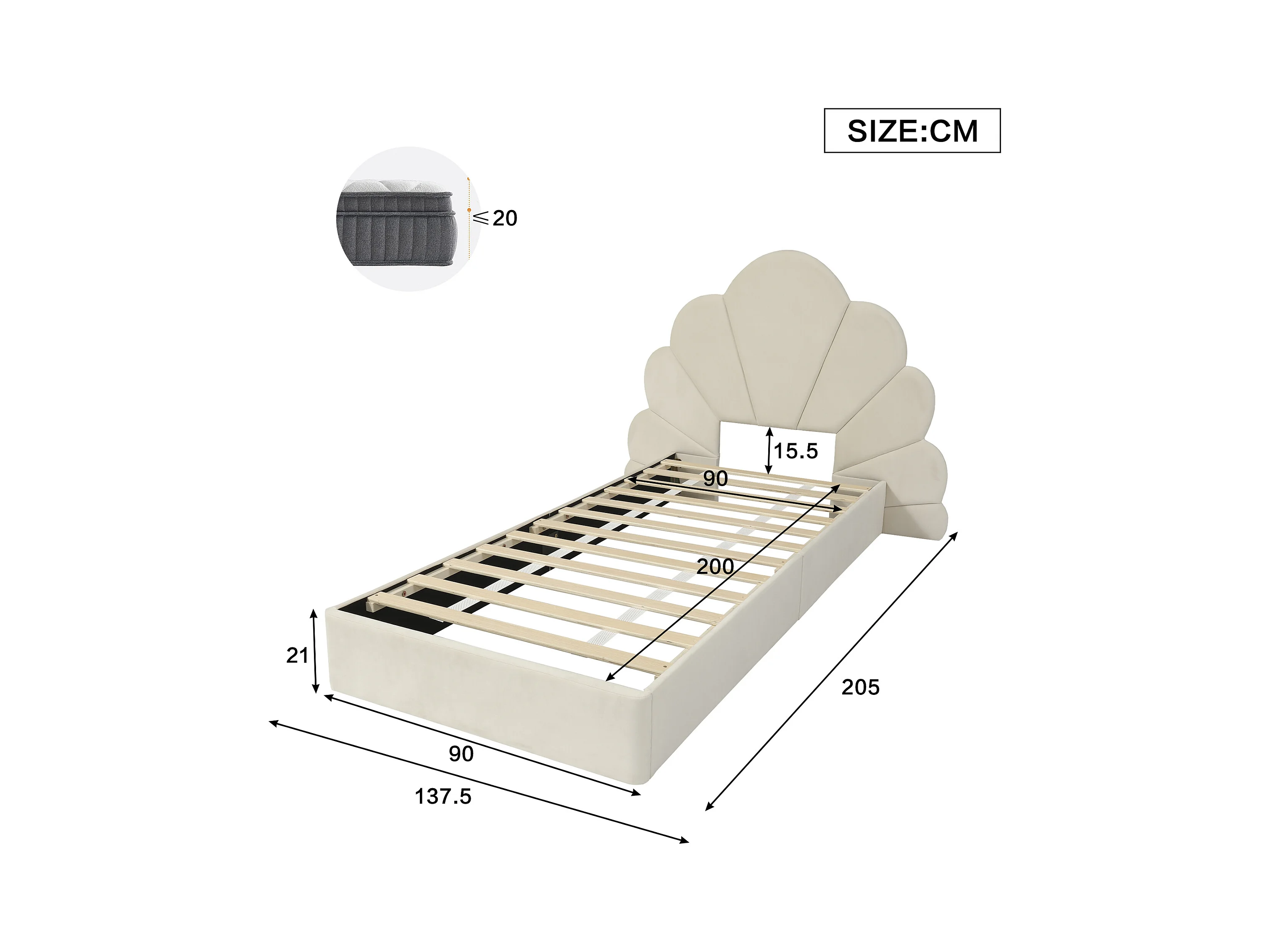 Lit simple 90x200cm rembourré en velours - tête de lit en forme de fleur - avec sommier à lattes - Beige