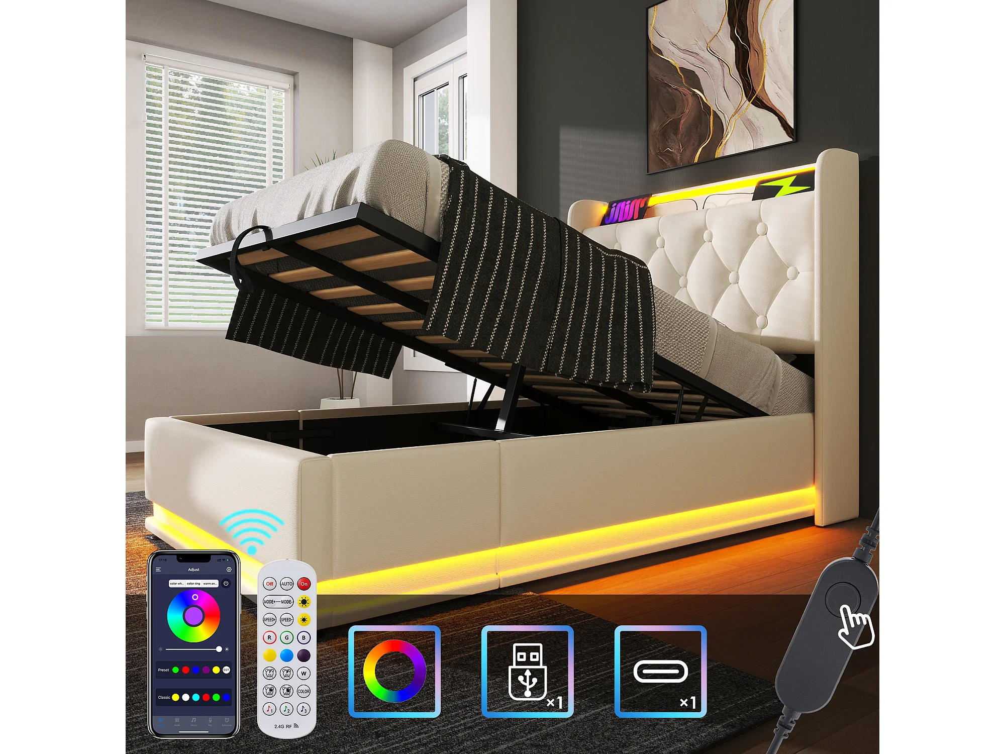 Lit simple avec éclairage LED 360°, fonction de charge USB Type-C, 90x200 cm, PU blanc (sans matelas)
