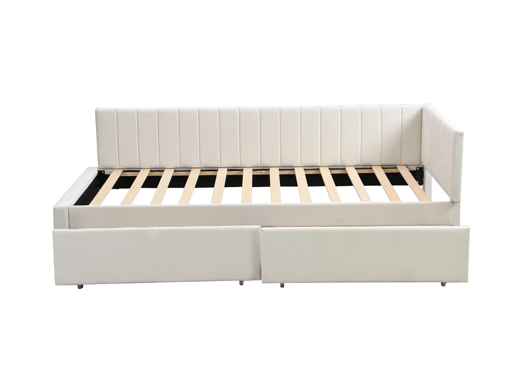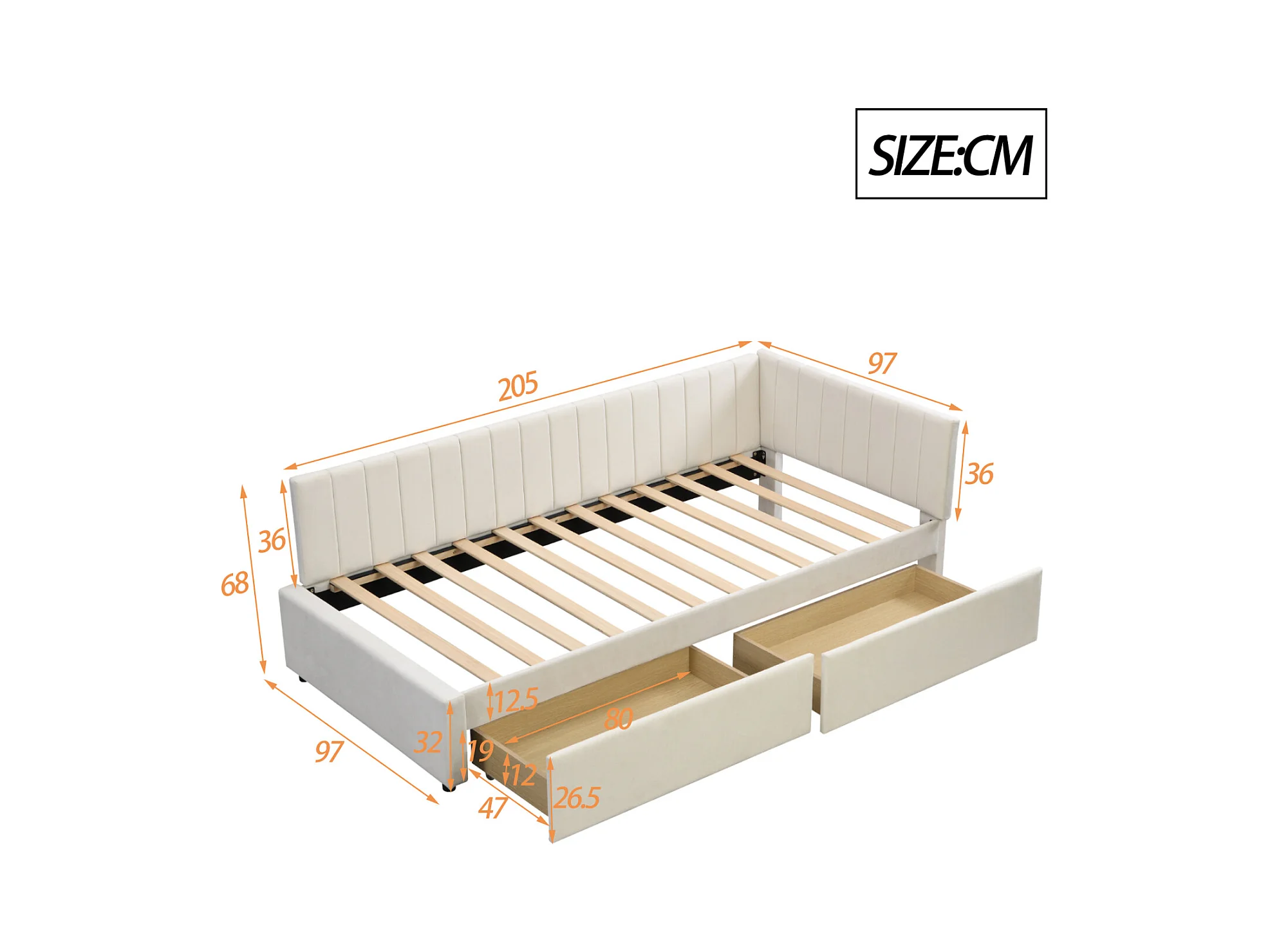 Lit simple d'enfant 90x200cm avec 2 grands tiroirs, lit en velours avec sommier à lattes et 2 barrière de lit, beige