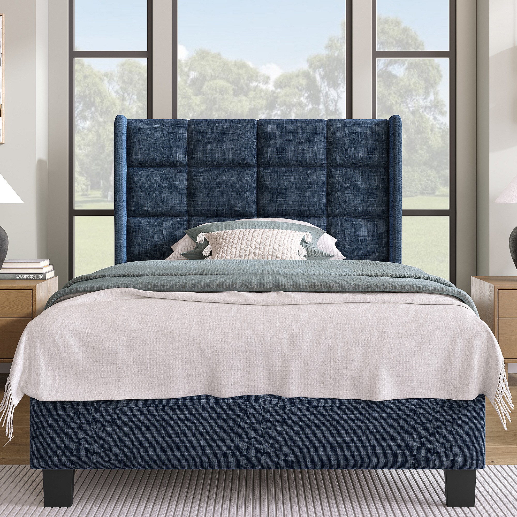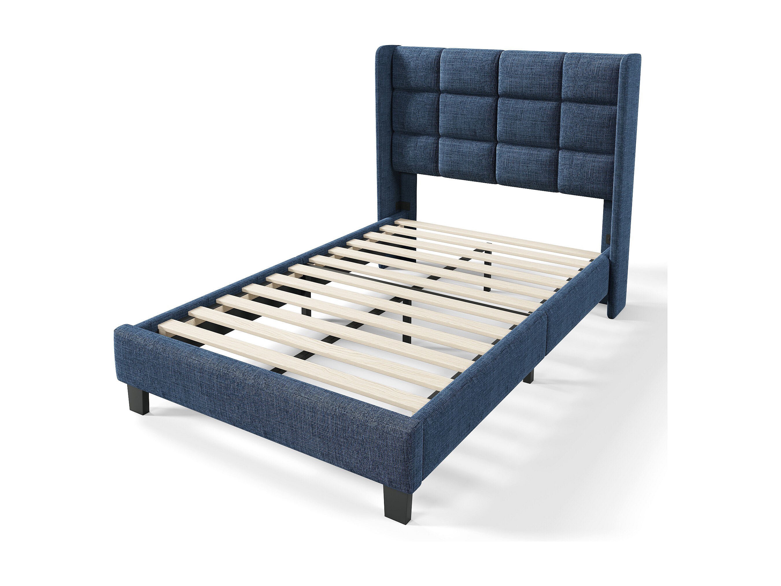 Lit simple en lin bleu 90x200 cm avec tête de lit rembourrée et lattes, design moderne et élégant
