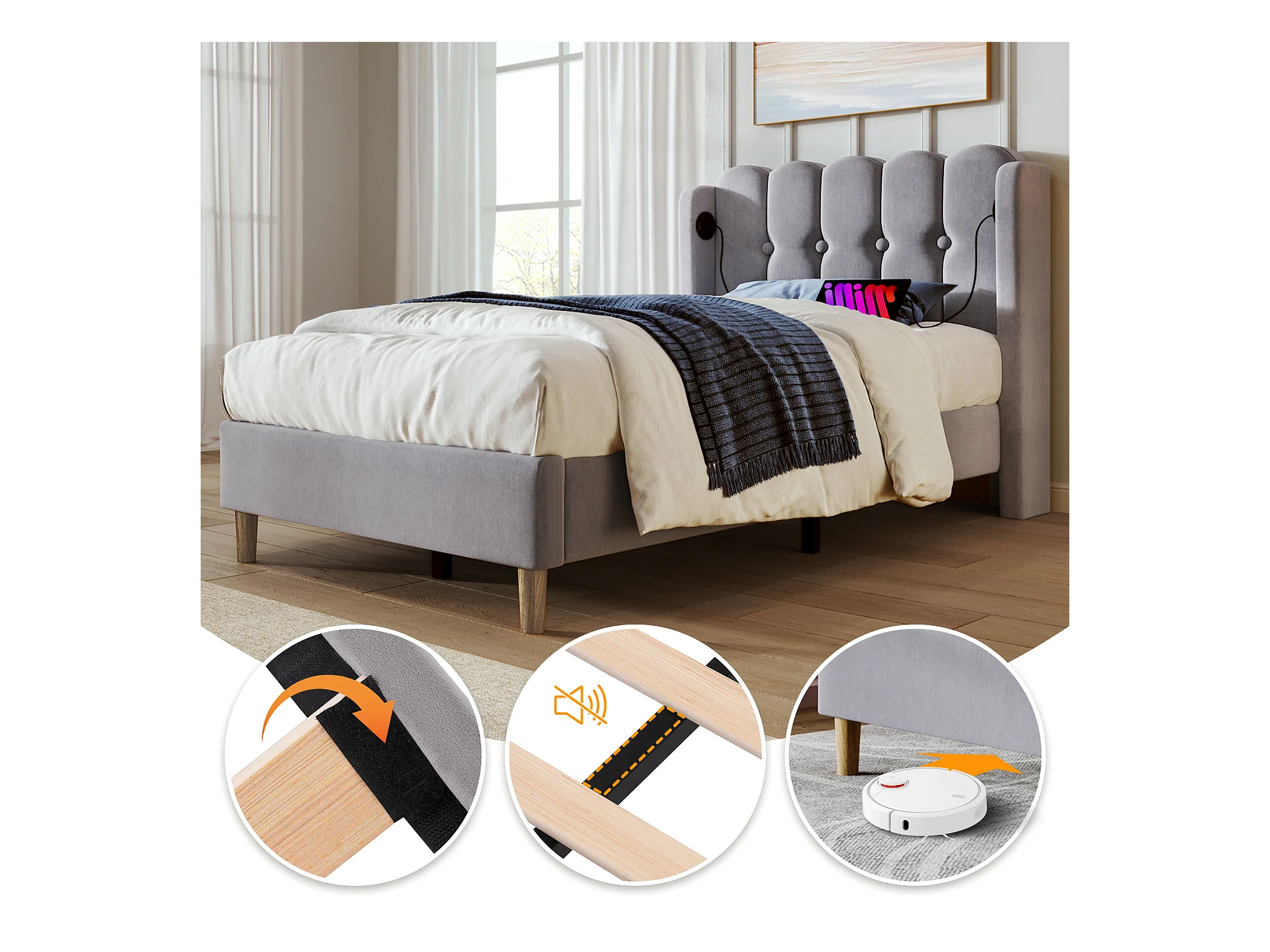 Lit simple rembourré pour jeune - 90 x 200 cm - Matelas + Tête de lit avec USB - Tissu lin - Gris