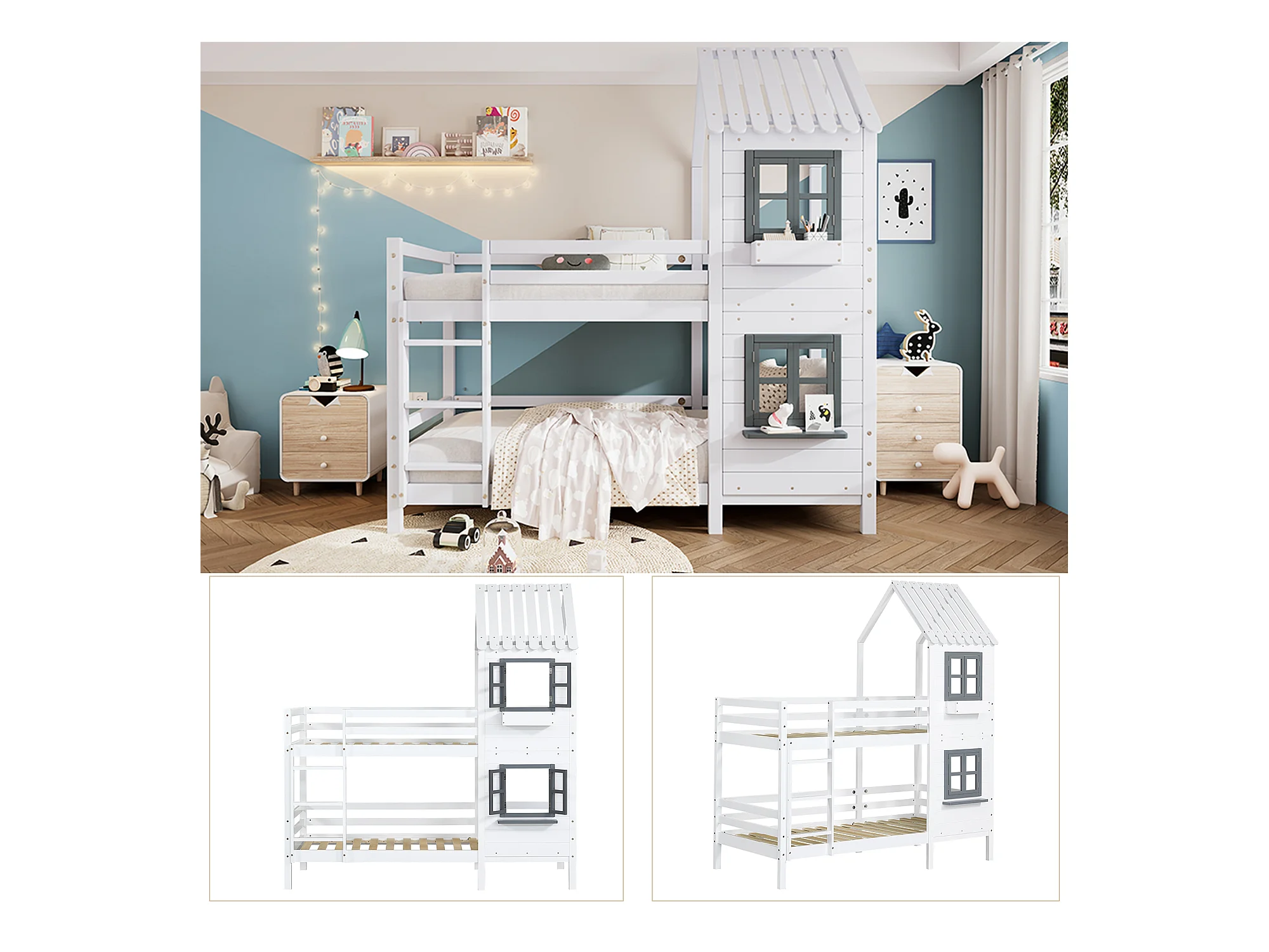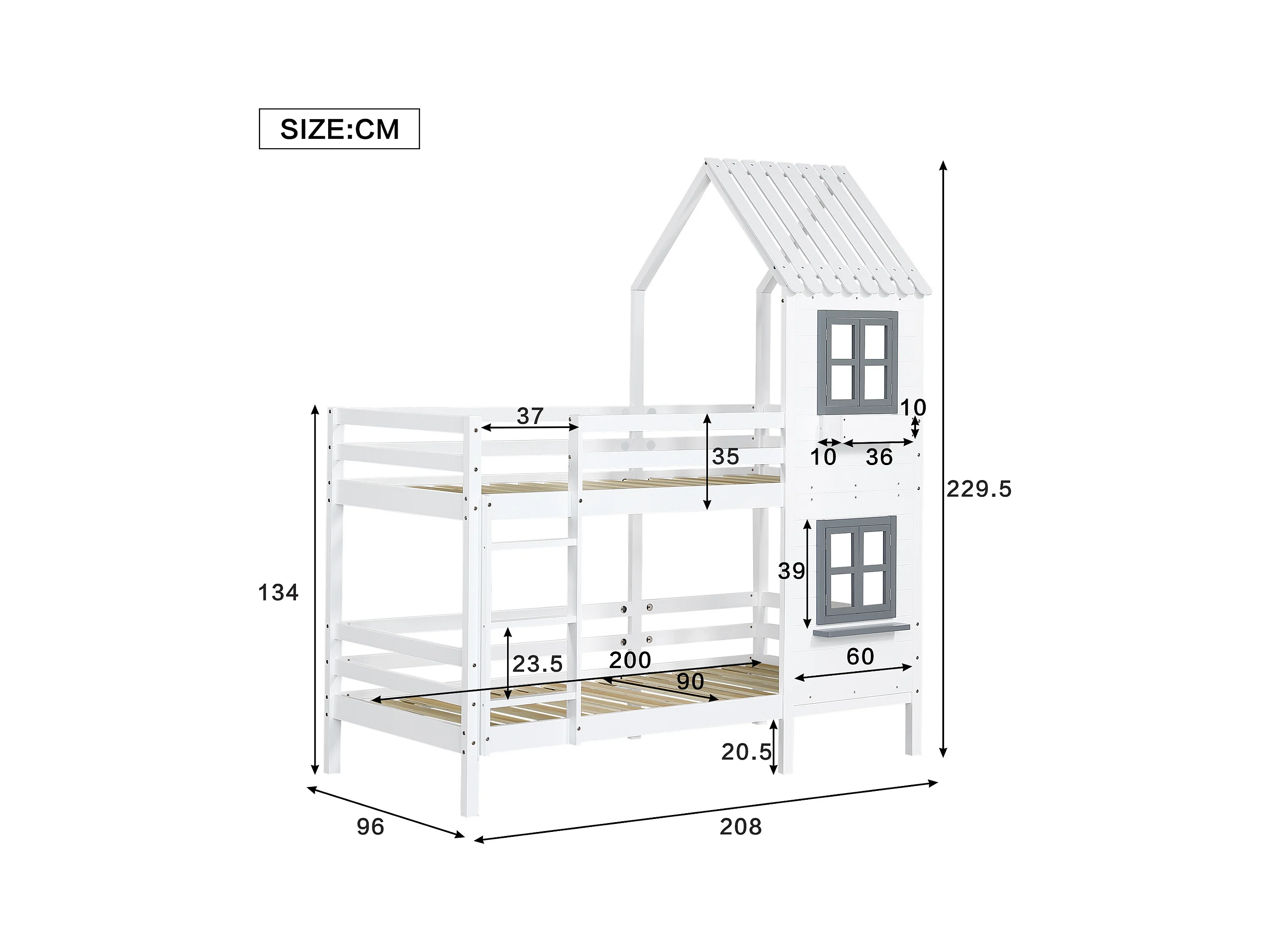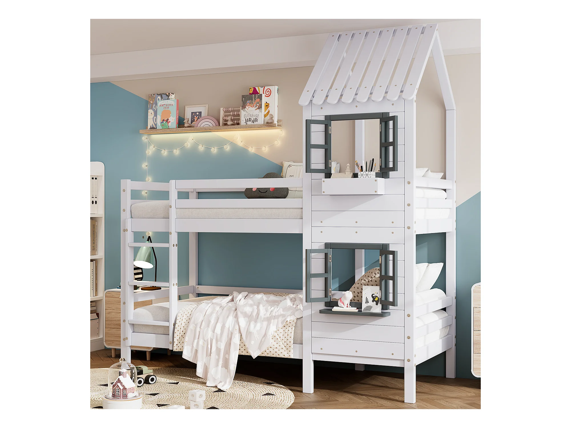 Lit superposé 2 places - 2 x 90 x 200 cm - escalier, fenêtre et sommier à lattes - coloris blanc