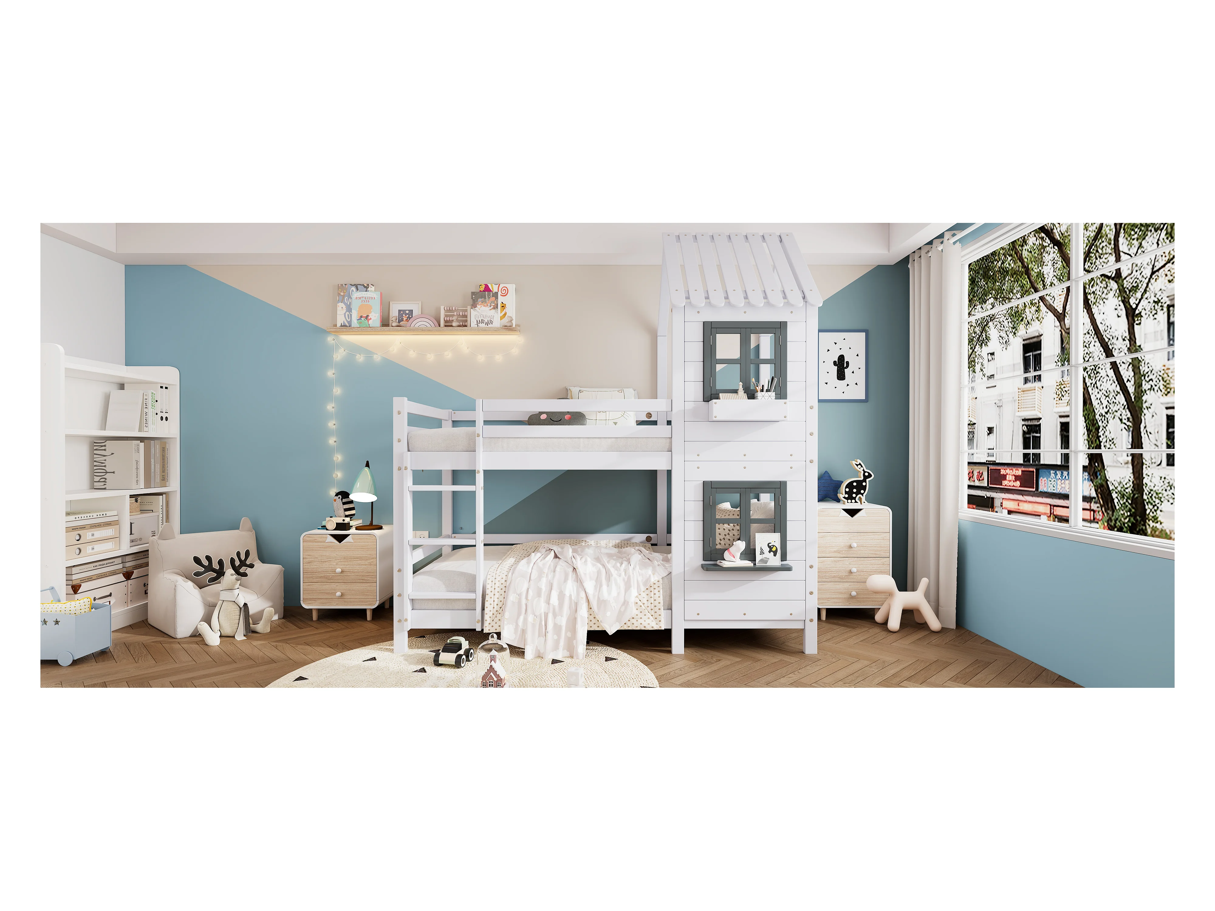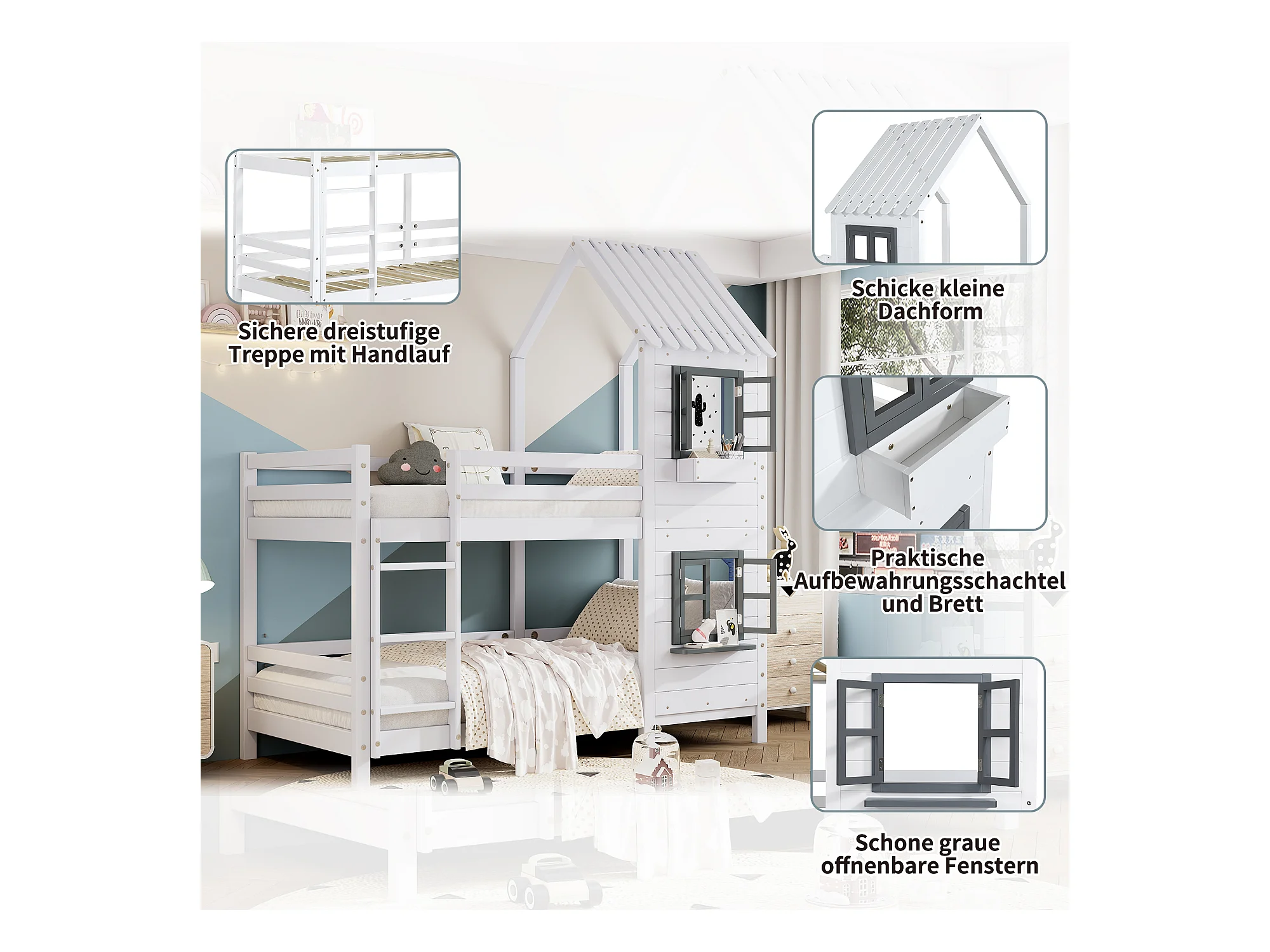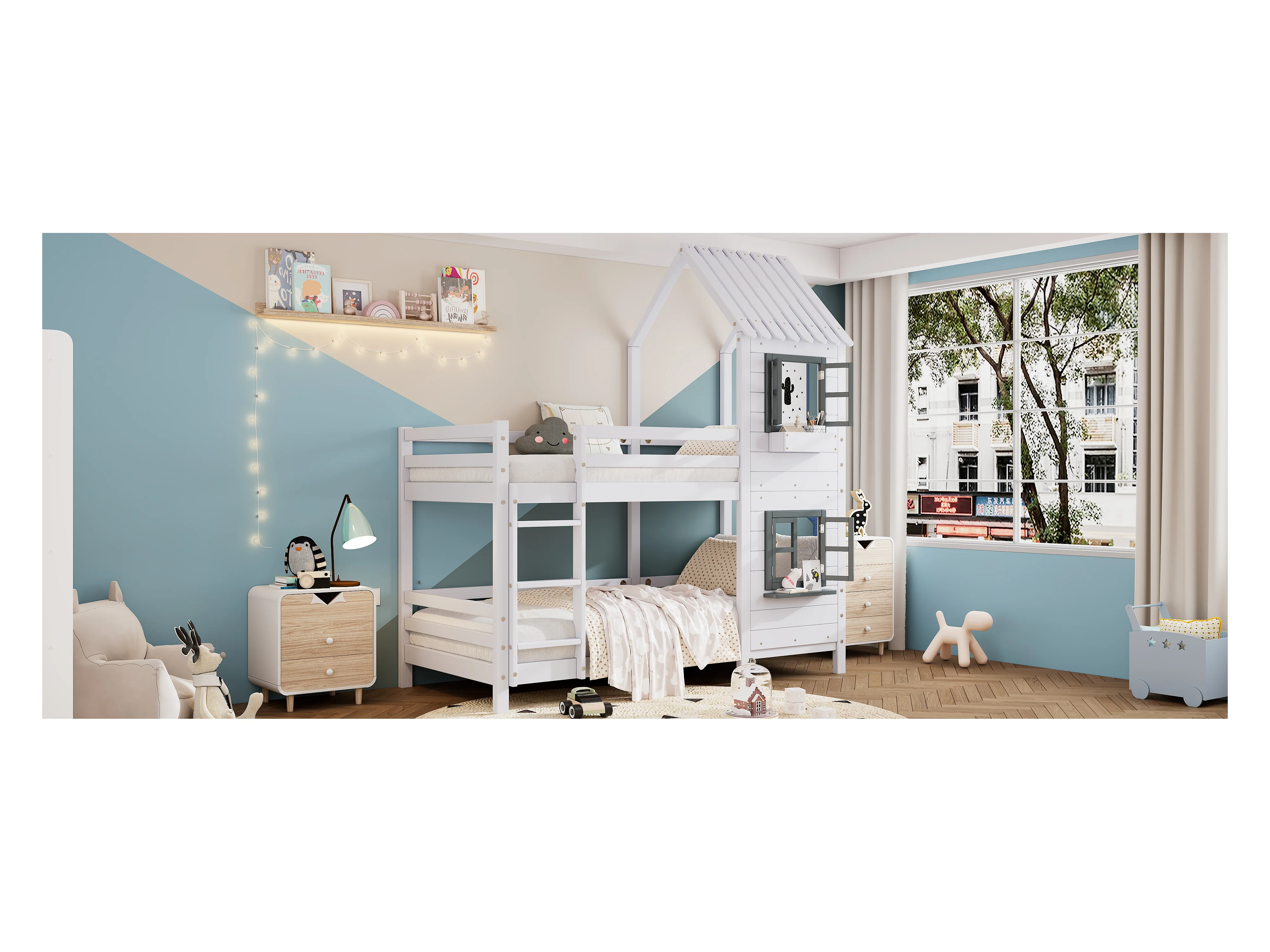 Lit superposé 2 places - 2 x 90 x 200 cm - escalier, fenêtre et sommier à lattes - coloris blanc