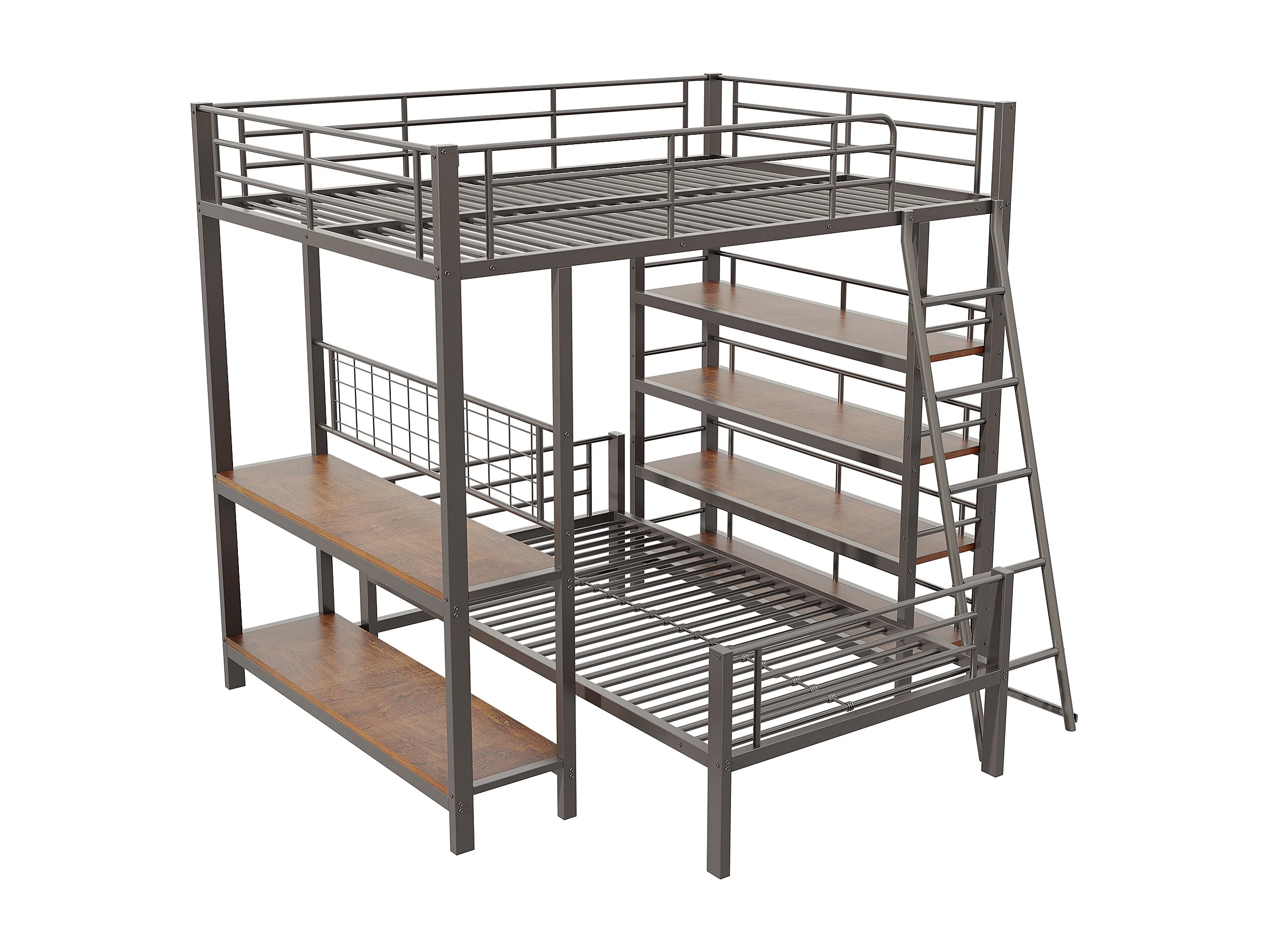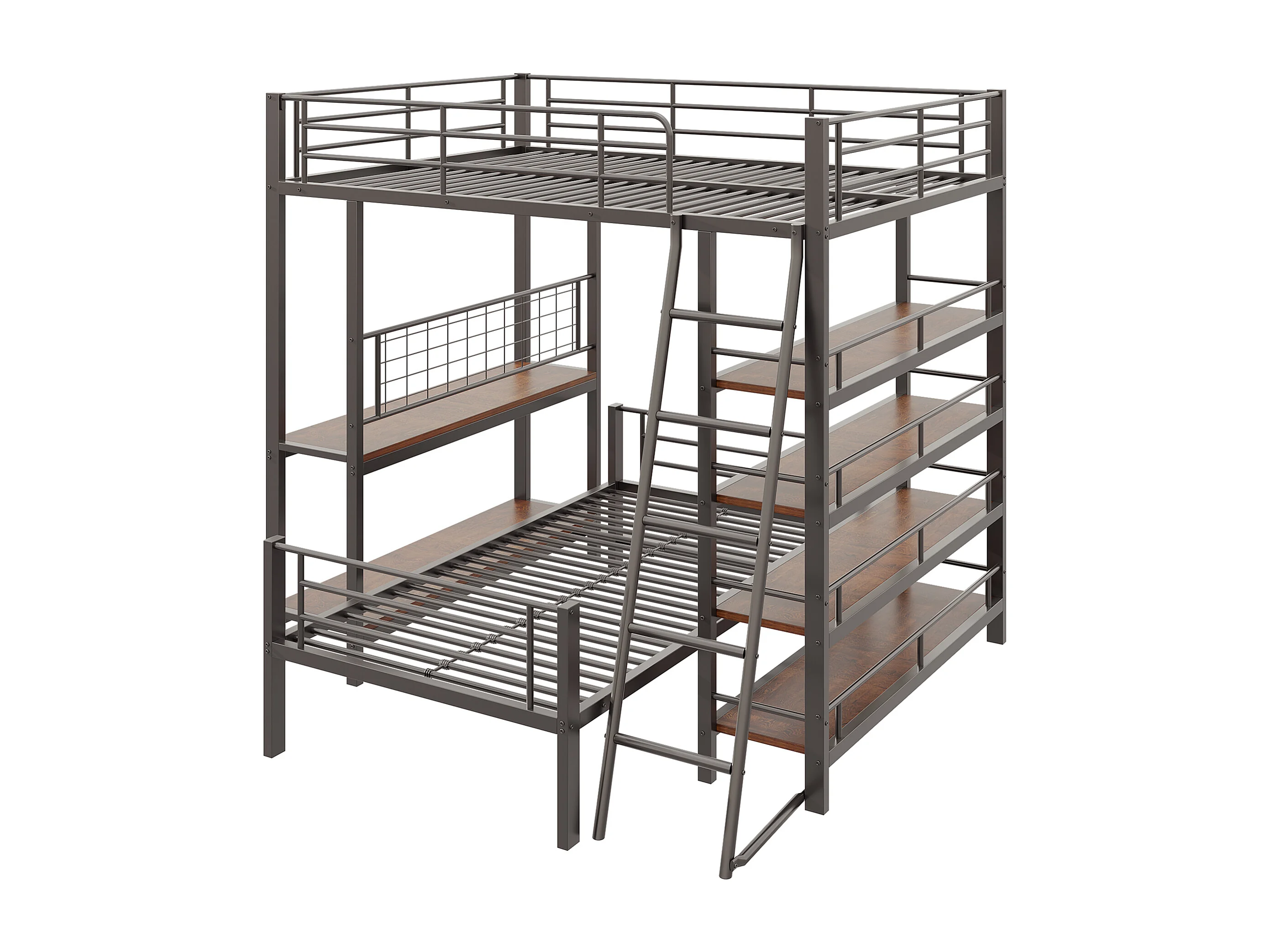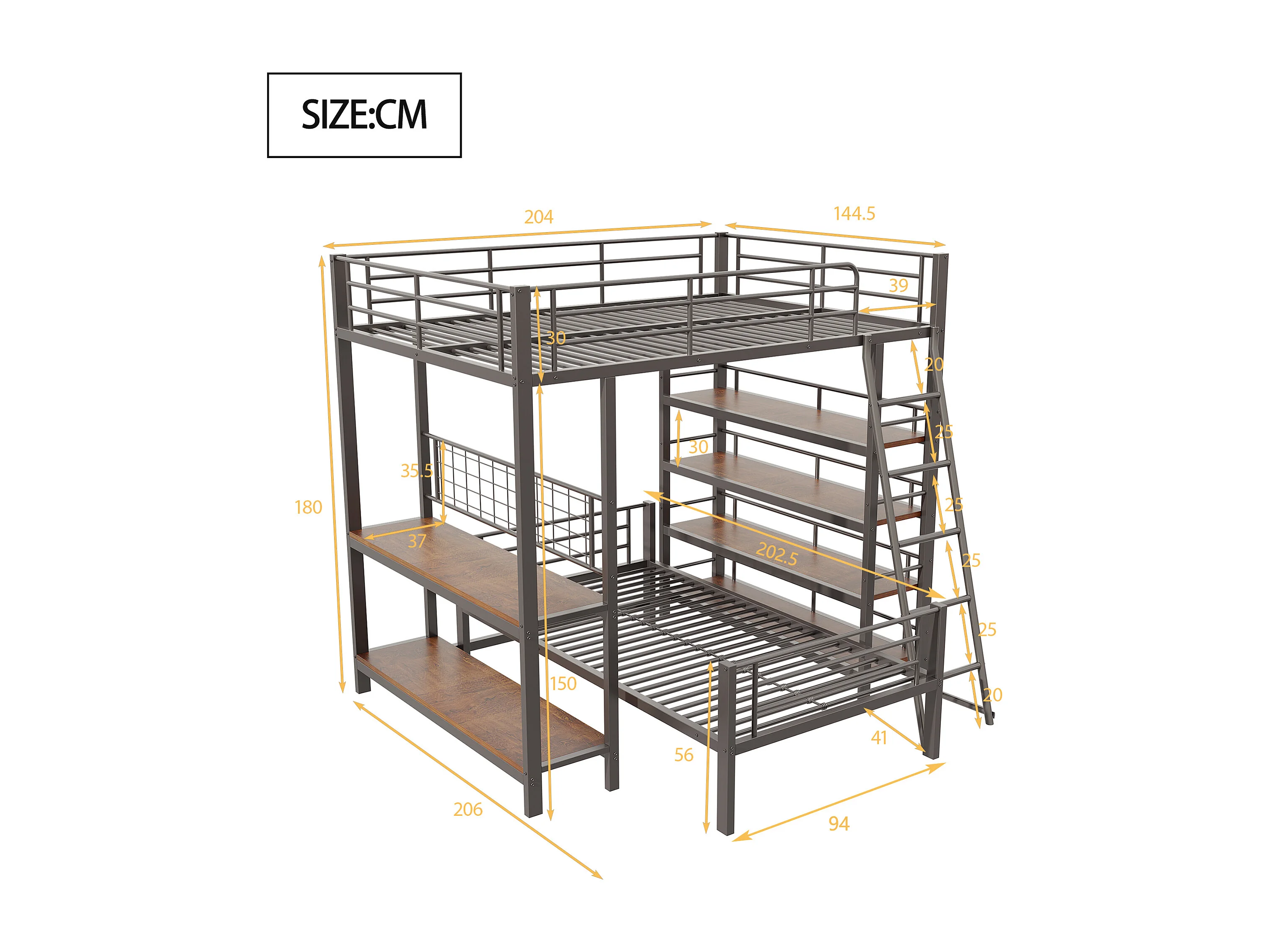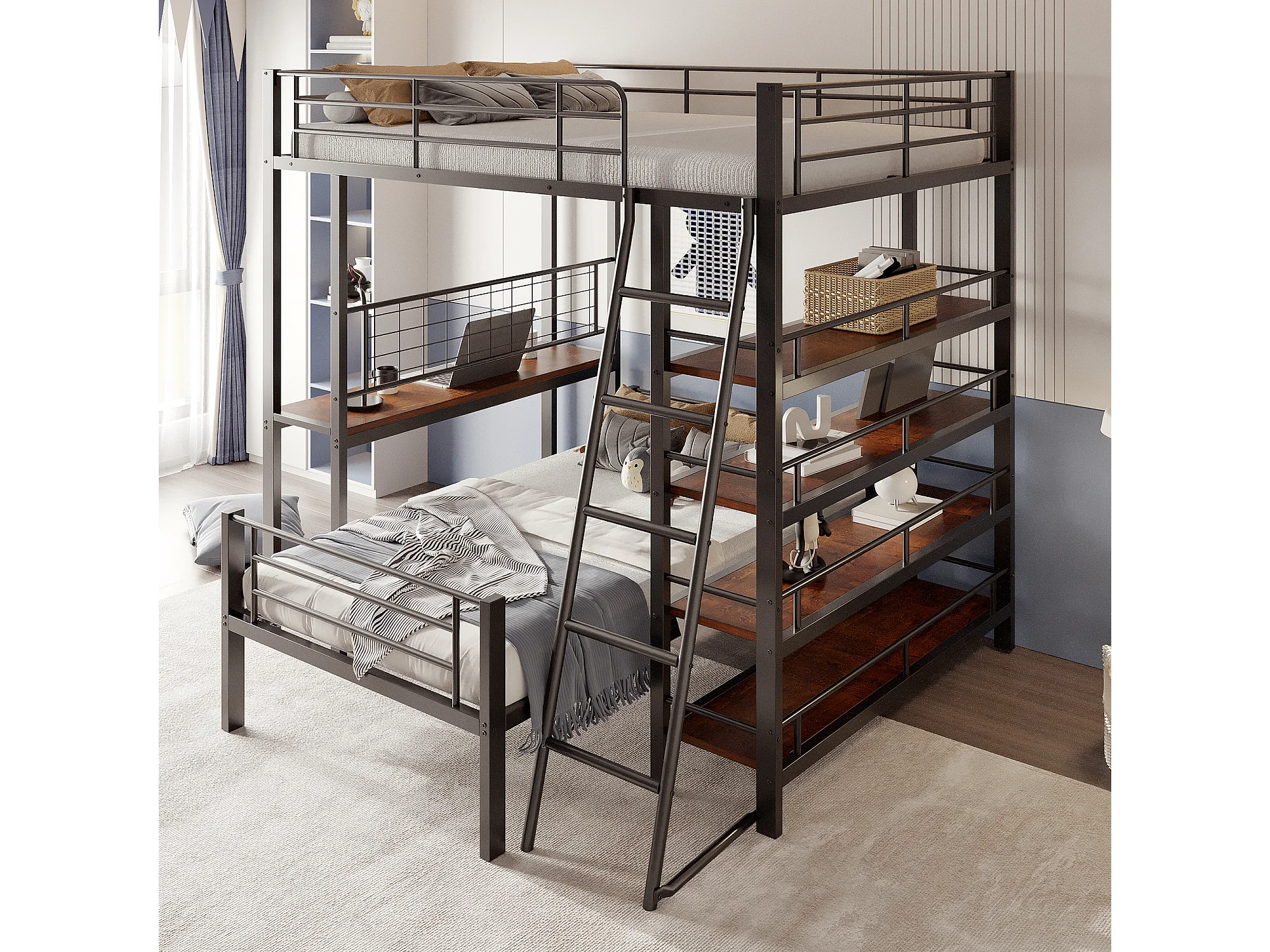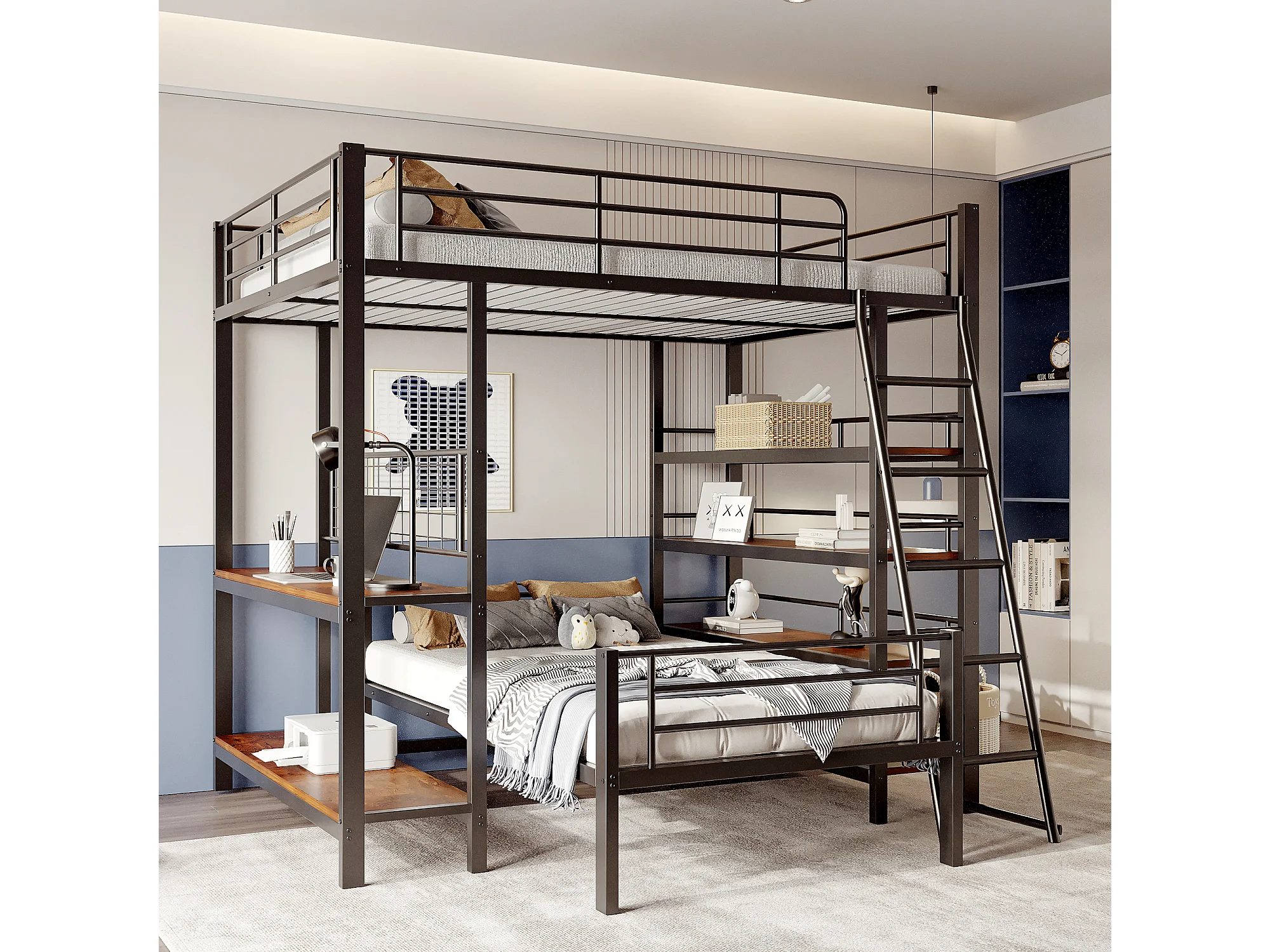 Lit superposé 90/140x200 cm avec rangement, lit mezzanine , 2 sommiers, MDF et métal, noir, sans matelas
