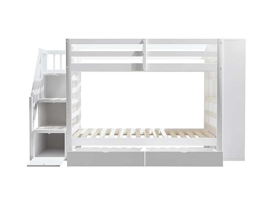 Lit superposé 90 x 200 cm avec escalier de sécurité et rangement tiroirs grands casiers clôture haute sommier à lattes en Pin Blanc