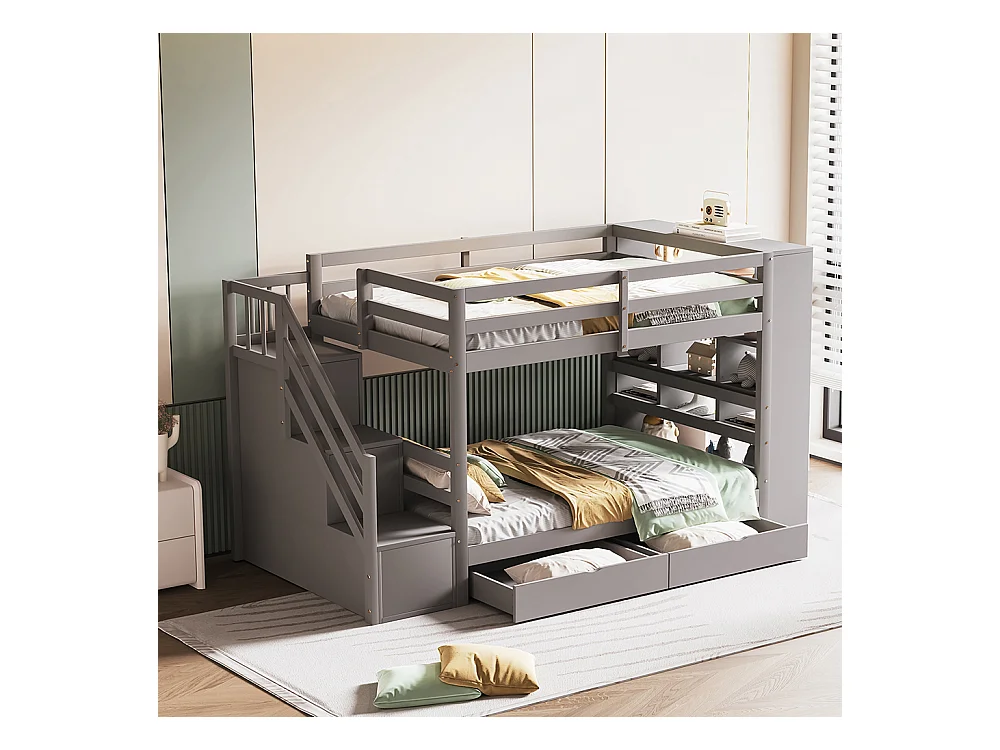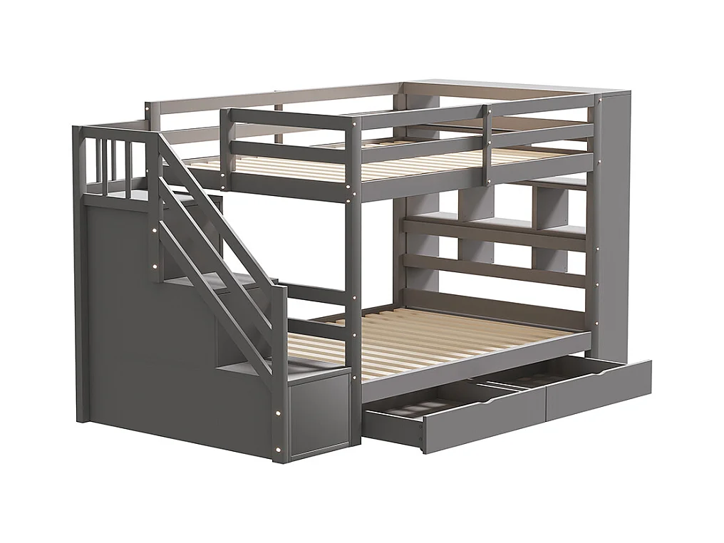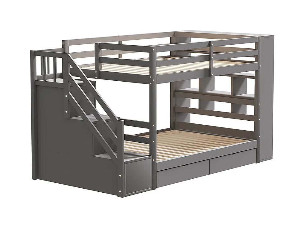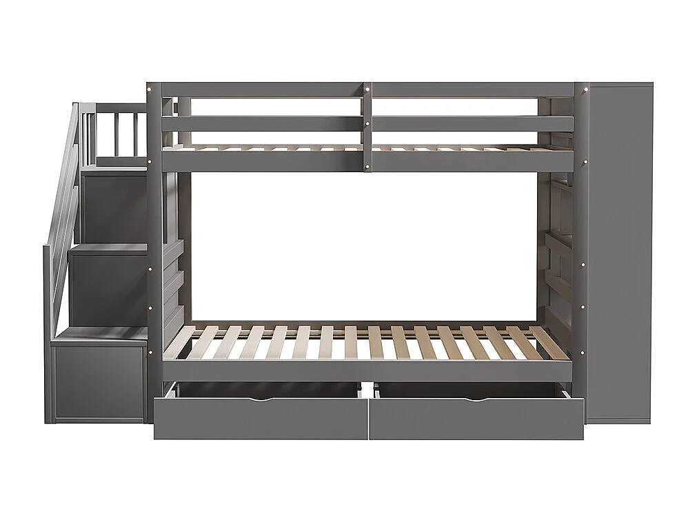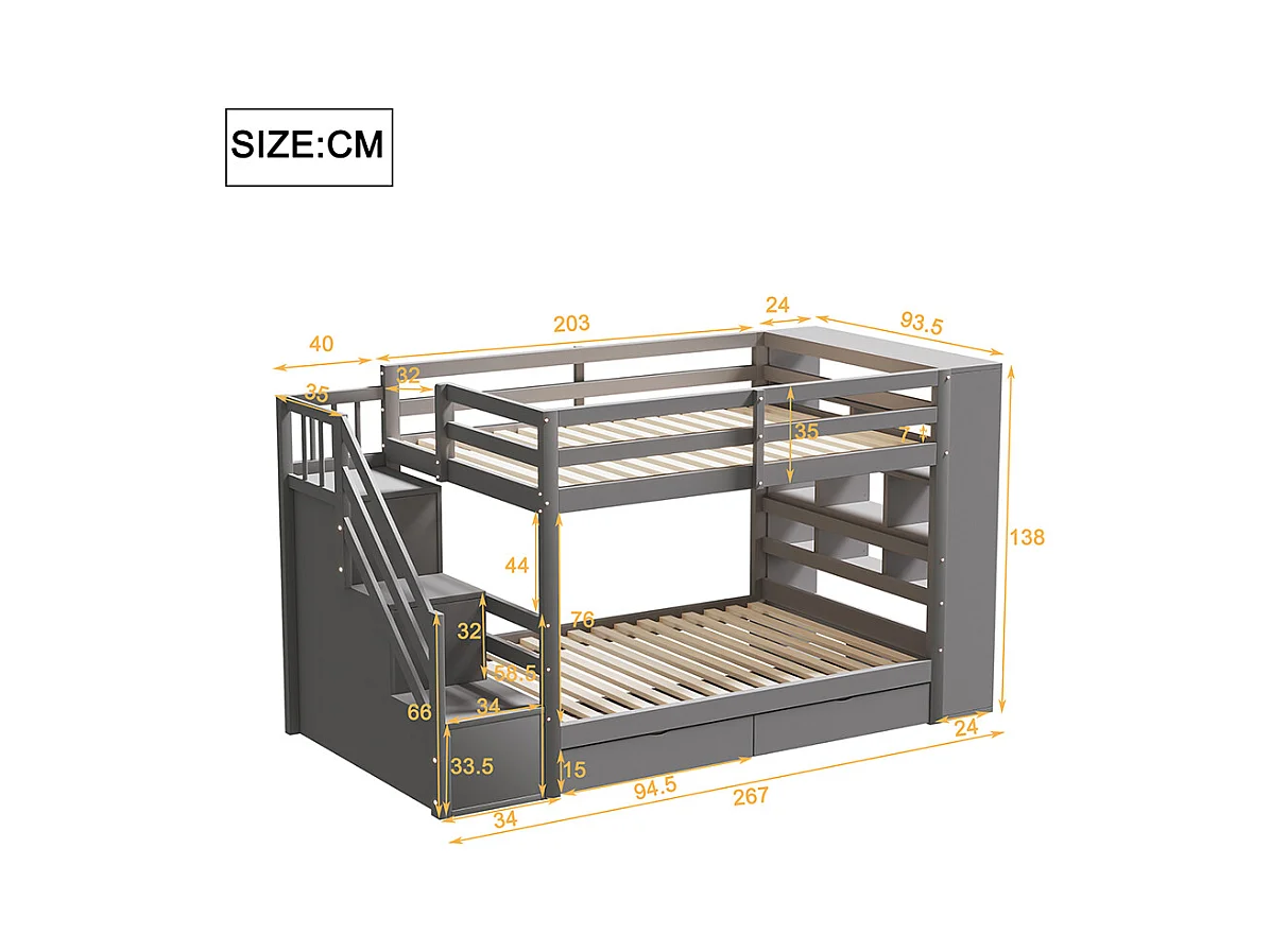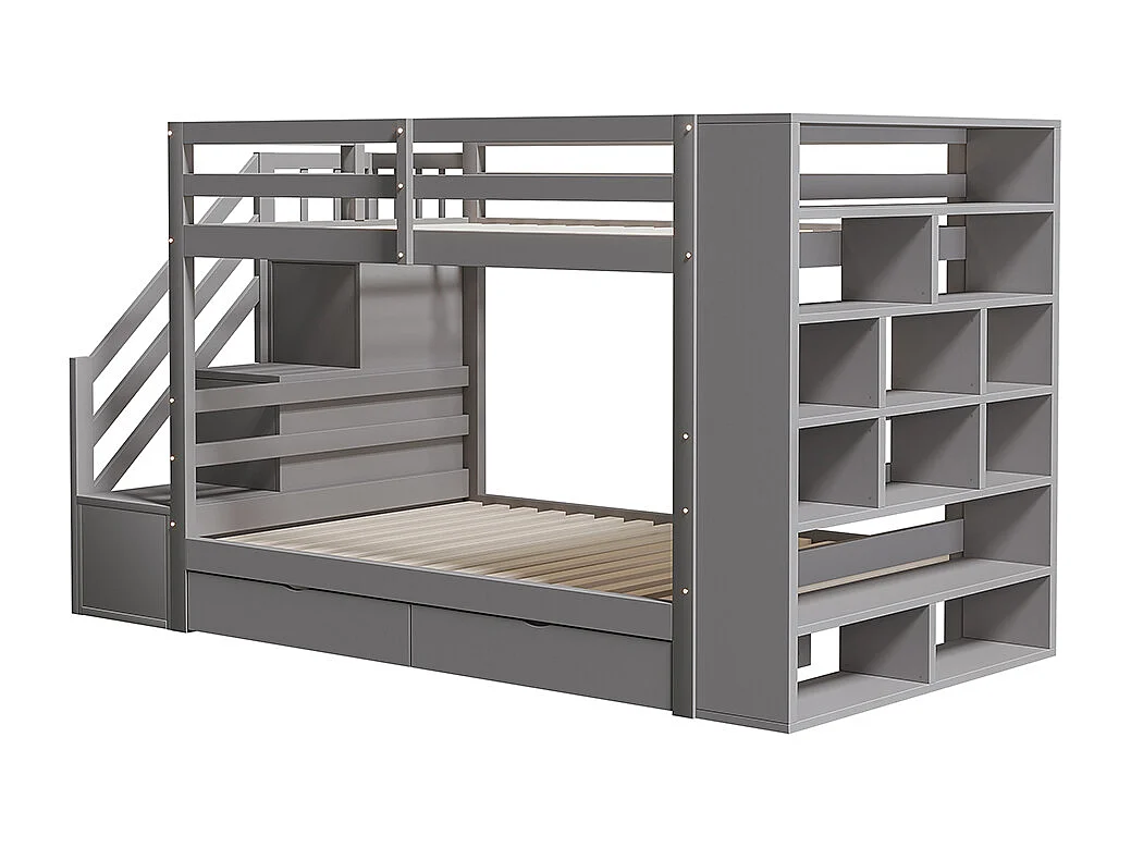 Lit superposé 90 x 200 cm avec escalier de sécurité et rangement tiroirs grands casiers clôture haute sommier à lattes en Pin Gris