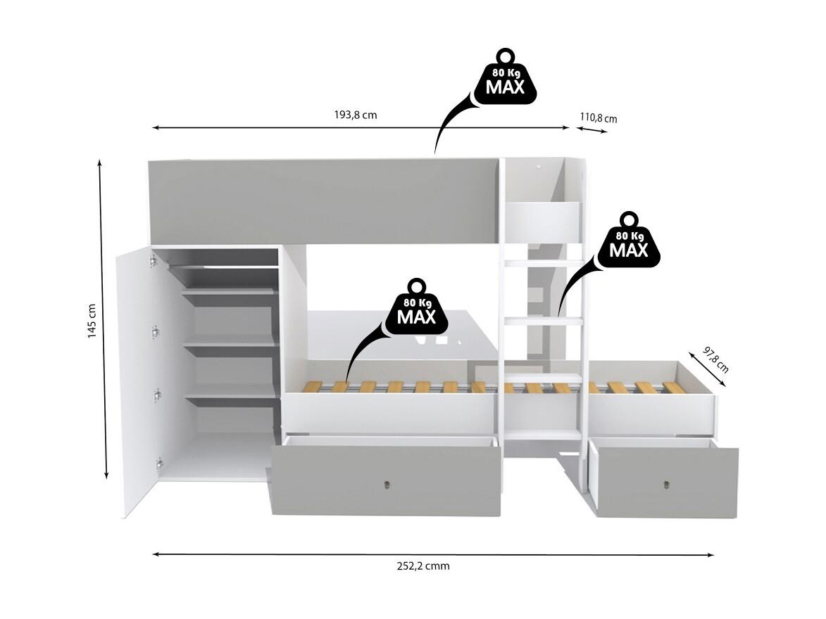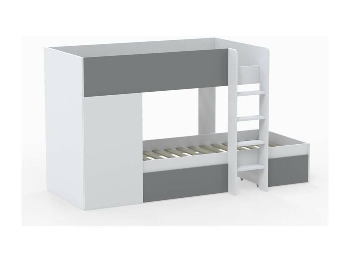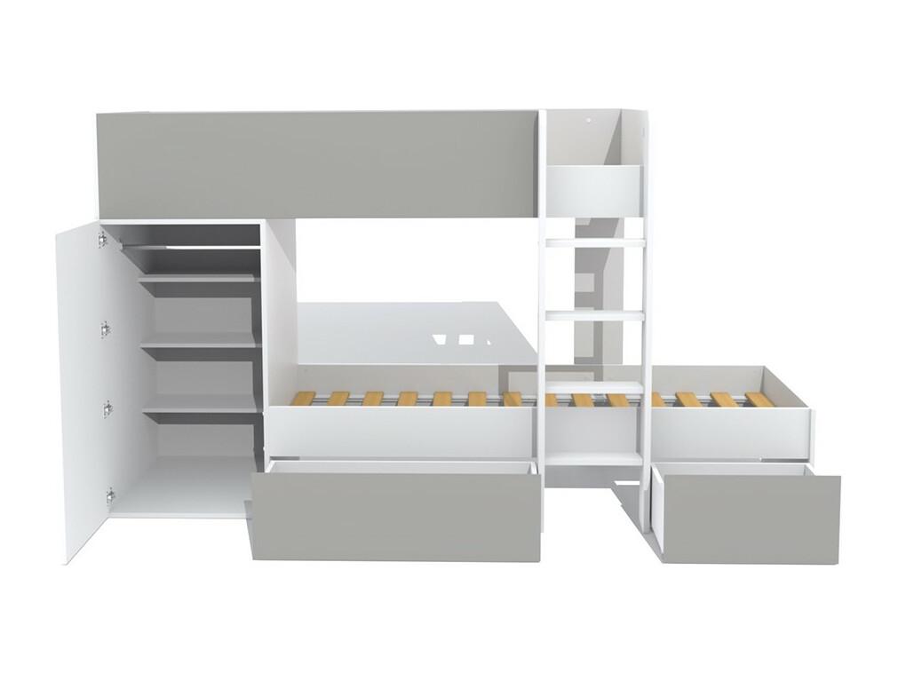 Lit superposé 90x190 avec armoire et tiroirs TWEEL Gris et Blanc incl. 2 sommiers