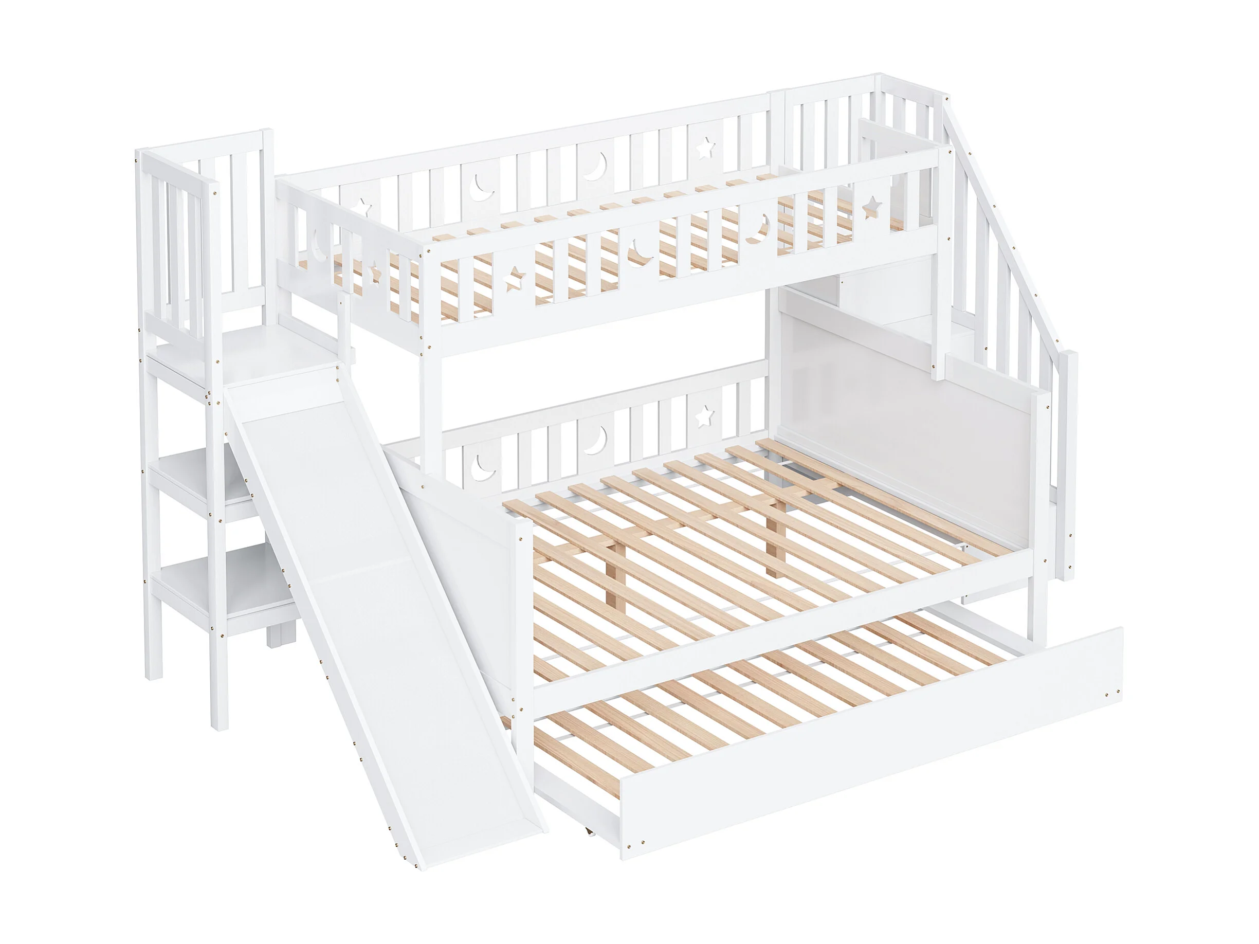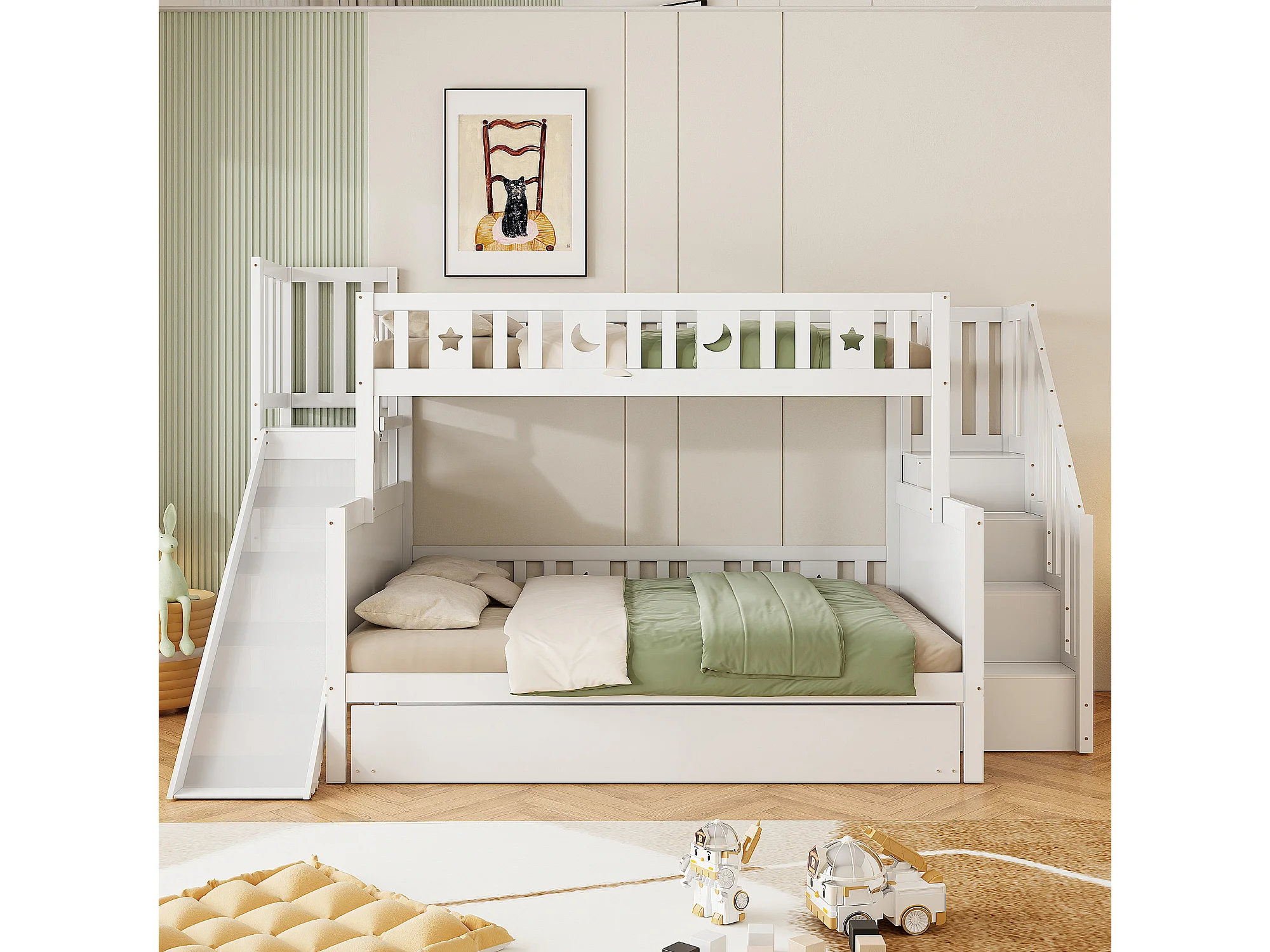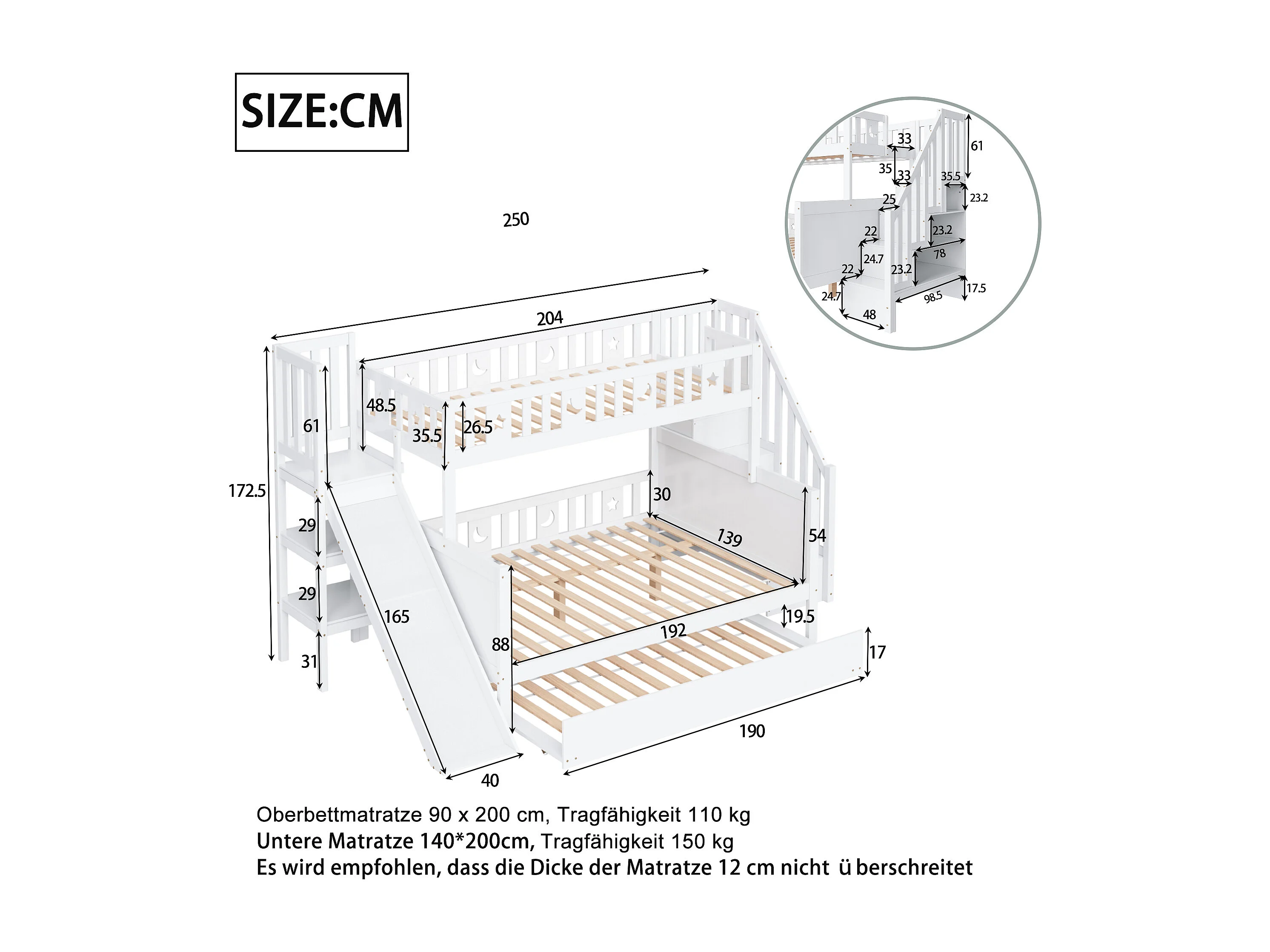 Lit superposé 90x200/140x200 cm avec toboggan et échelle de rangement, barrière de sécurité, sans matelas