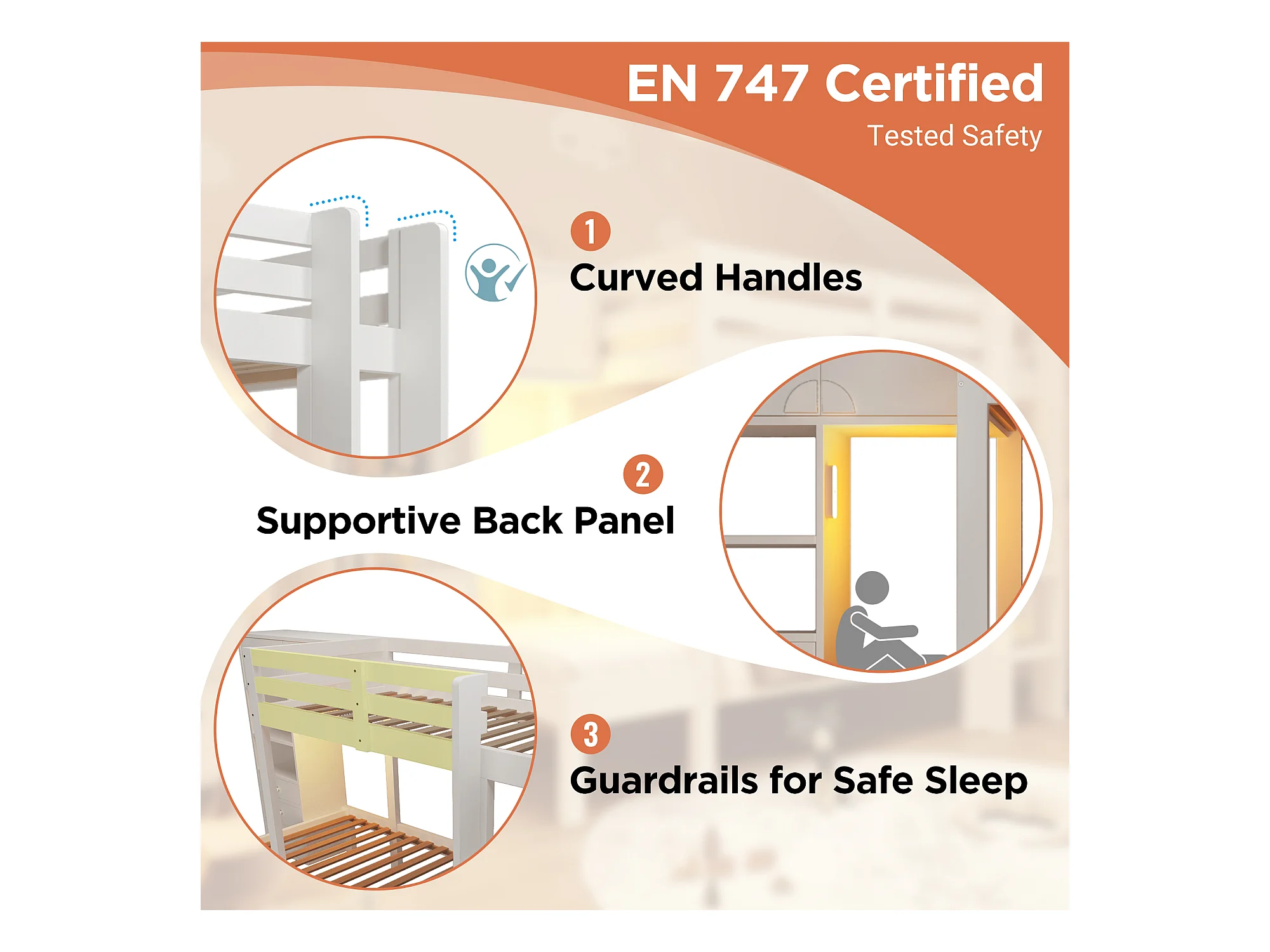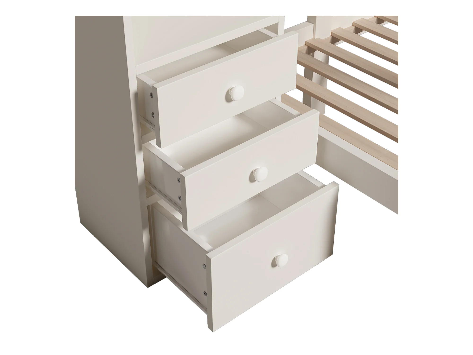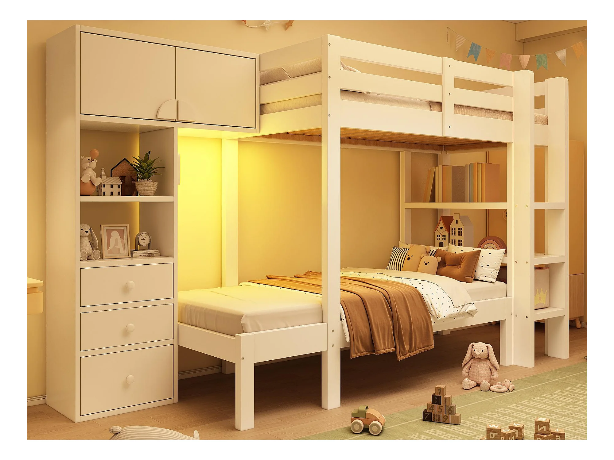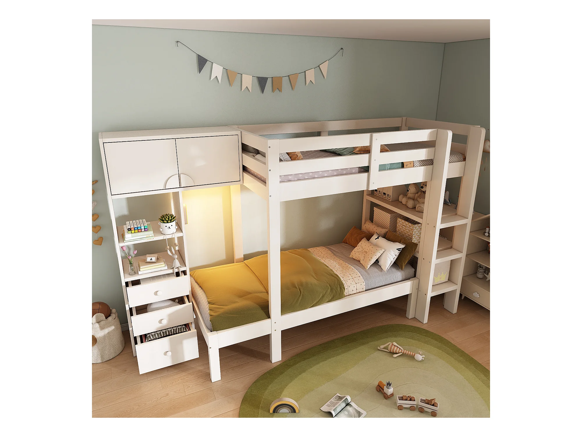 Lit superposé 90x200cm - avec veilleuse intelligente à LED - avec armoire et 3 tiroirss - avec étagères - Bois massif + MDF - Blanc