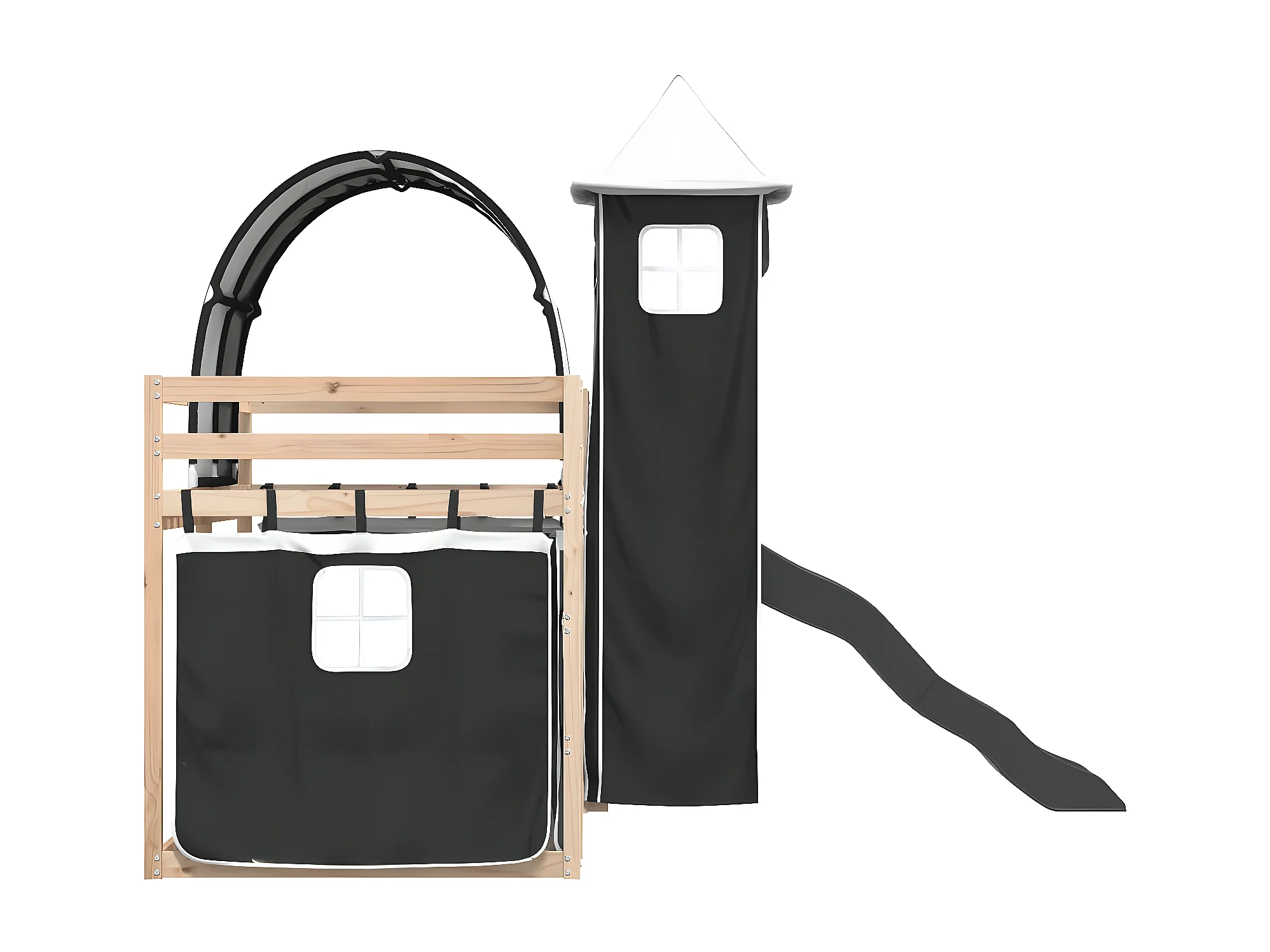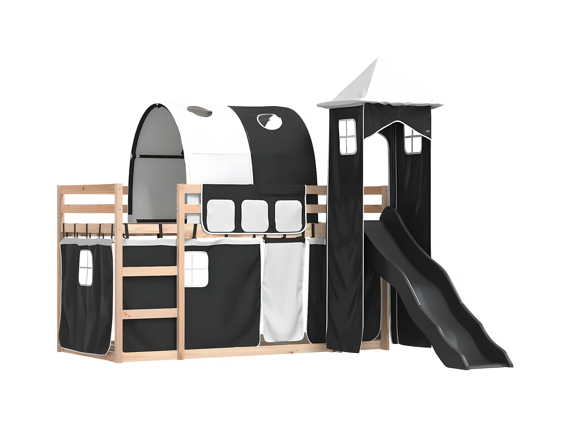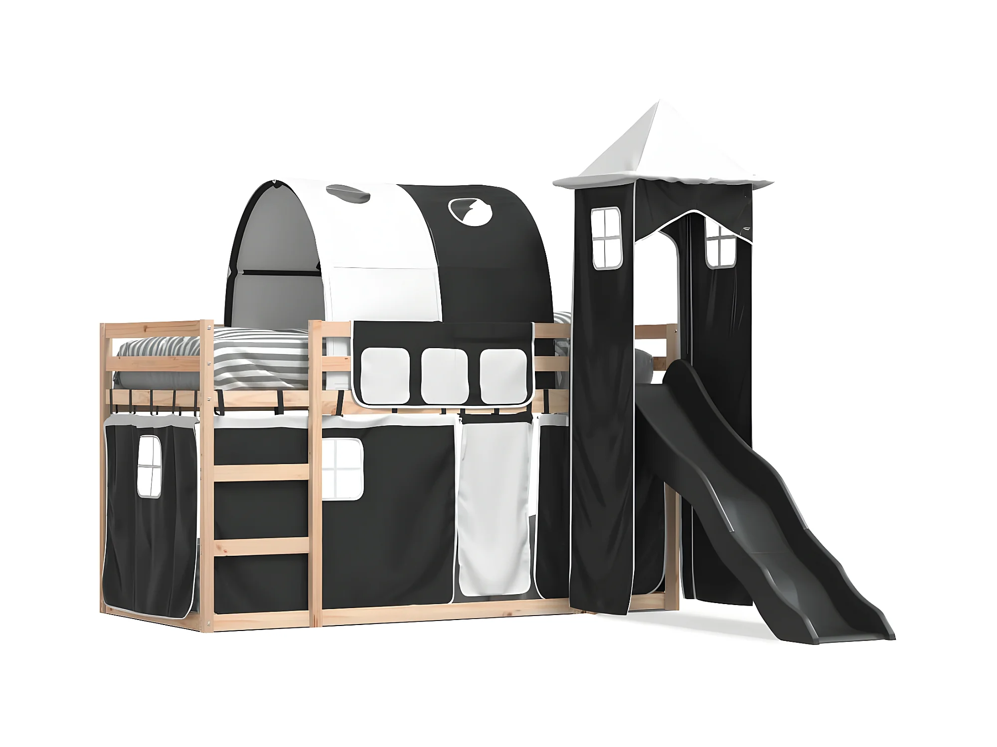 Lit superposé avec toboggan et rideaux blanc et noir 80x200 cm