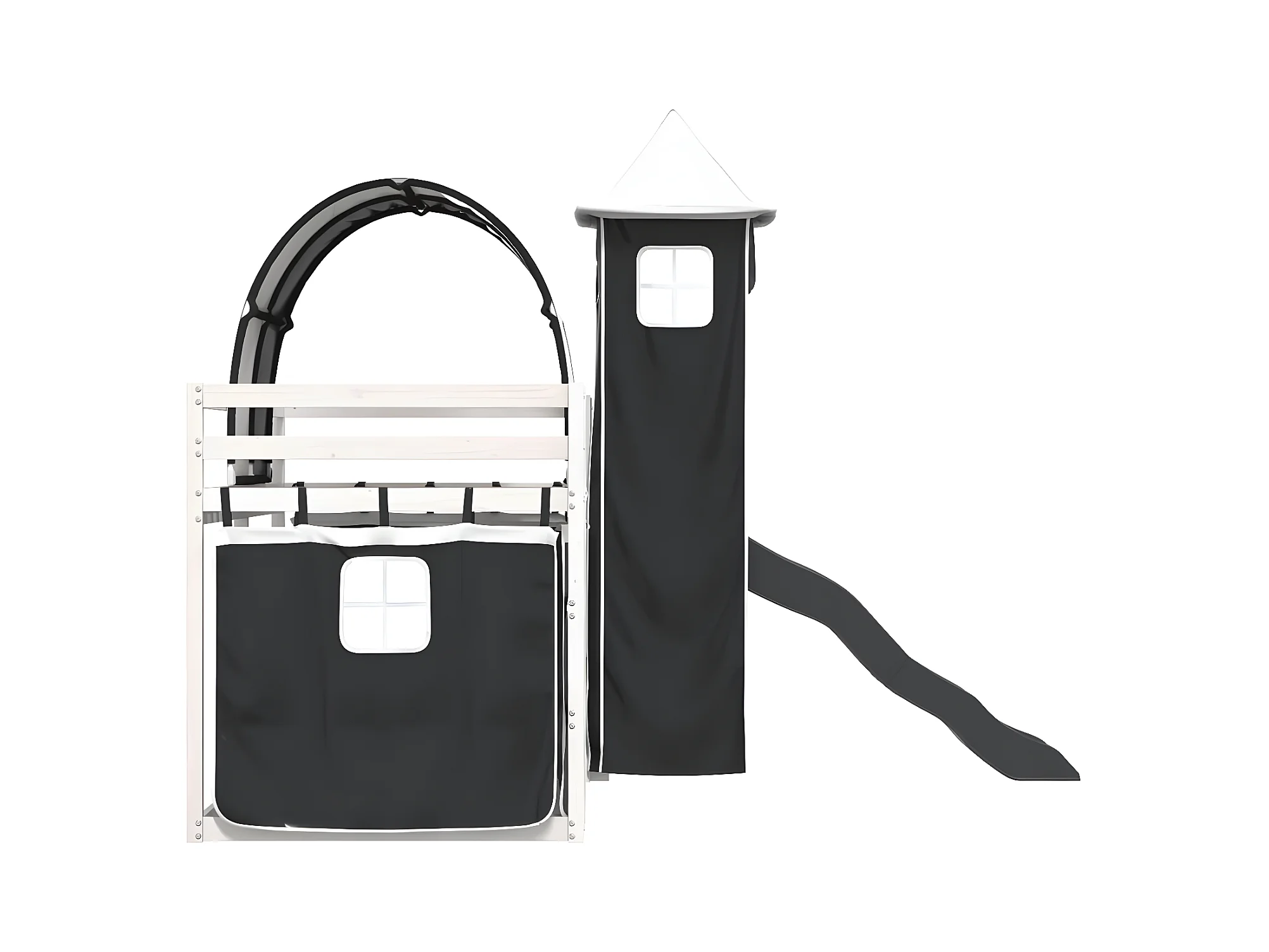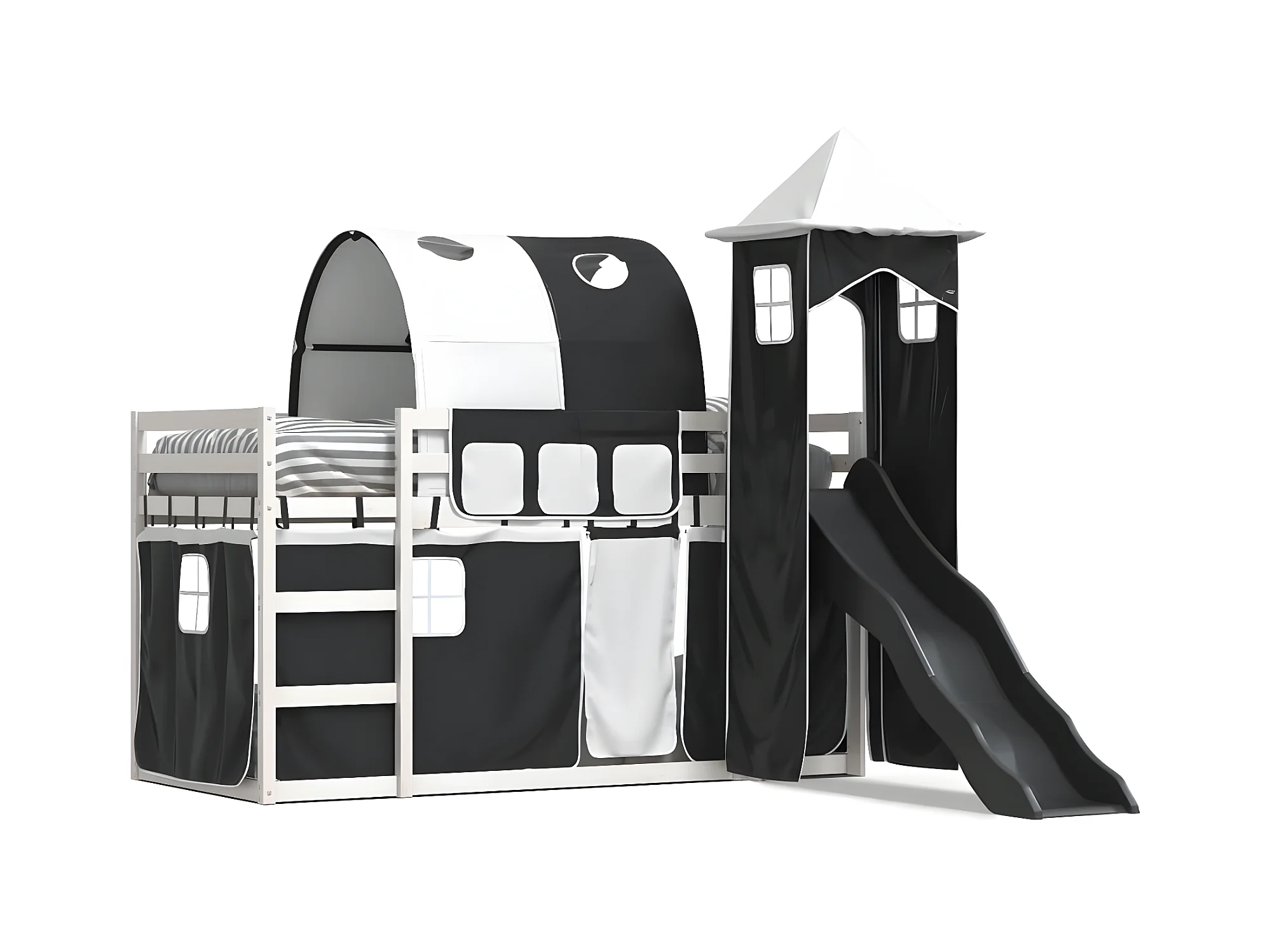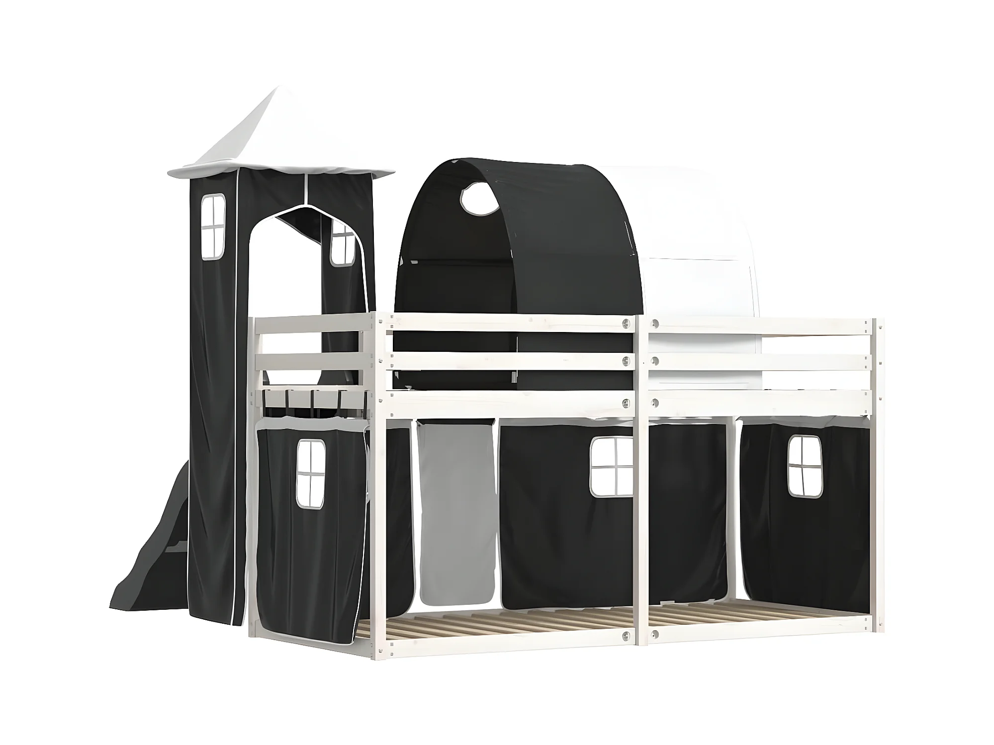 Lit superposé avec toboggan et rideaux blanc et noir 90x190 cm