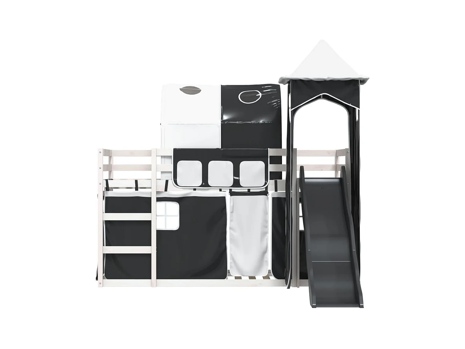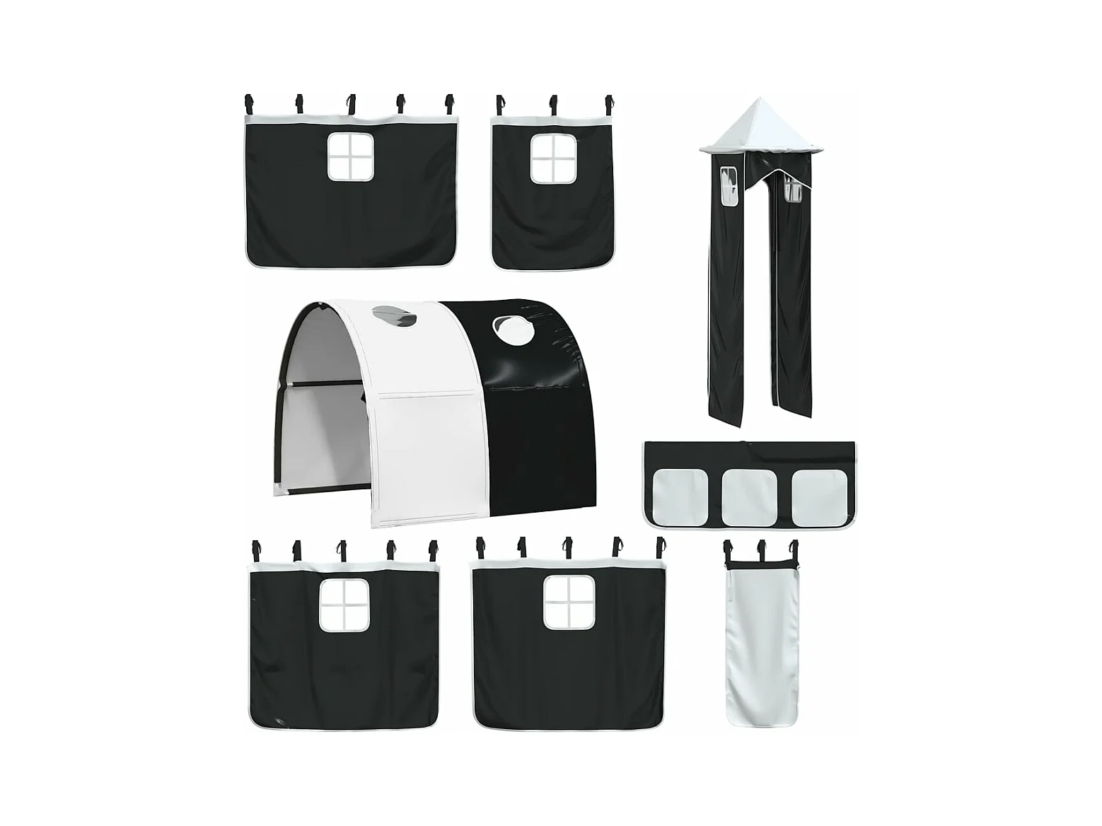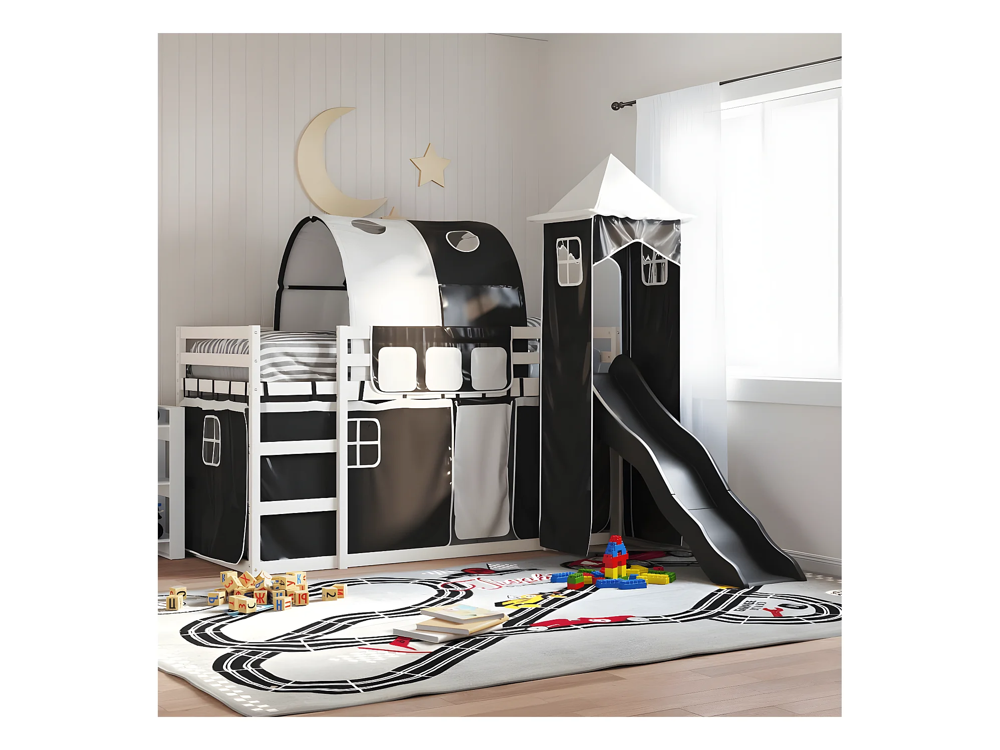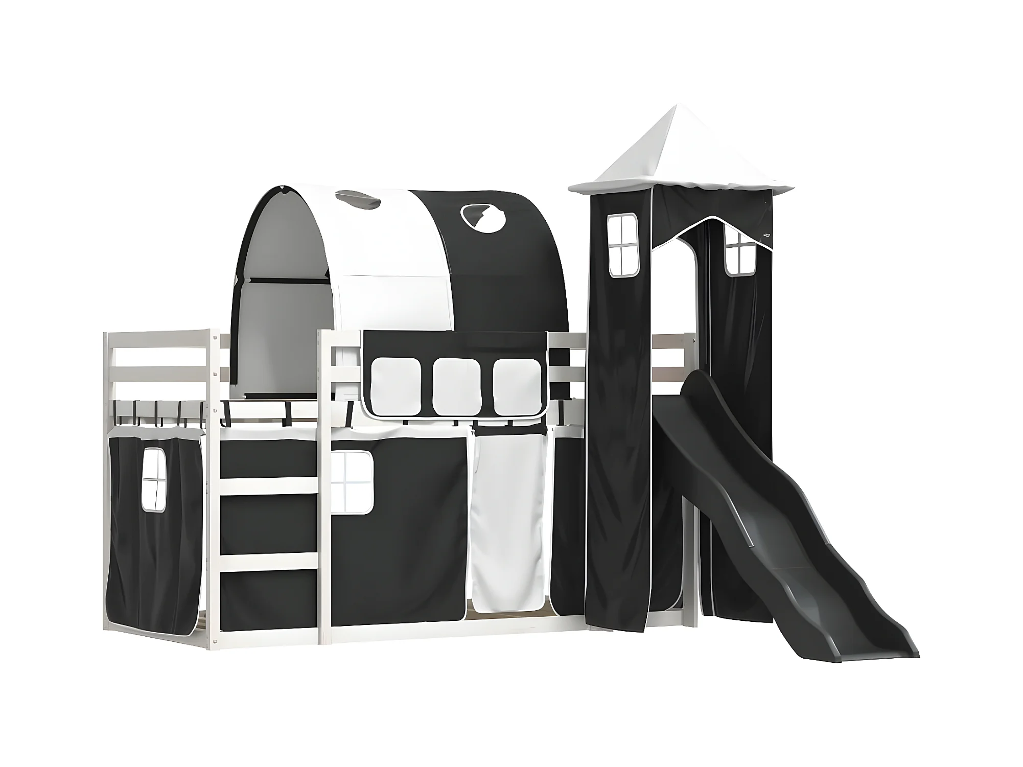 Lit superposé avec toboggan et rideaux blanc et noir 90x190 cm