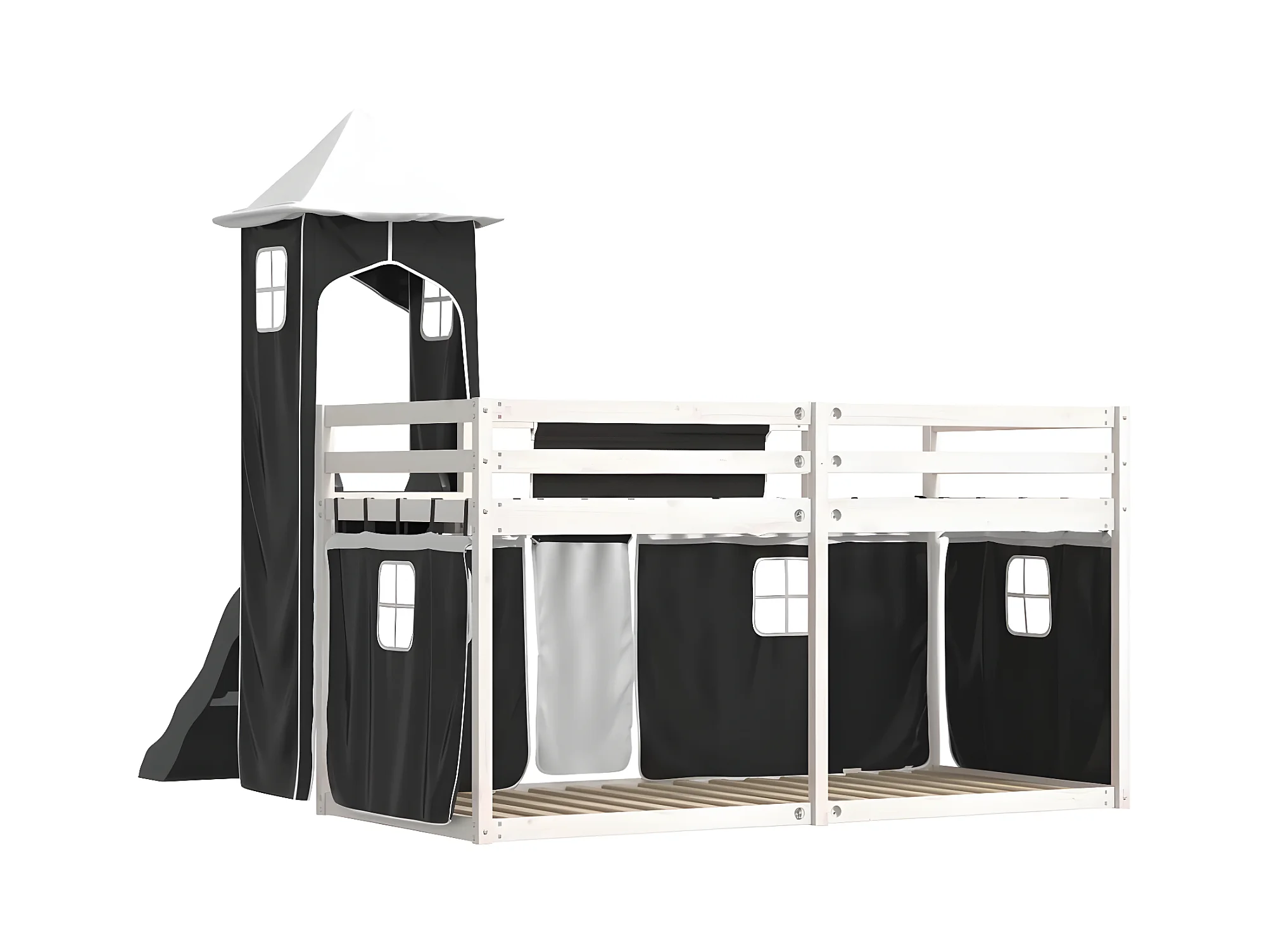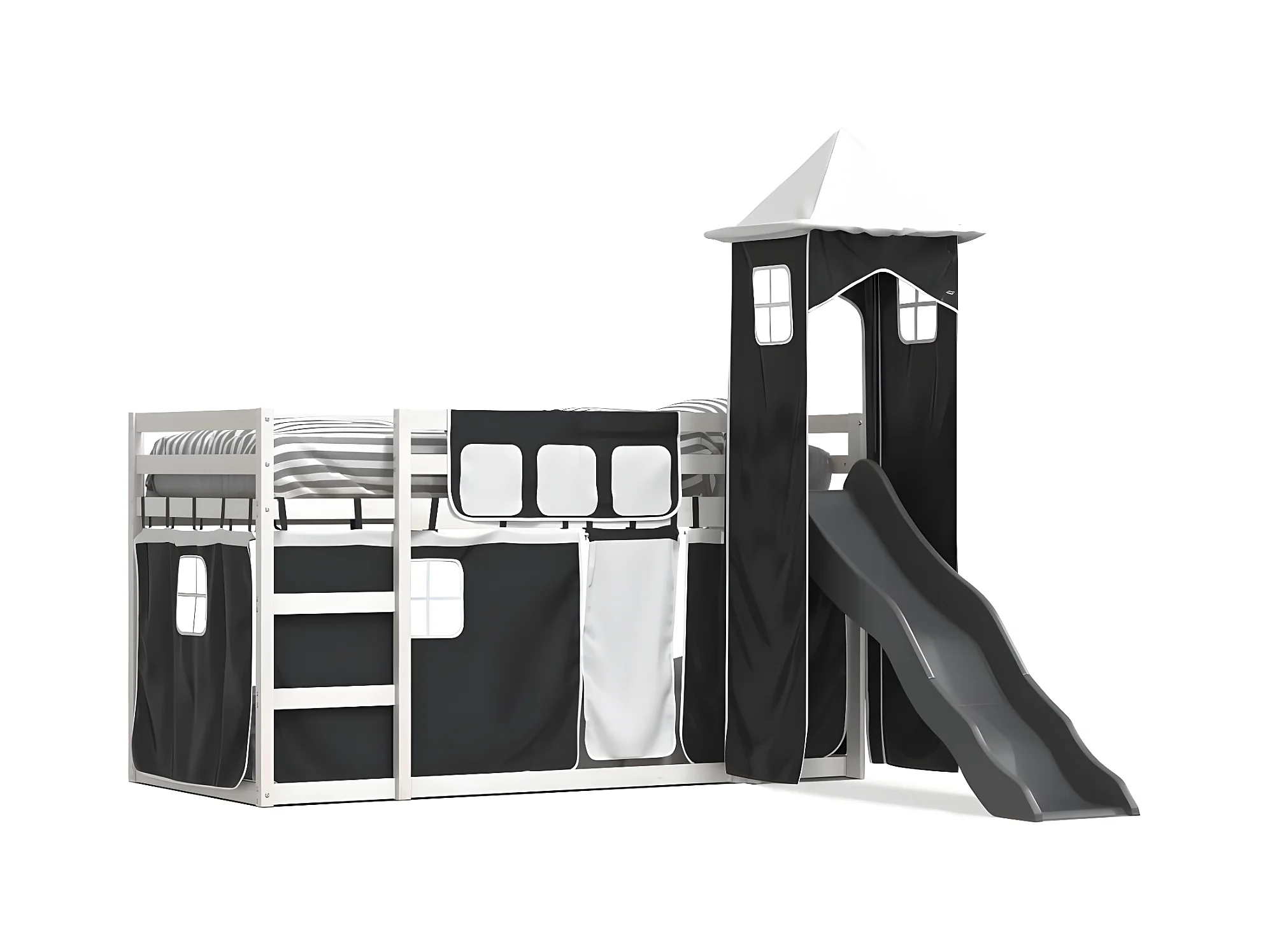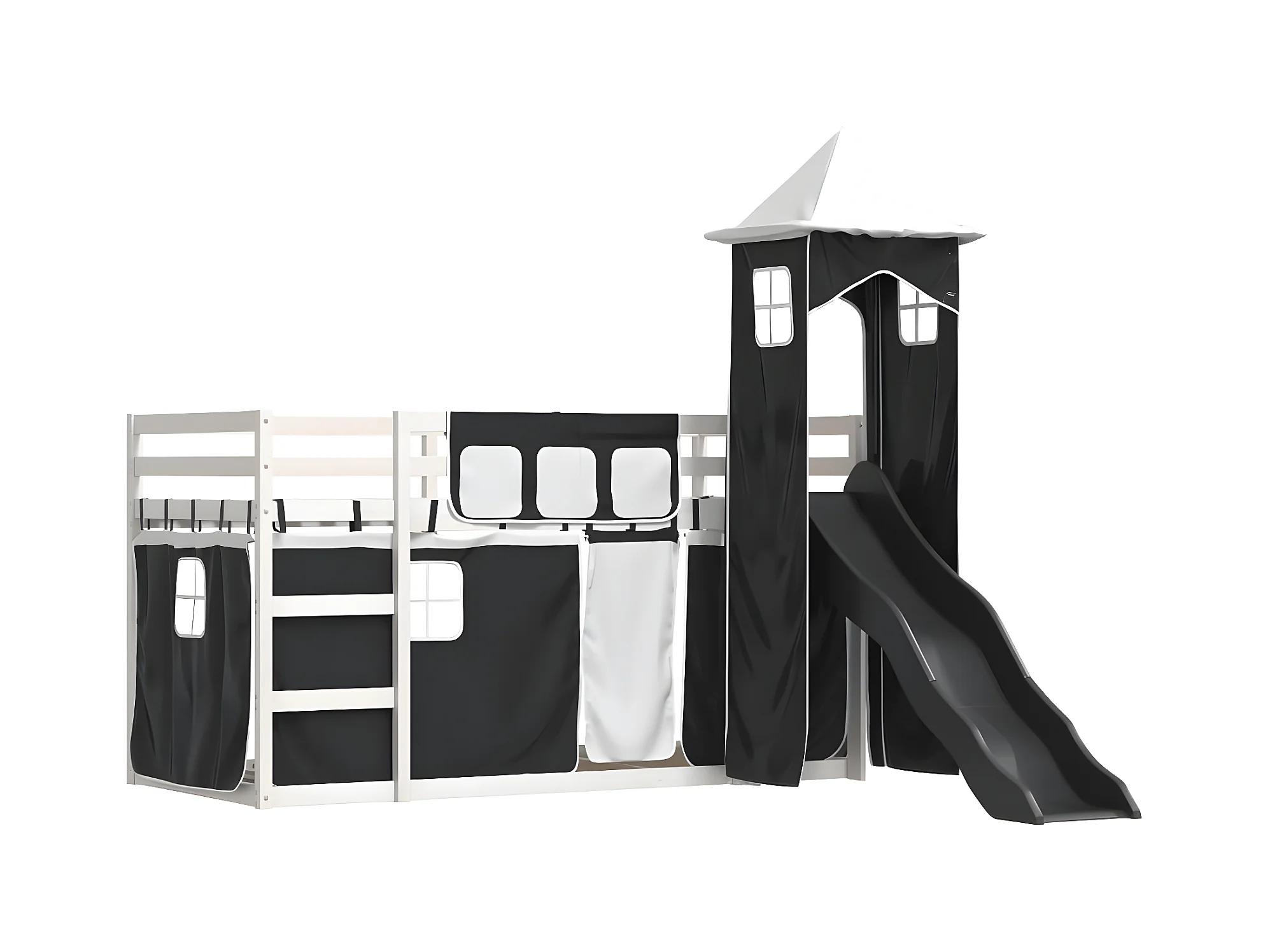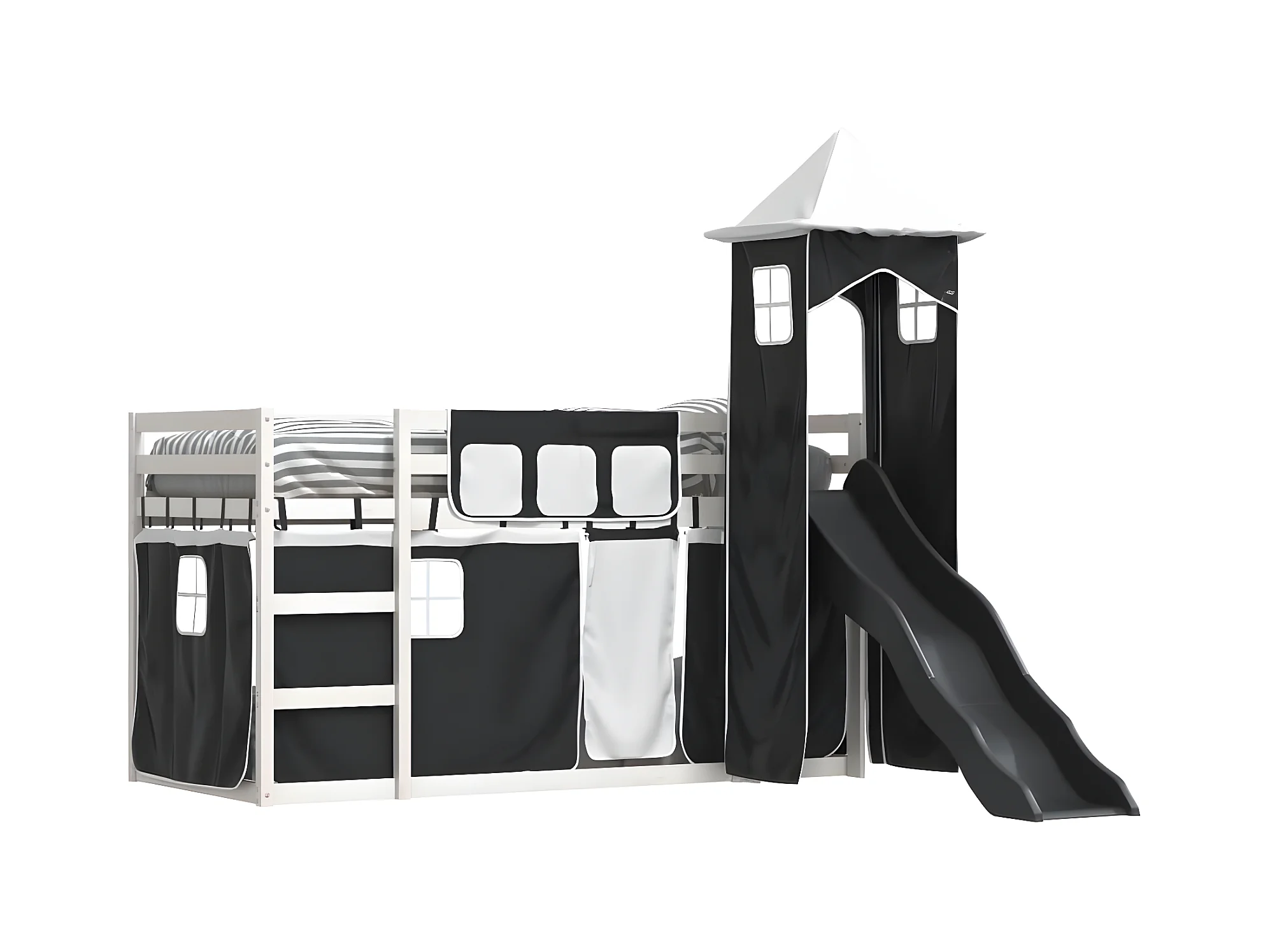 Lit superposé avec toboggan et rideaux blanc et noir 90x190 cm