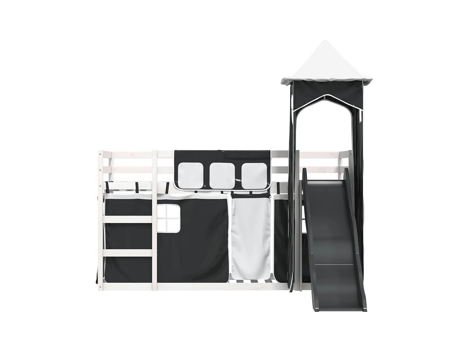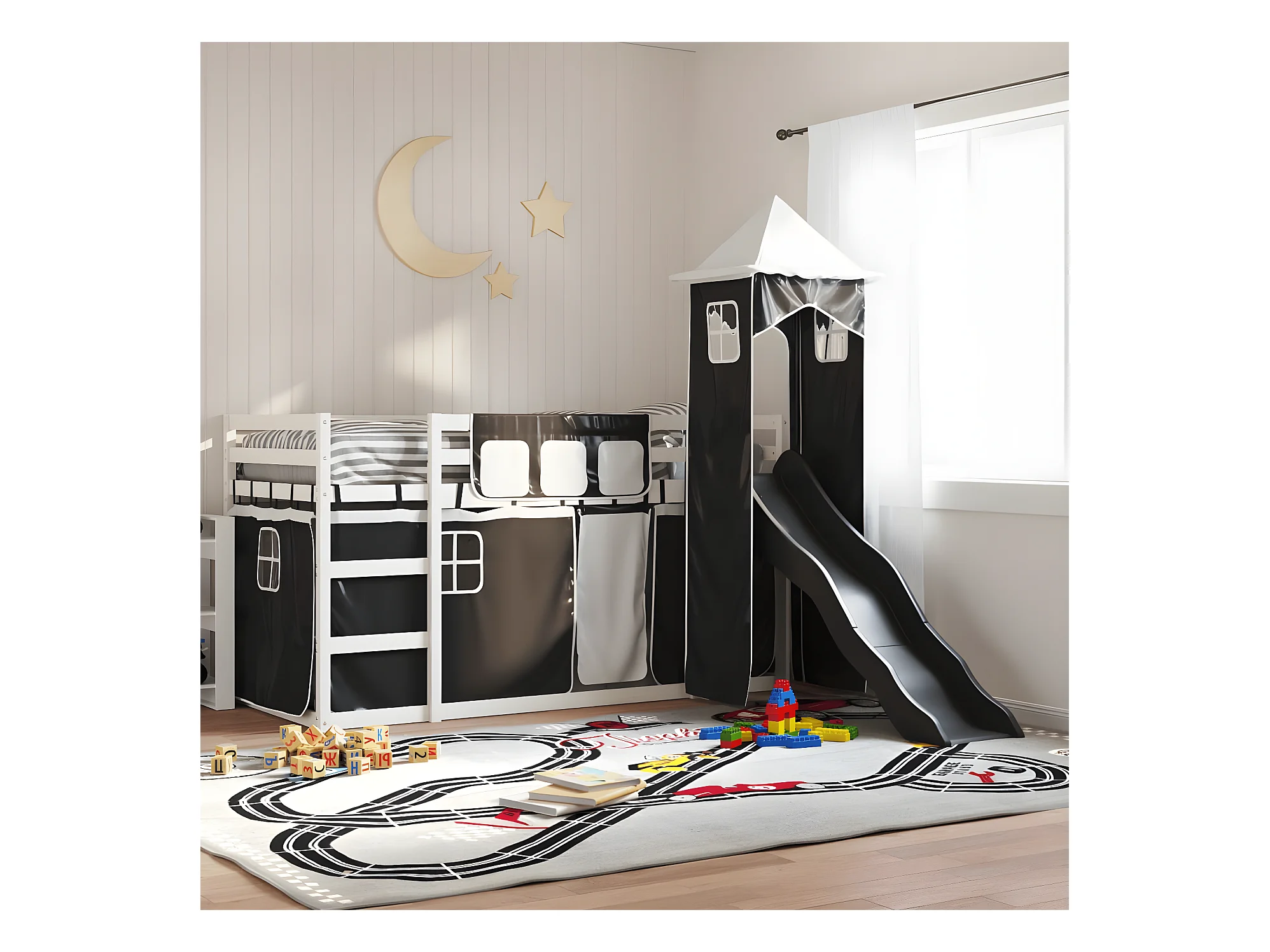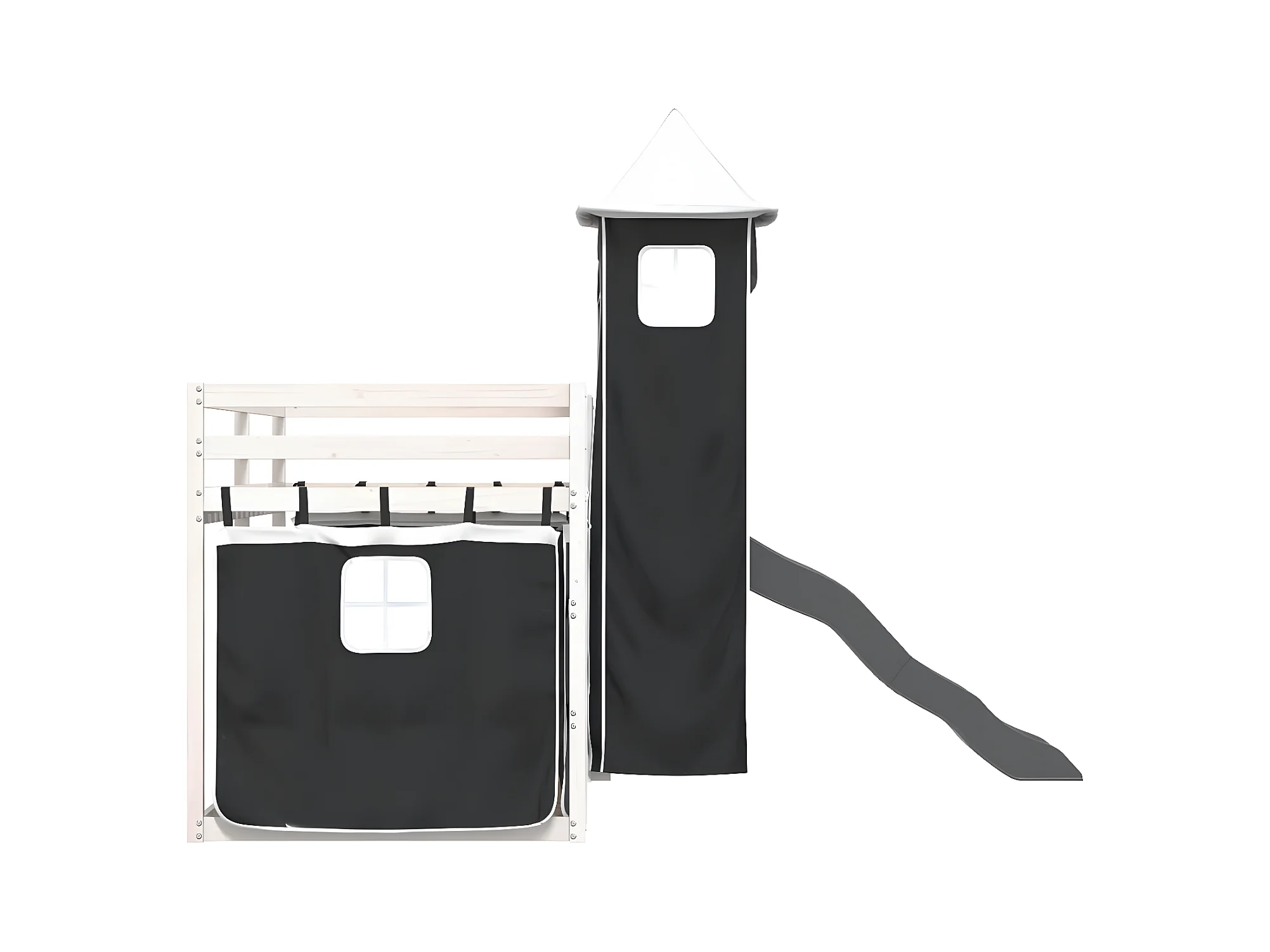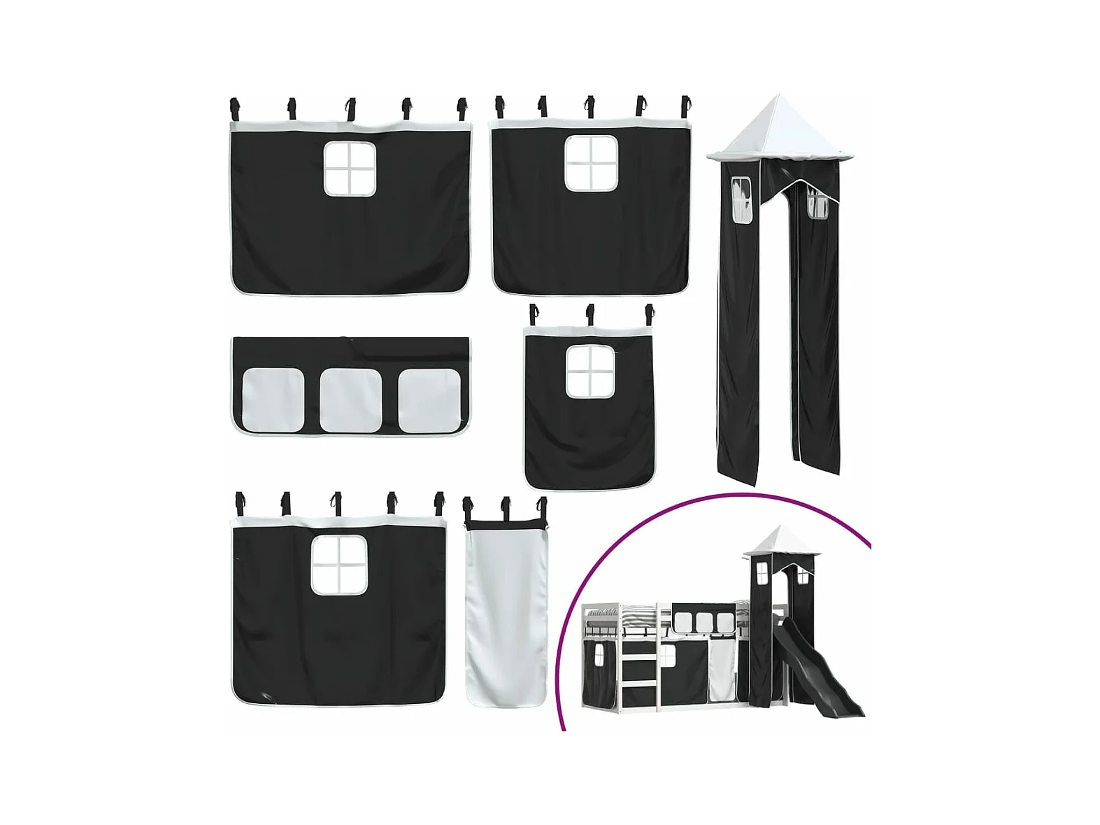 Lit superposé avec toboggan et rideaux blanc et noir 90x190 cm