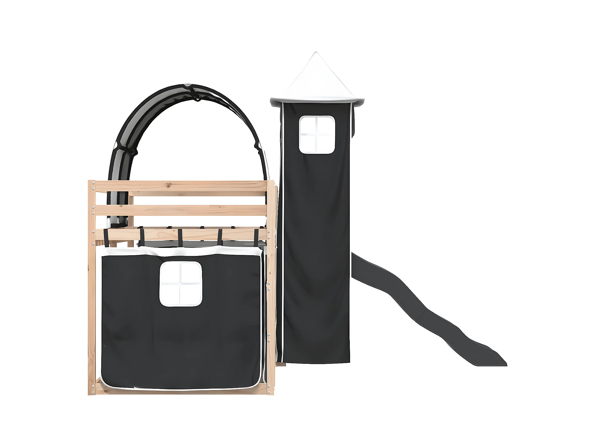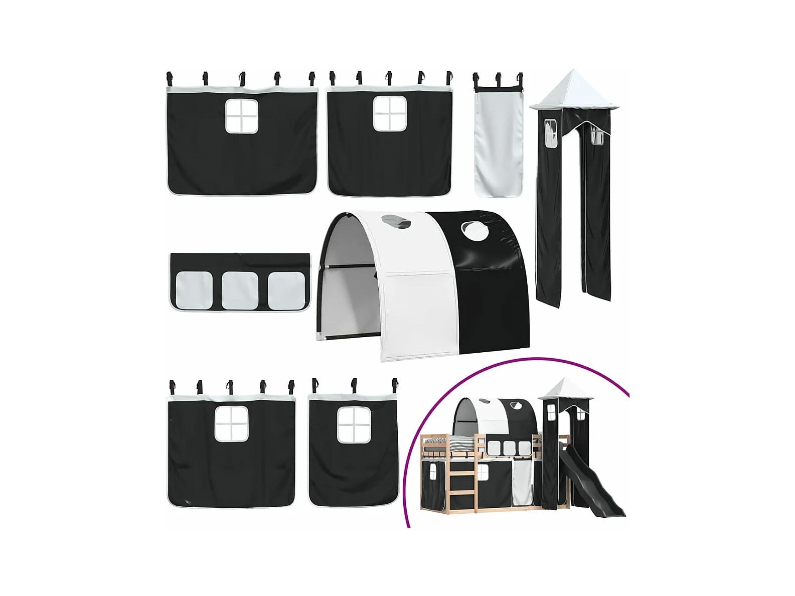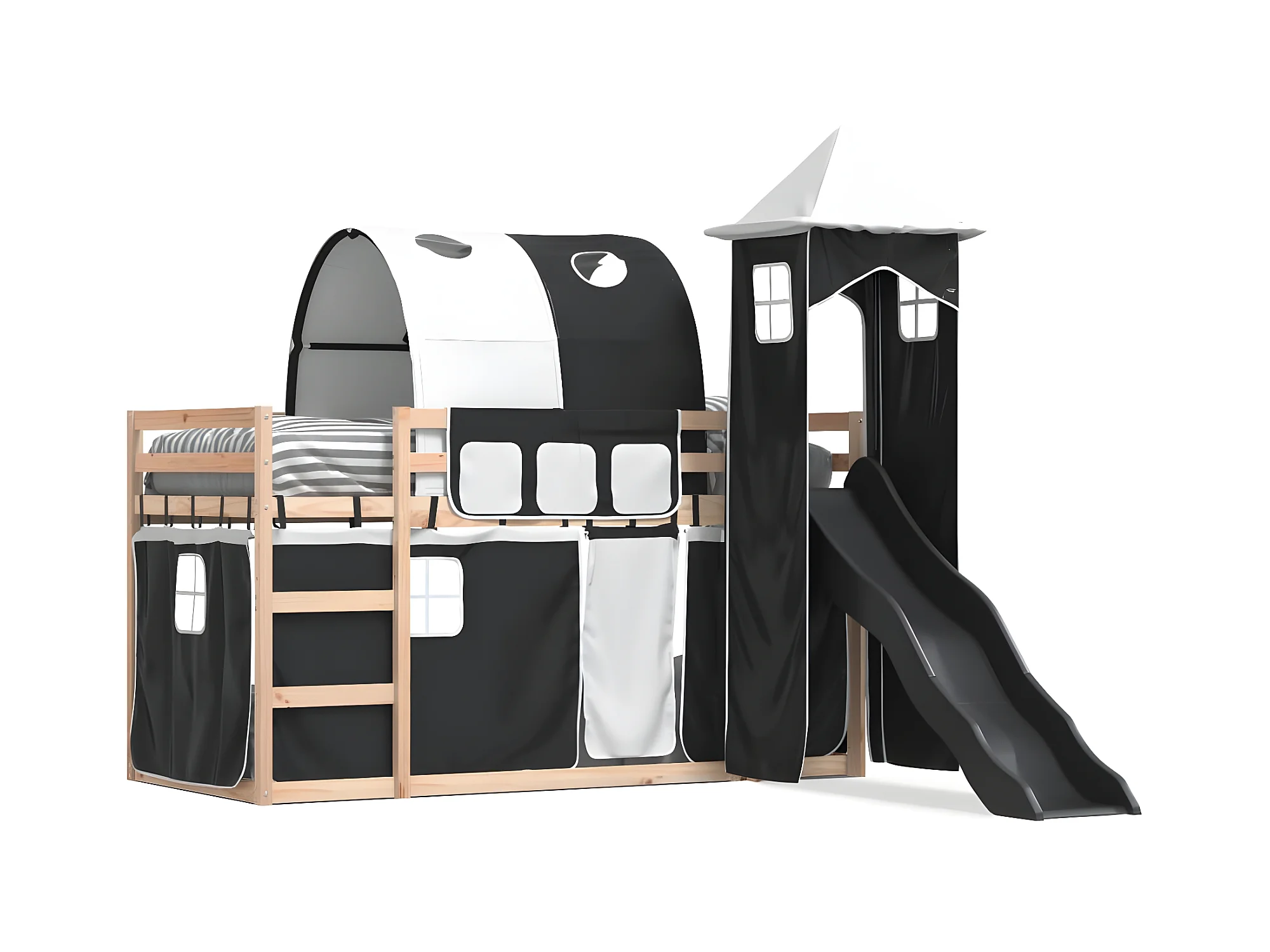 Lit superposé avec toboggan et rideaux blanc et noir 90x190 cm