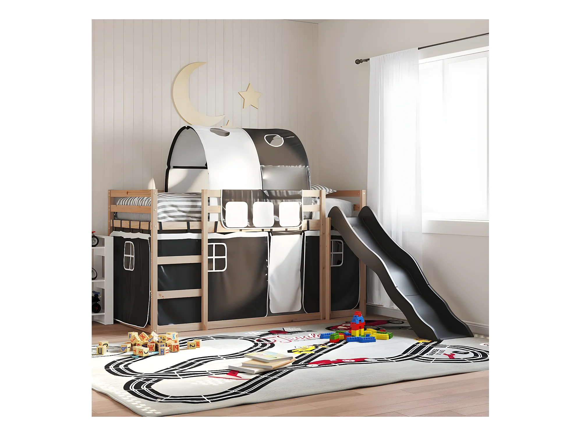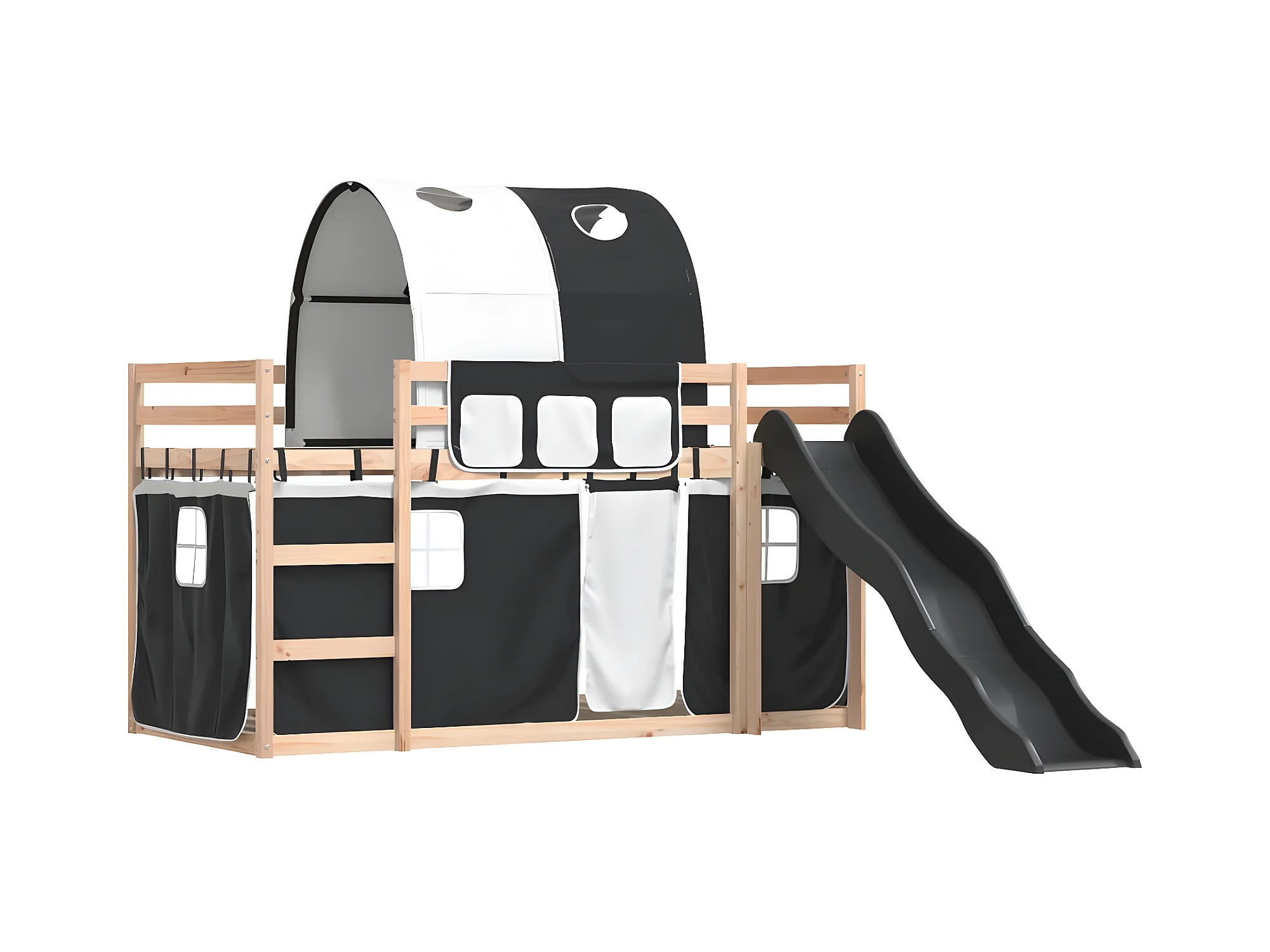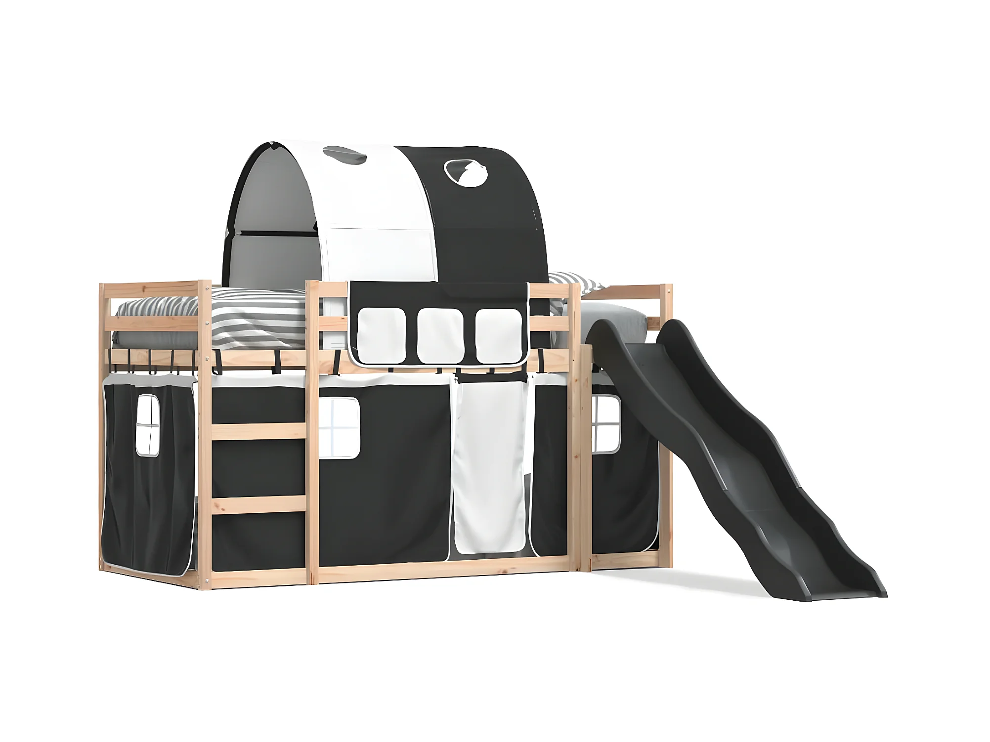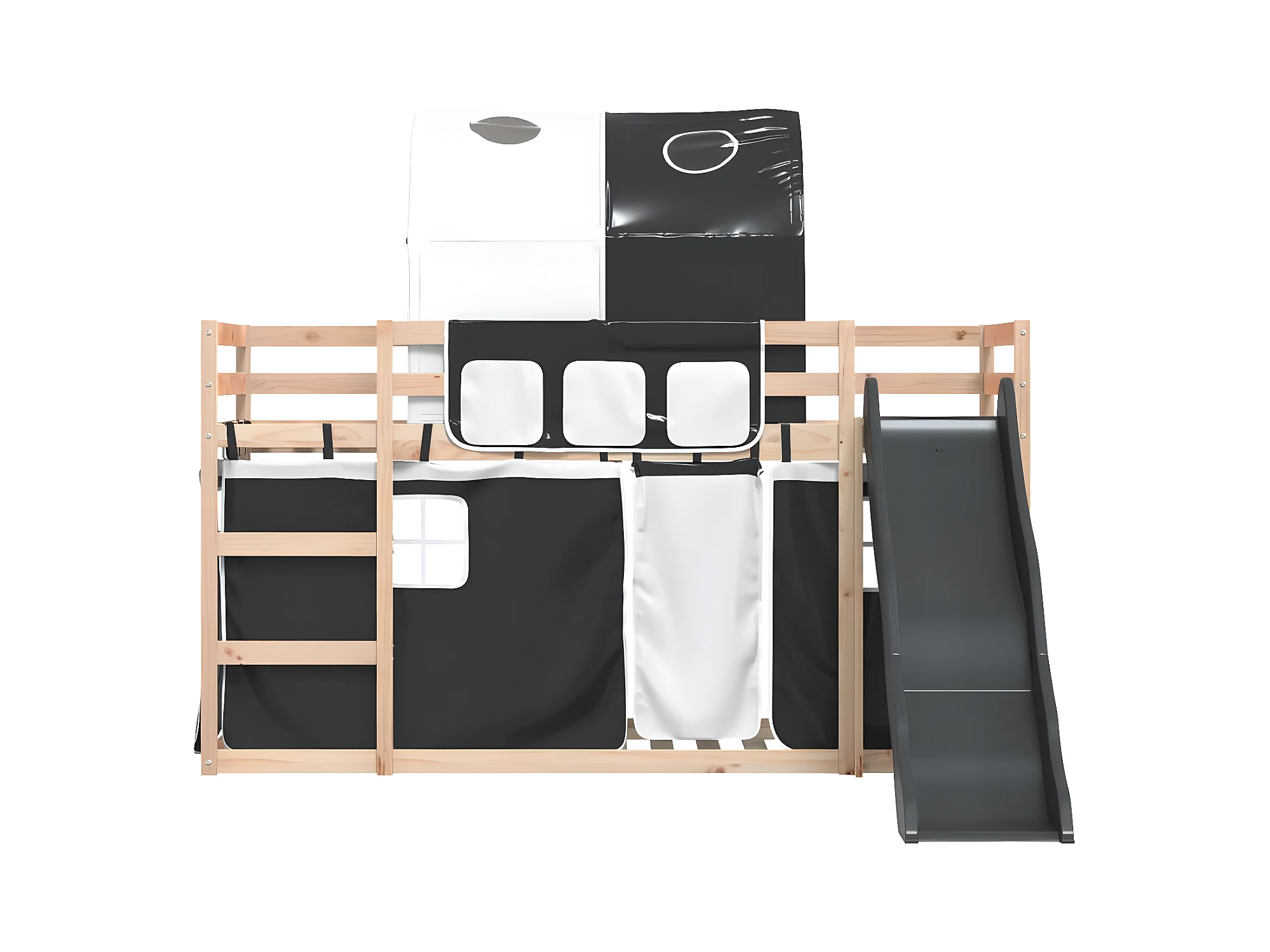 Lit superposé avec toboggan et rideaux blanc et noir 90x190 cm