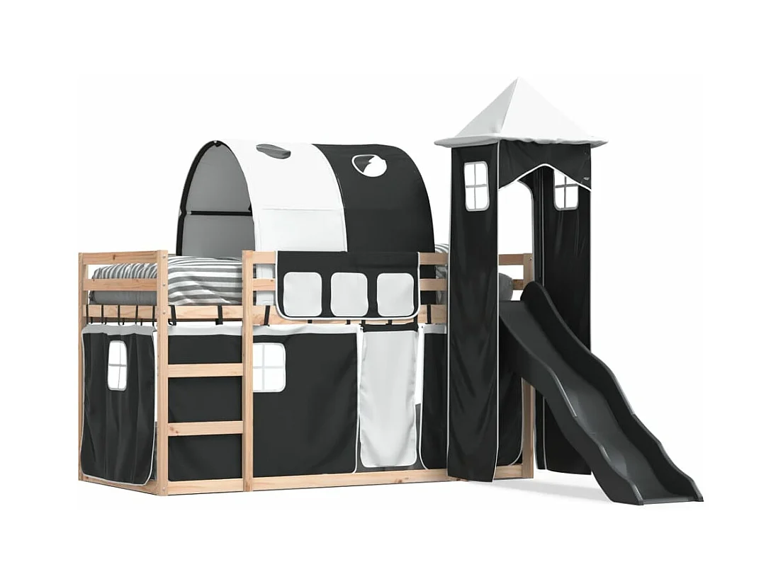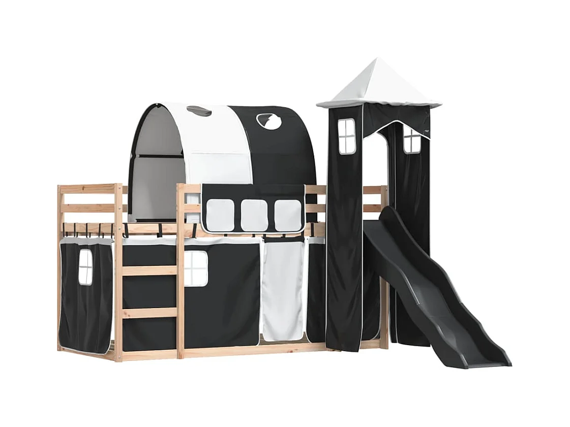 Lit superposé avec toboggan et rideaux blanc et noir 90x190 cm FR68052
