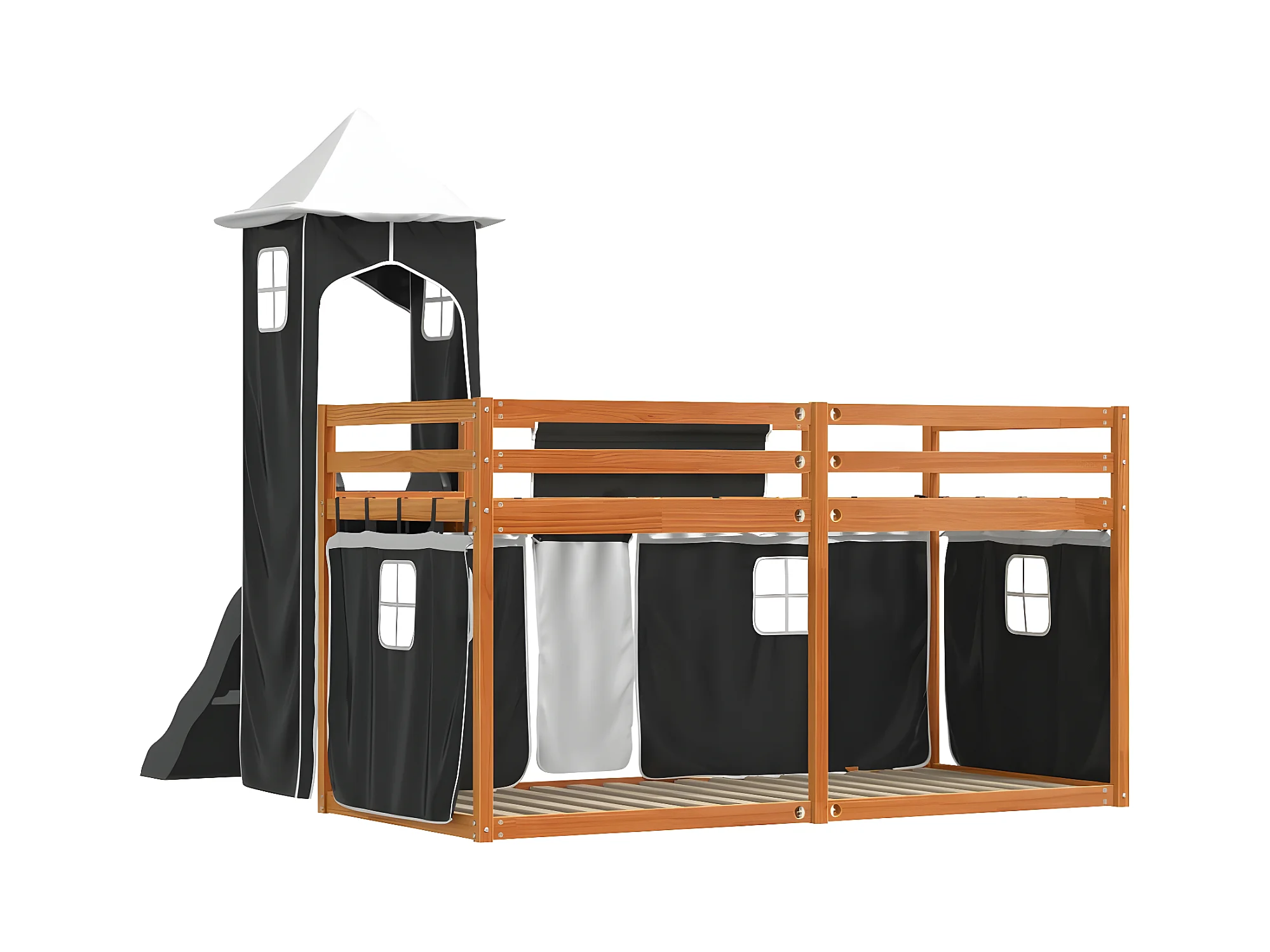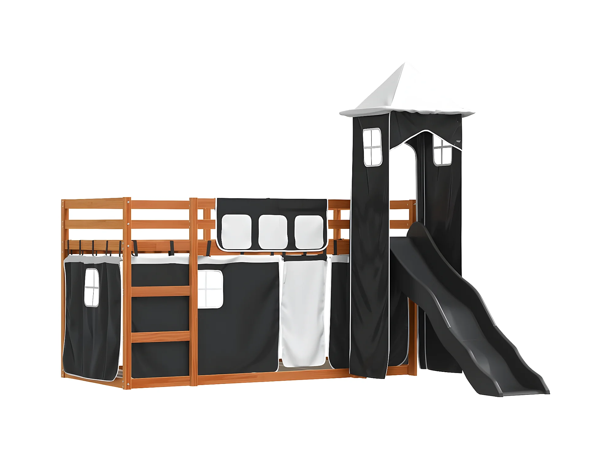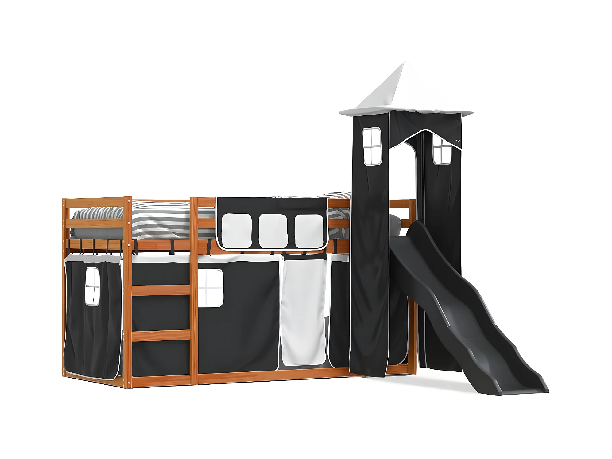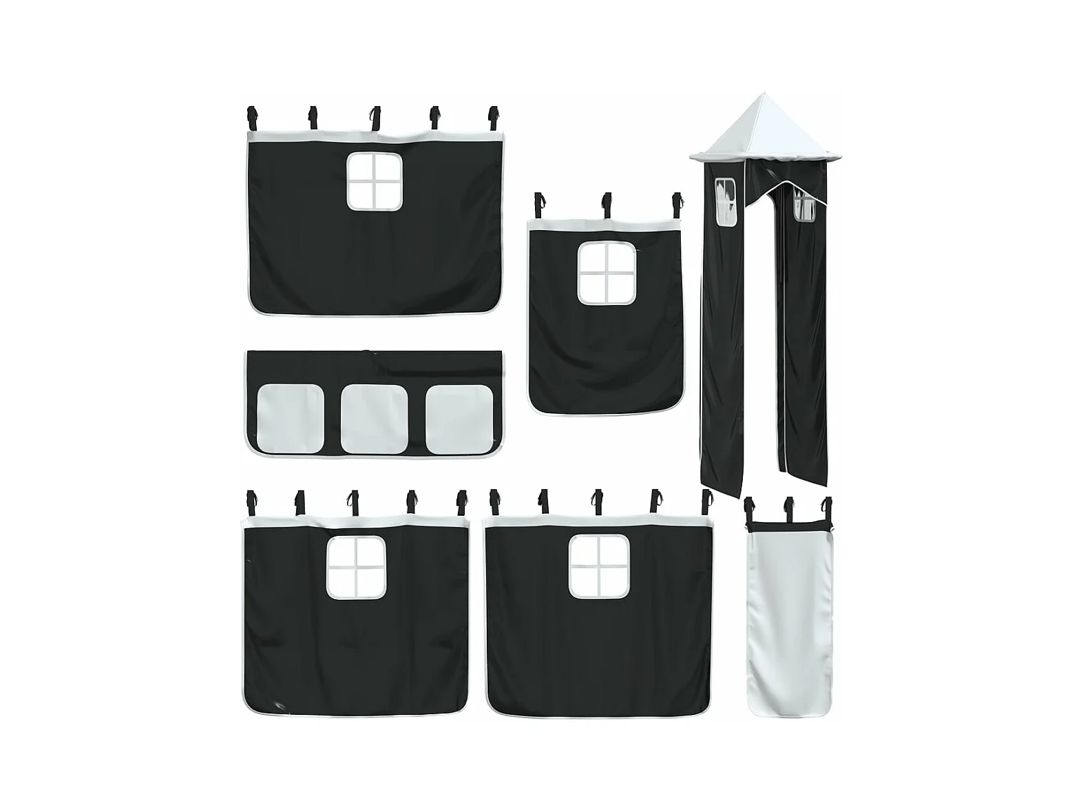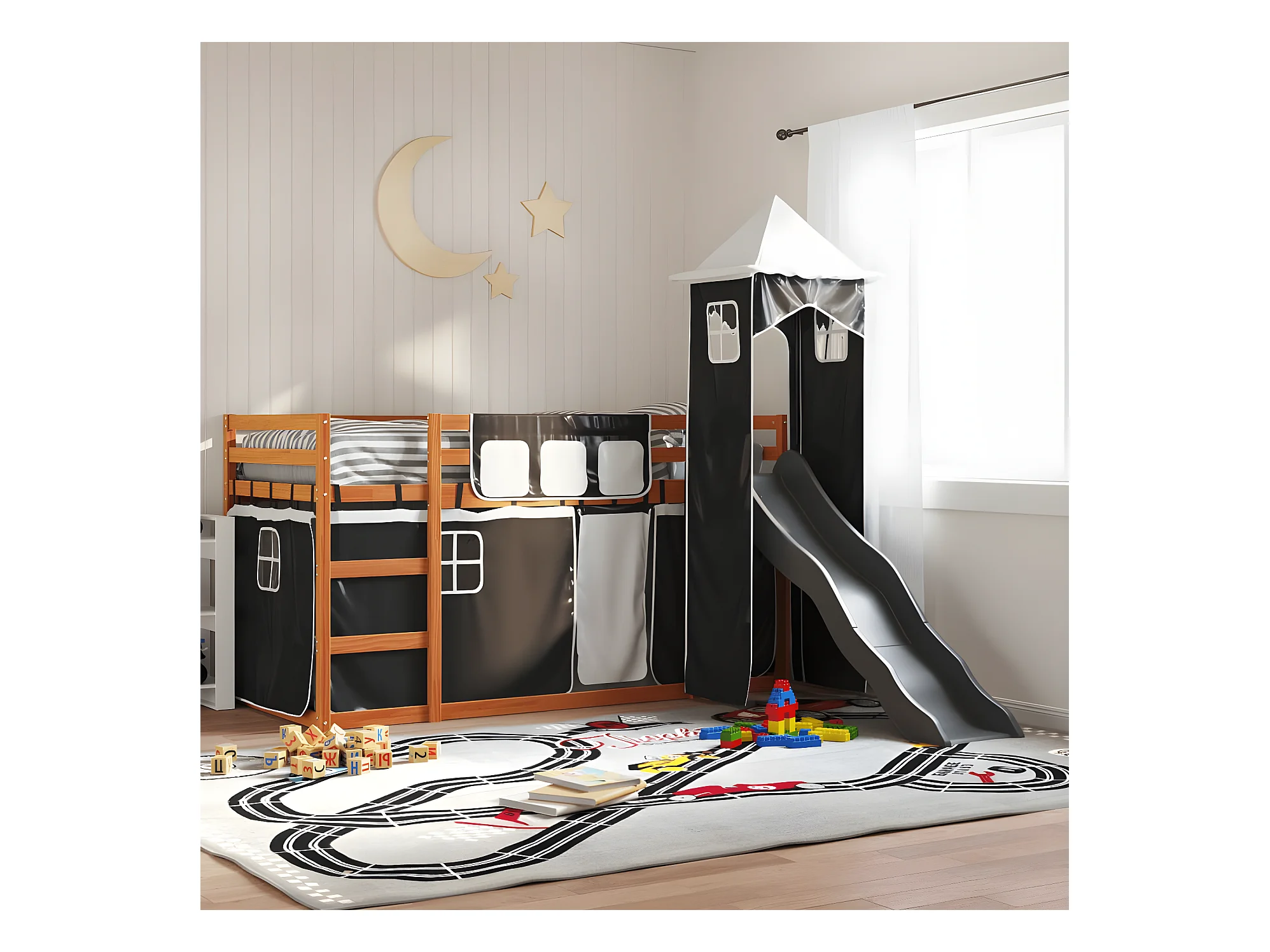 Lit superposé avec toboggan et rideaux blanc et noir 90x200 cm
