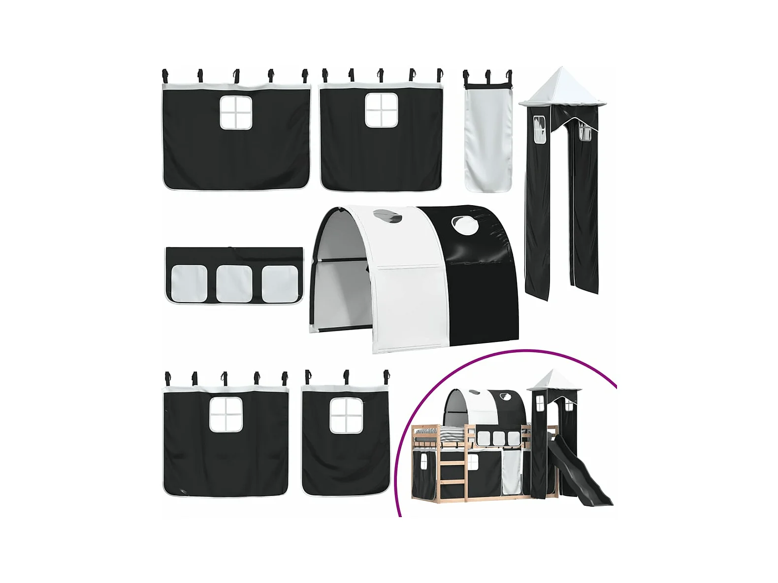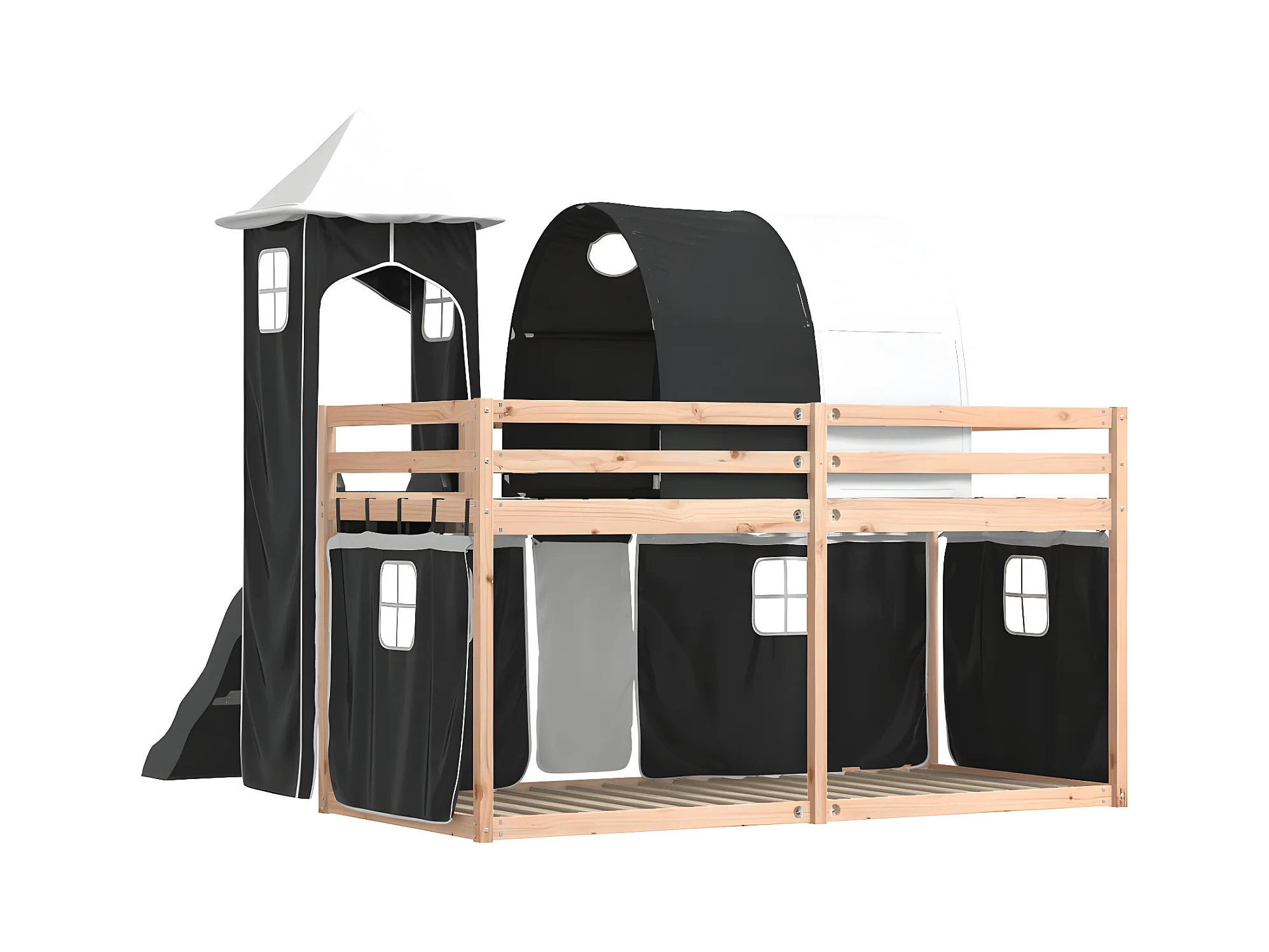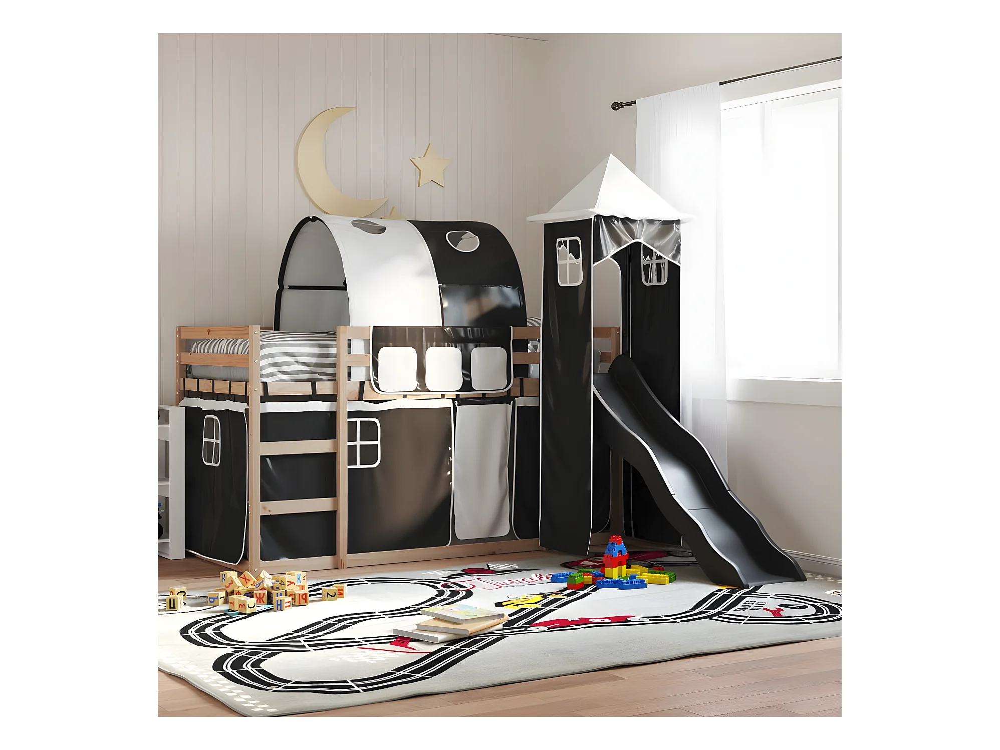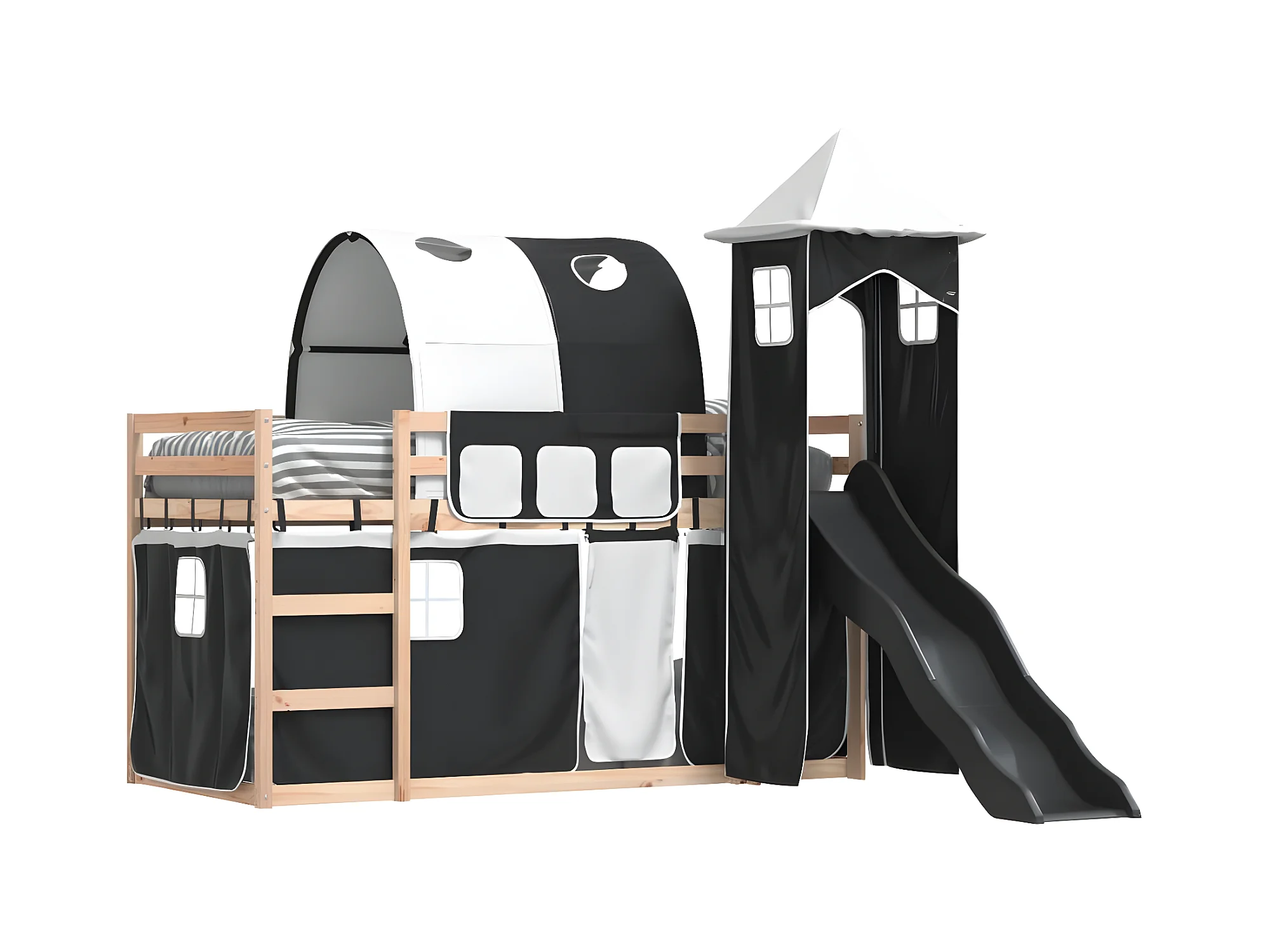 Lit superposé avec toboggan et rideaux blanc et noir 90x200 cm