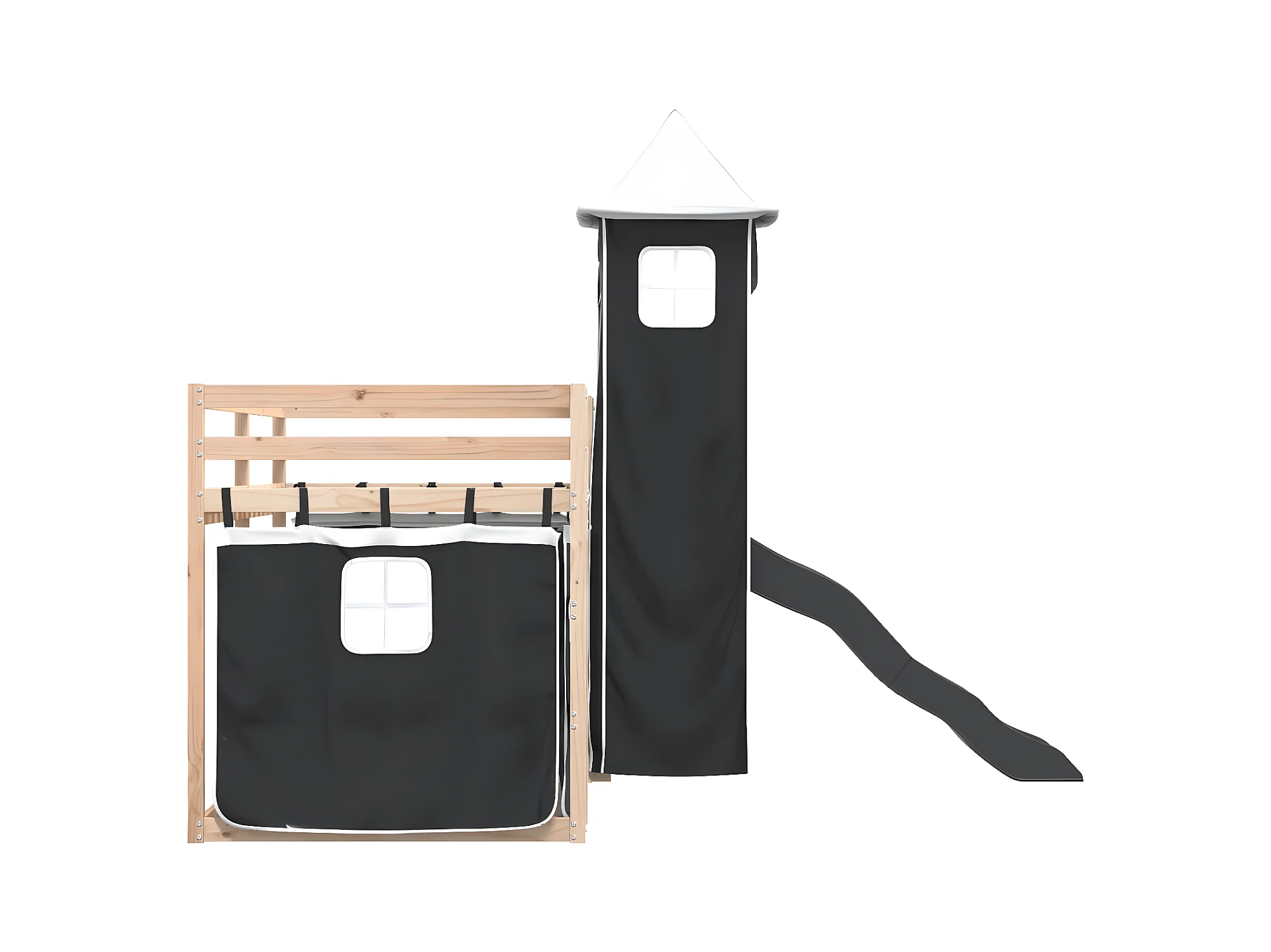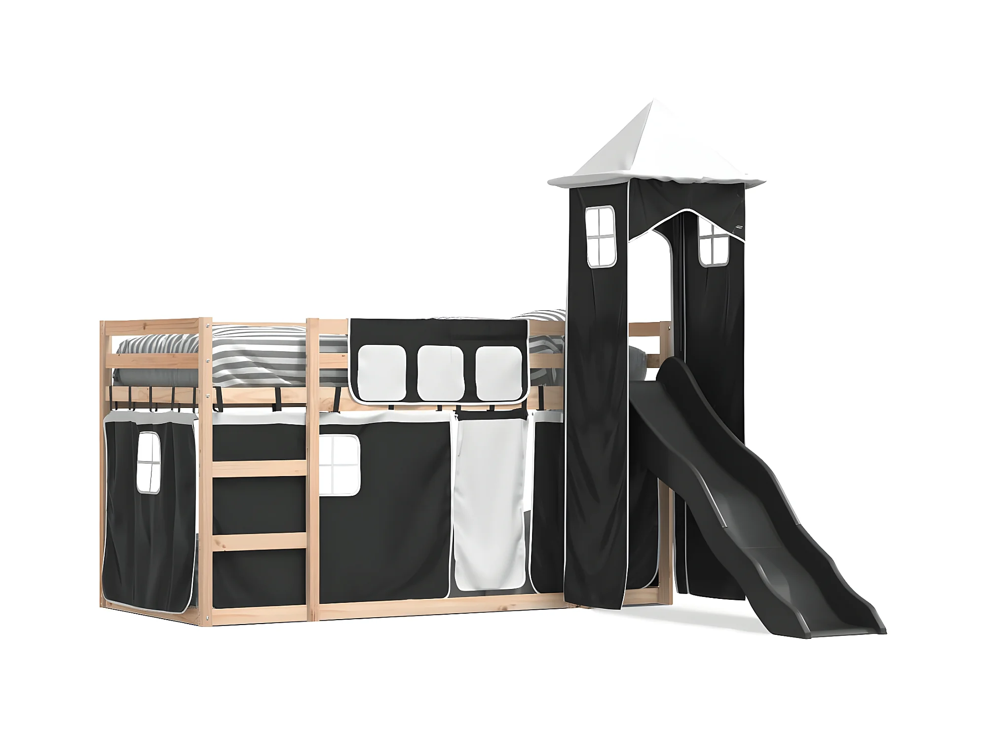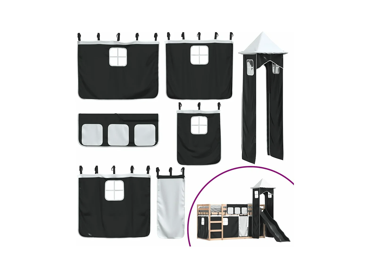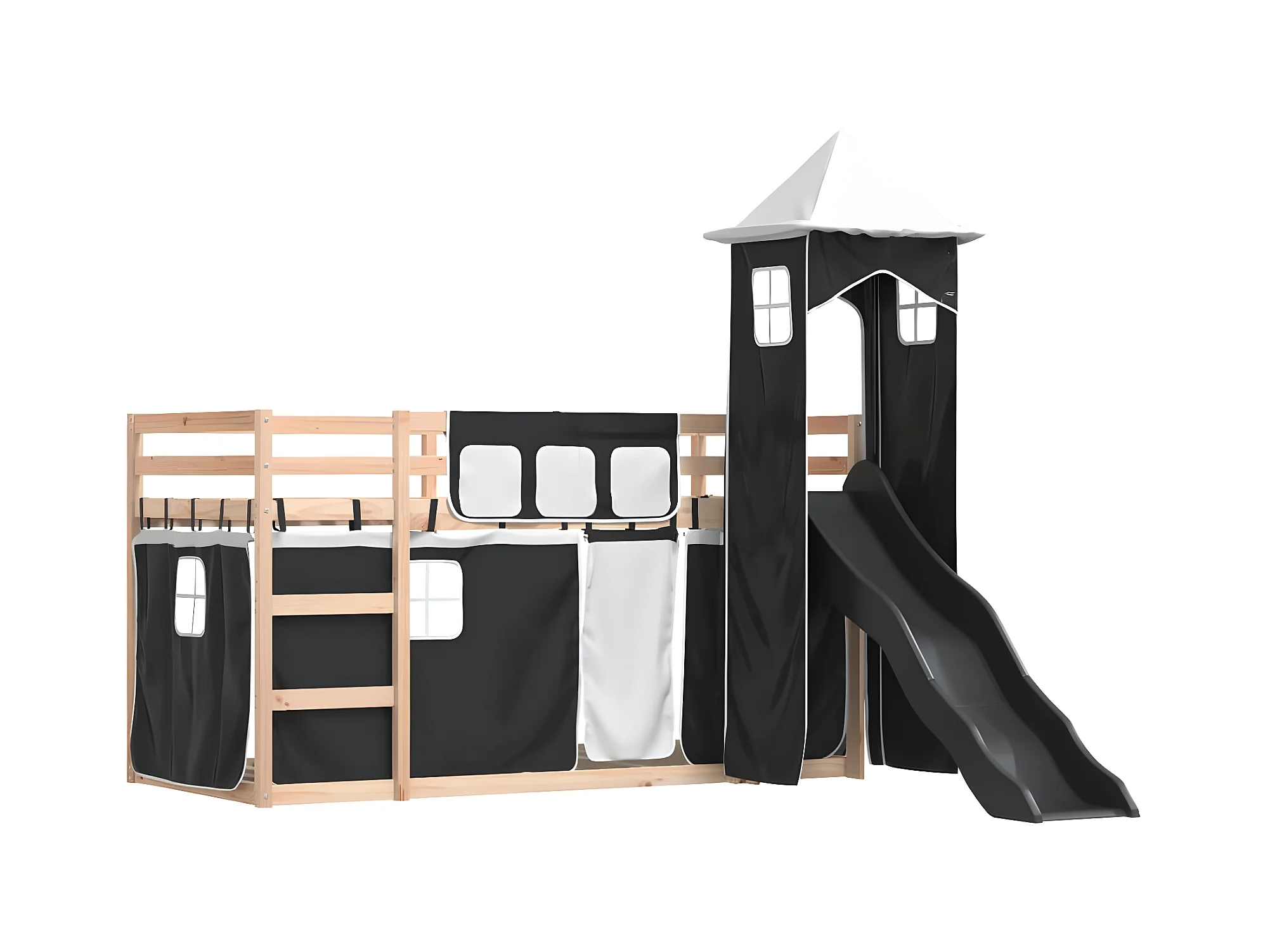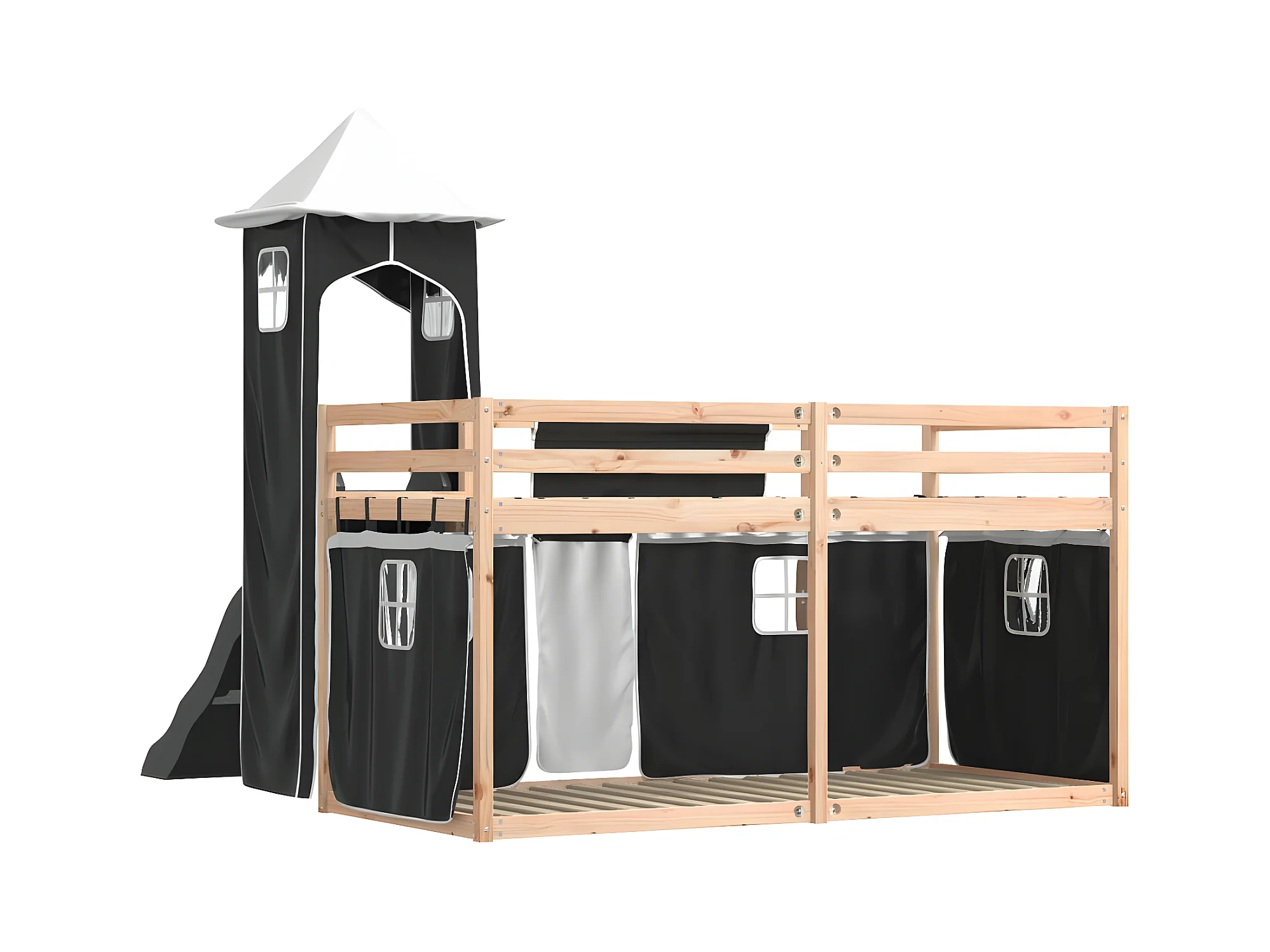 Lit superposé avec toboggan et rideaux blanc et noir 90x200 cm
