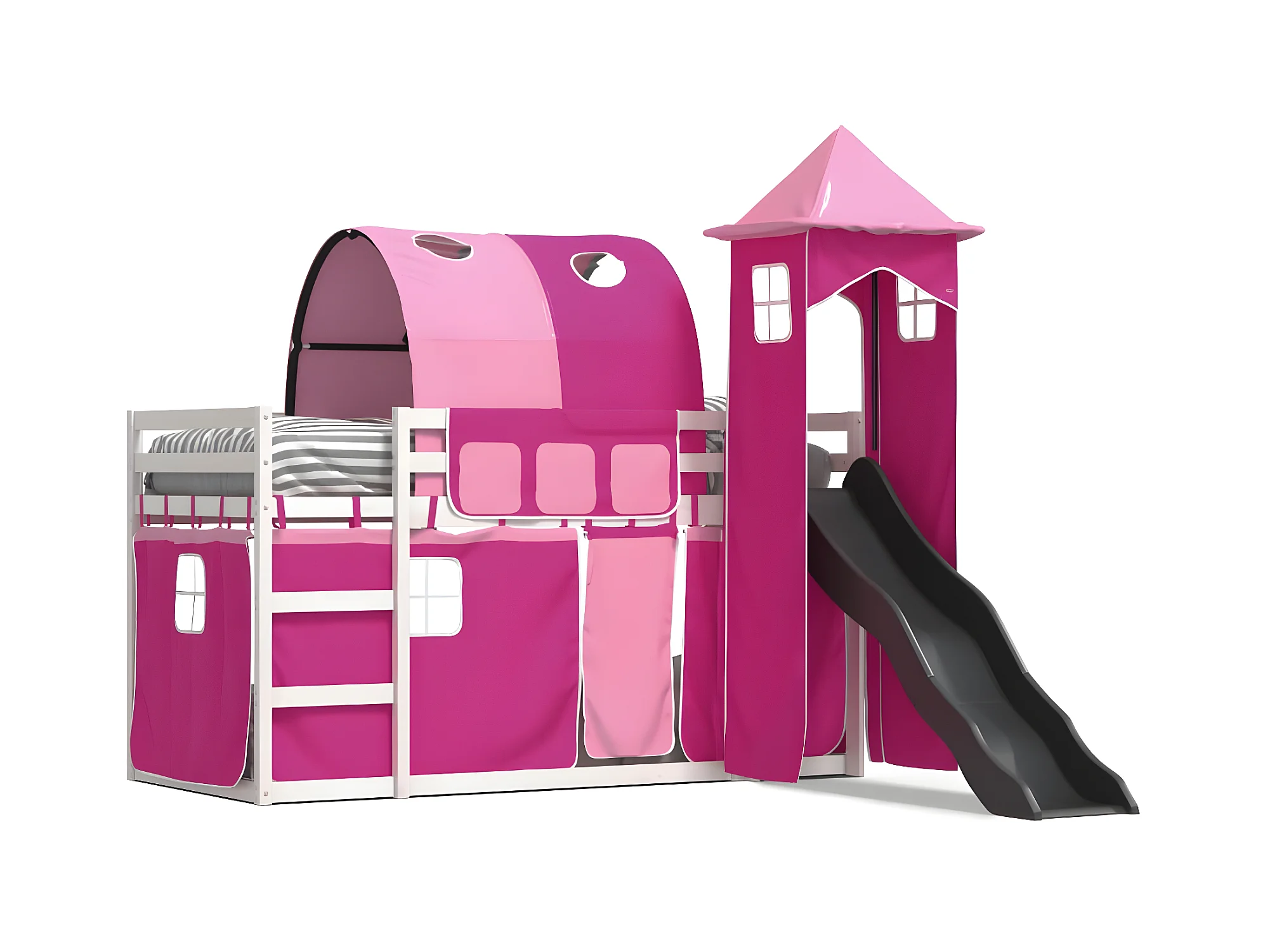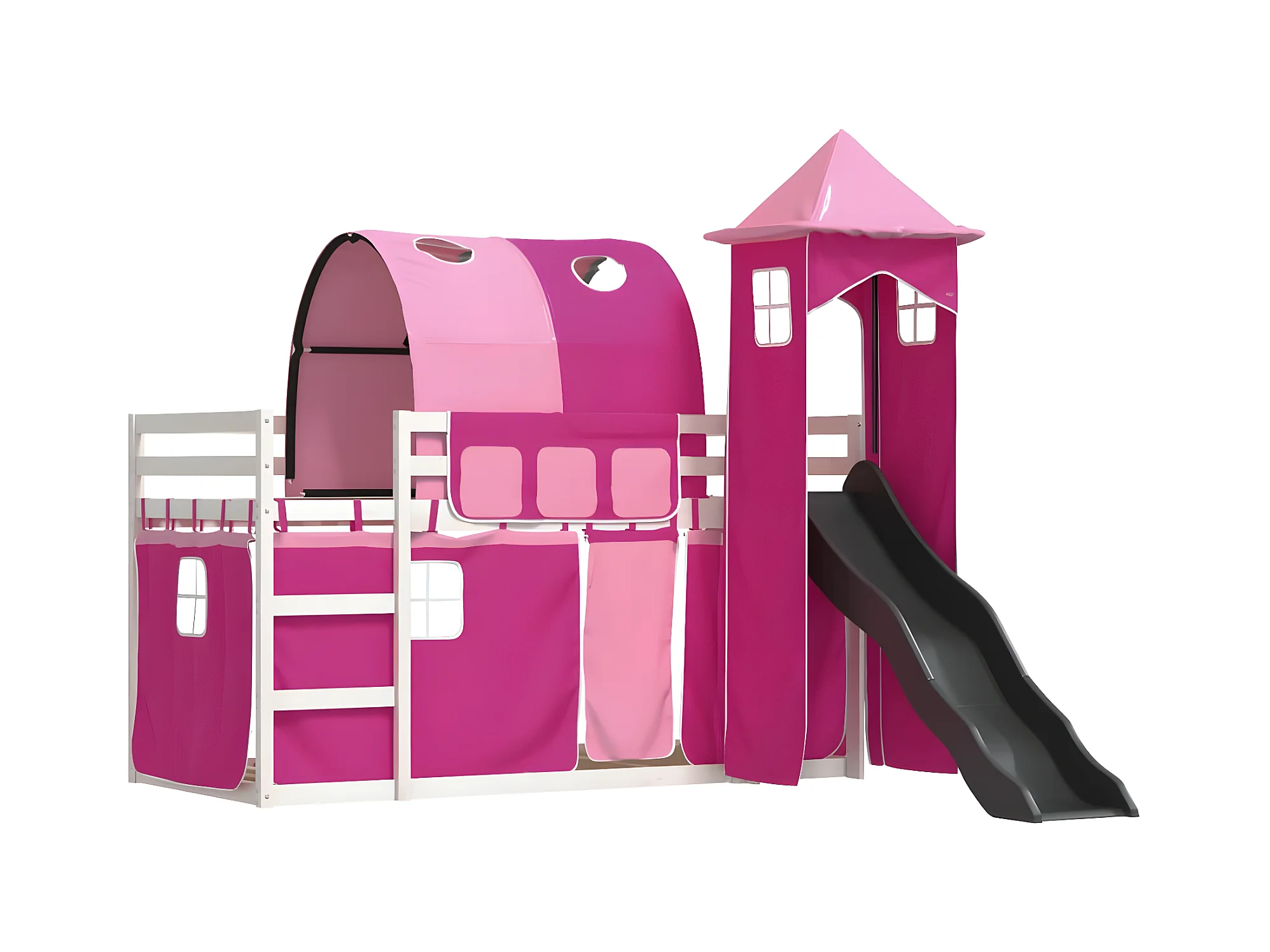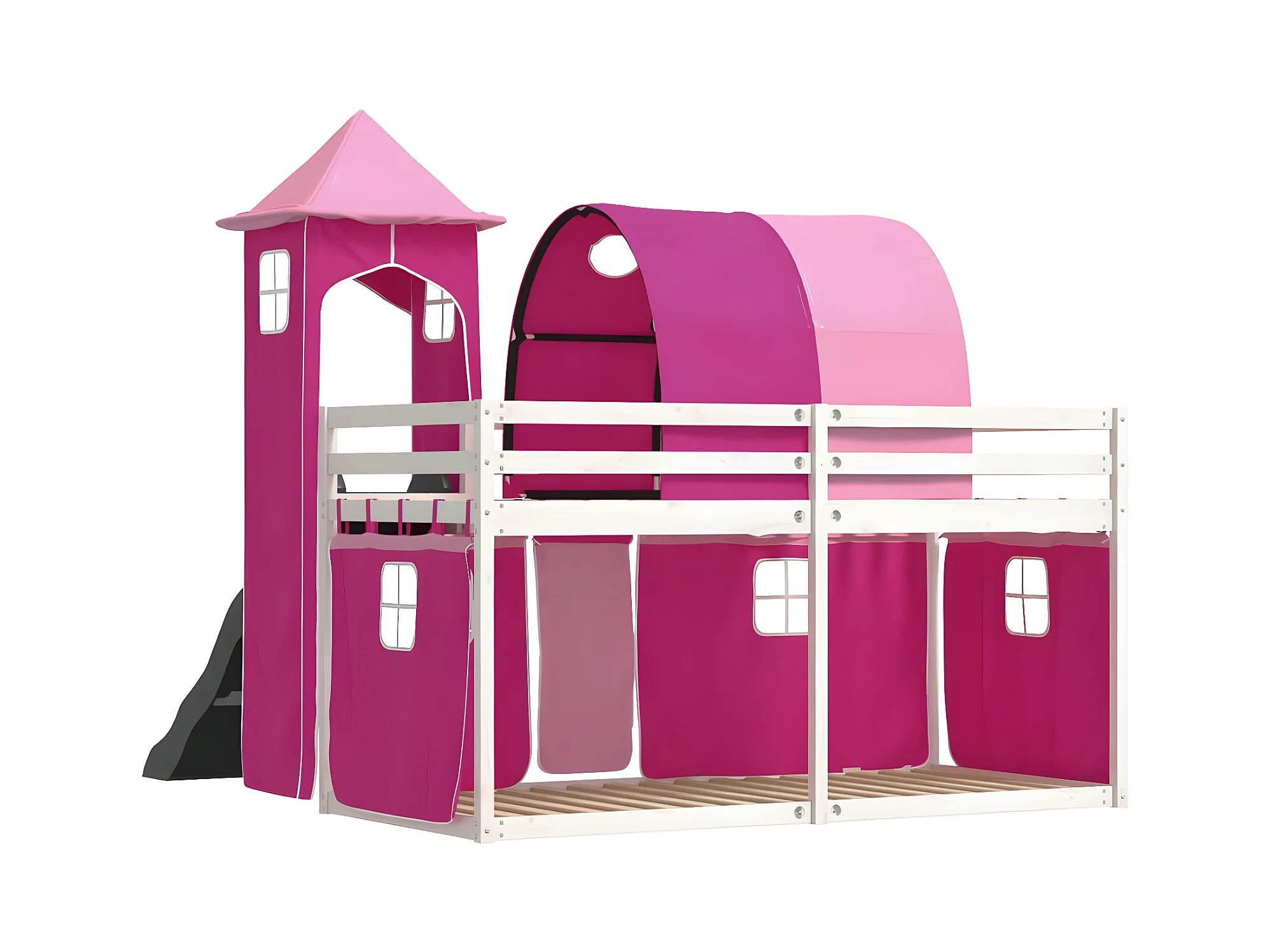 Lit superposé avec toboggan et rideaux rose 90x190 cm