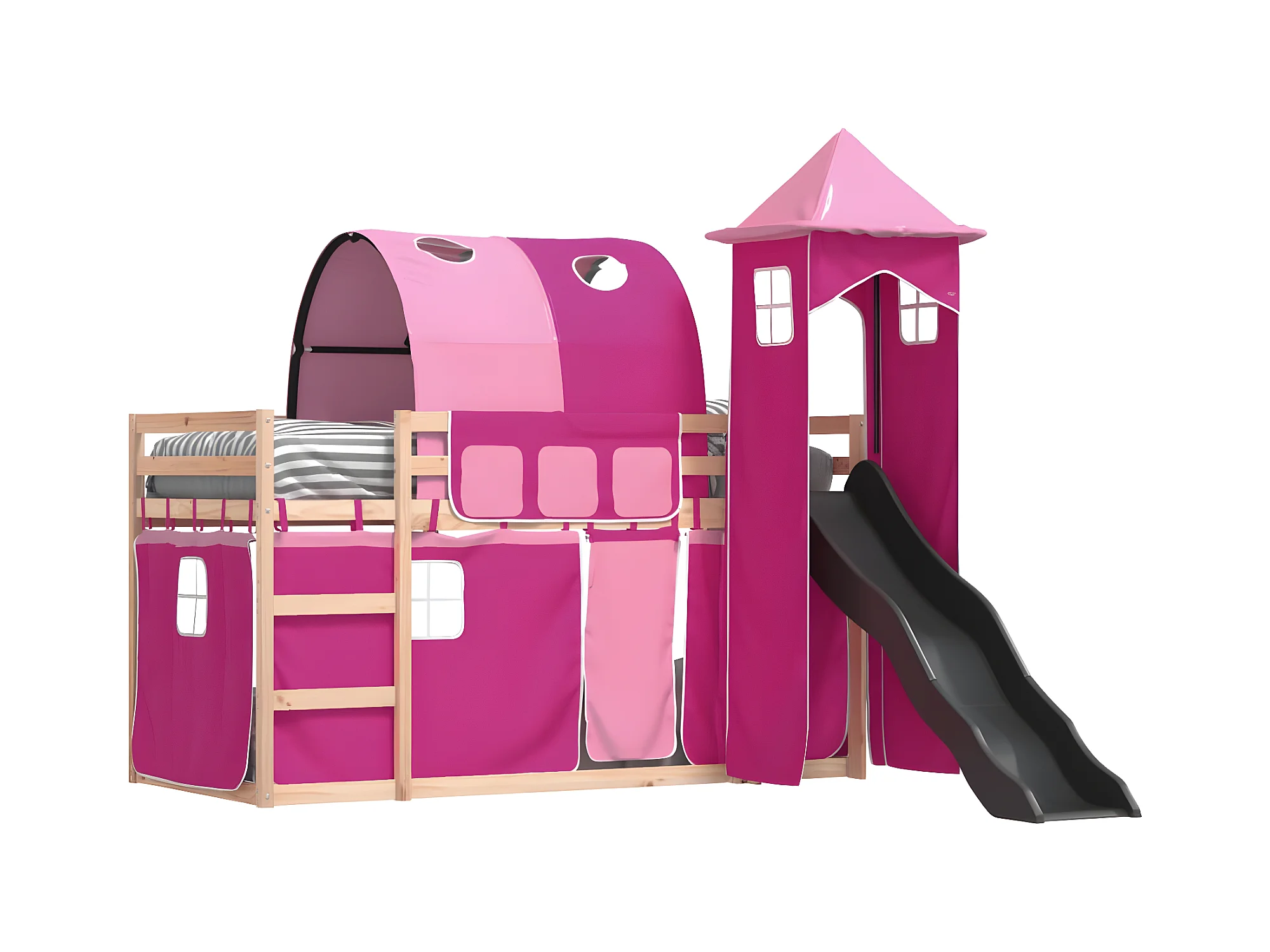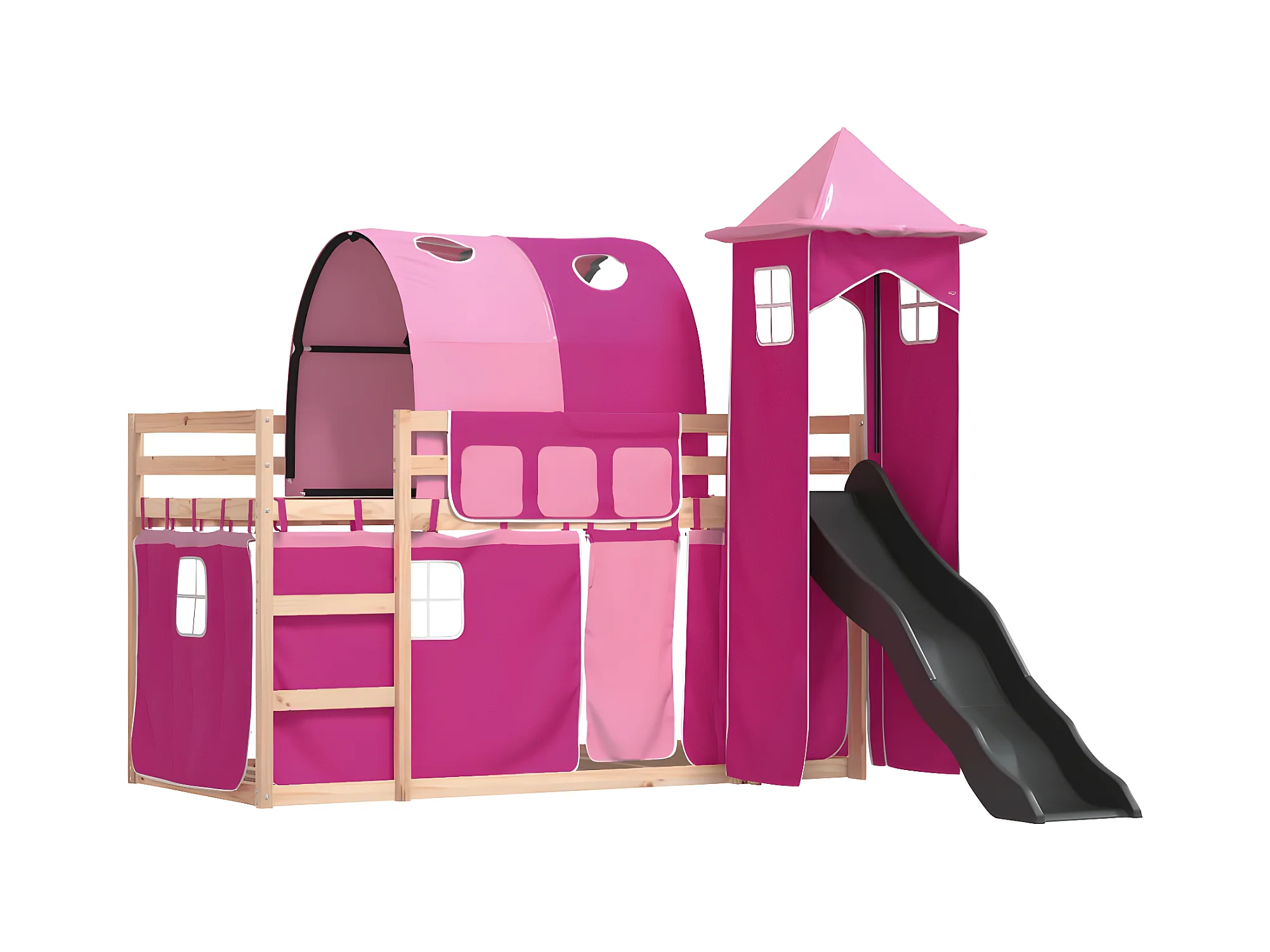 Lit superposé avec toboggan et rideaux rose 90x190 cm