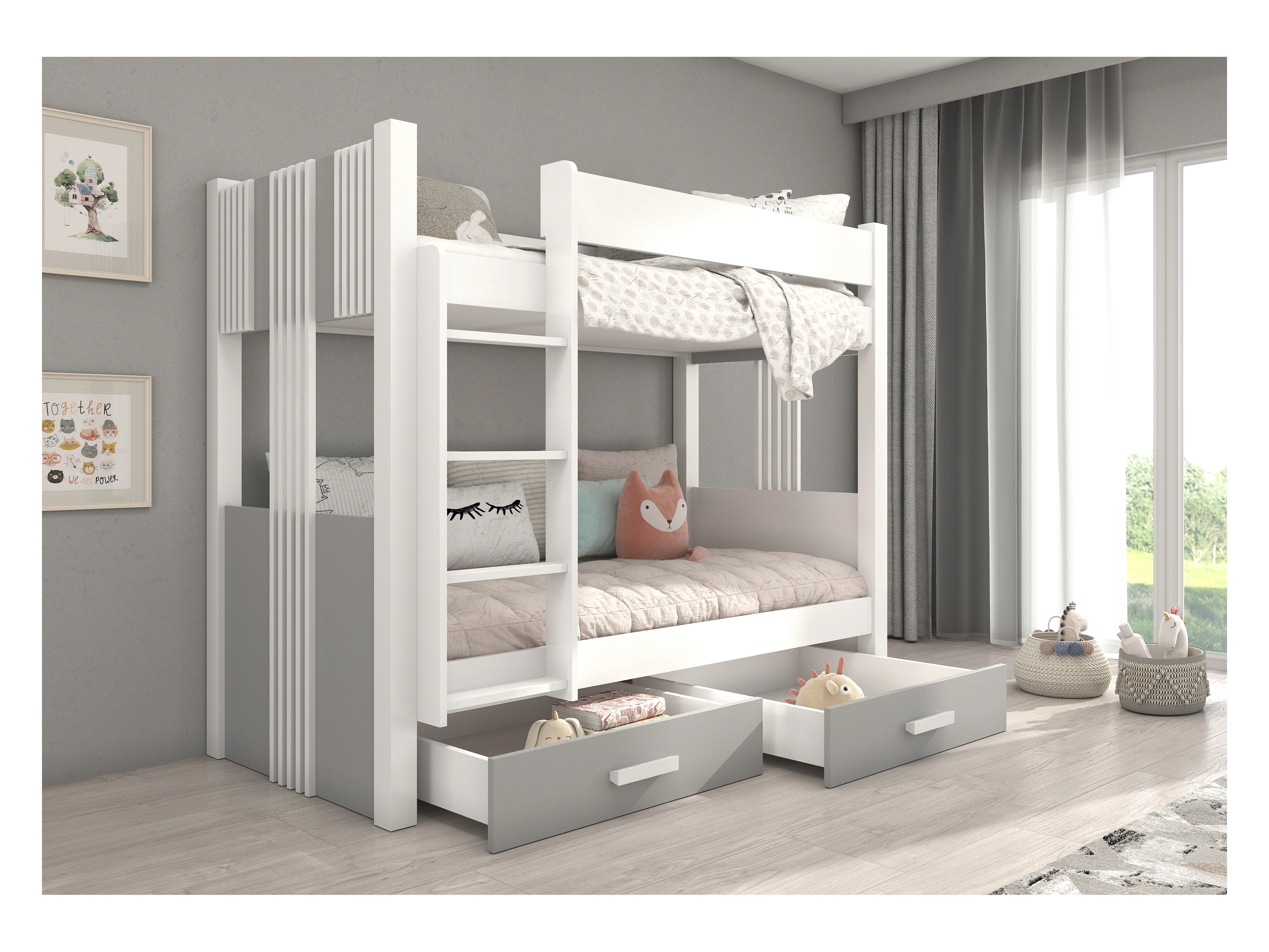 Lit superposé blanc et gris clair 2 couchages 80x180 ou 90x200 avec tiroirs de rangement Luka-2 matelas 80x180-80x180