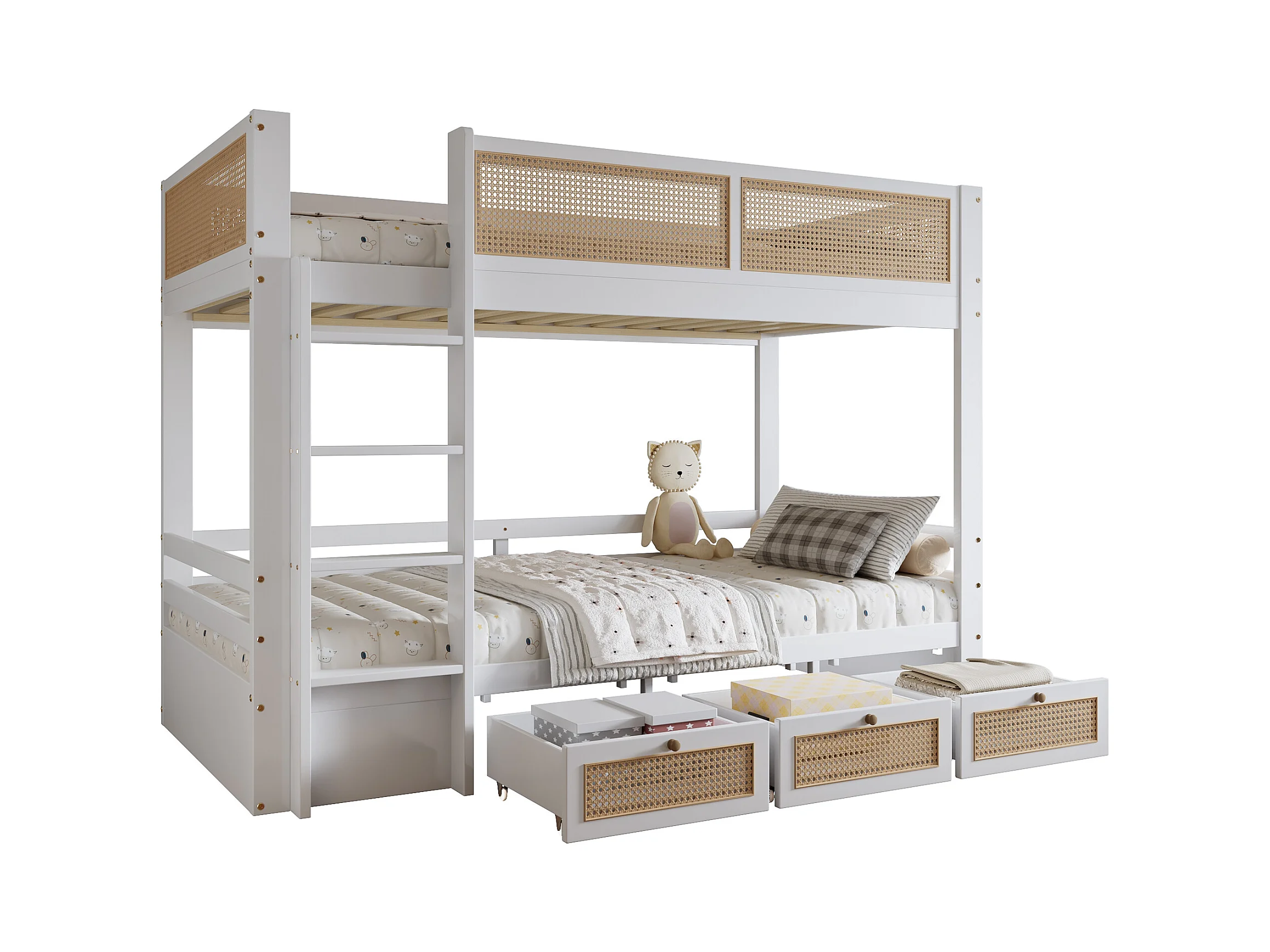 Lit superposé enfant avec rangements, barrière en rotin tressé, pin+MDF, blanc+nature, 3 tiroirs à roulettes (205x102.5x150cm)