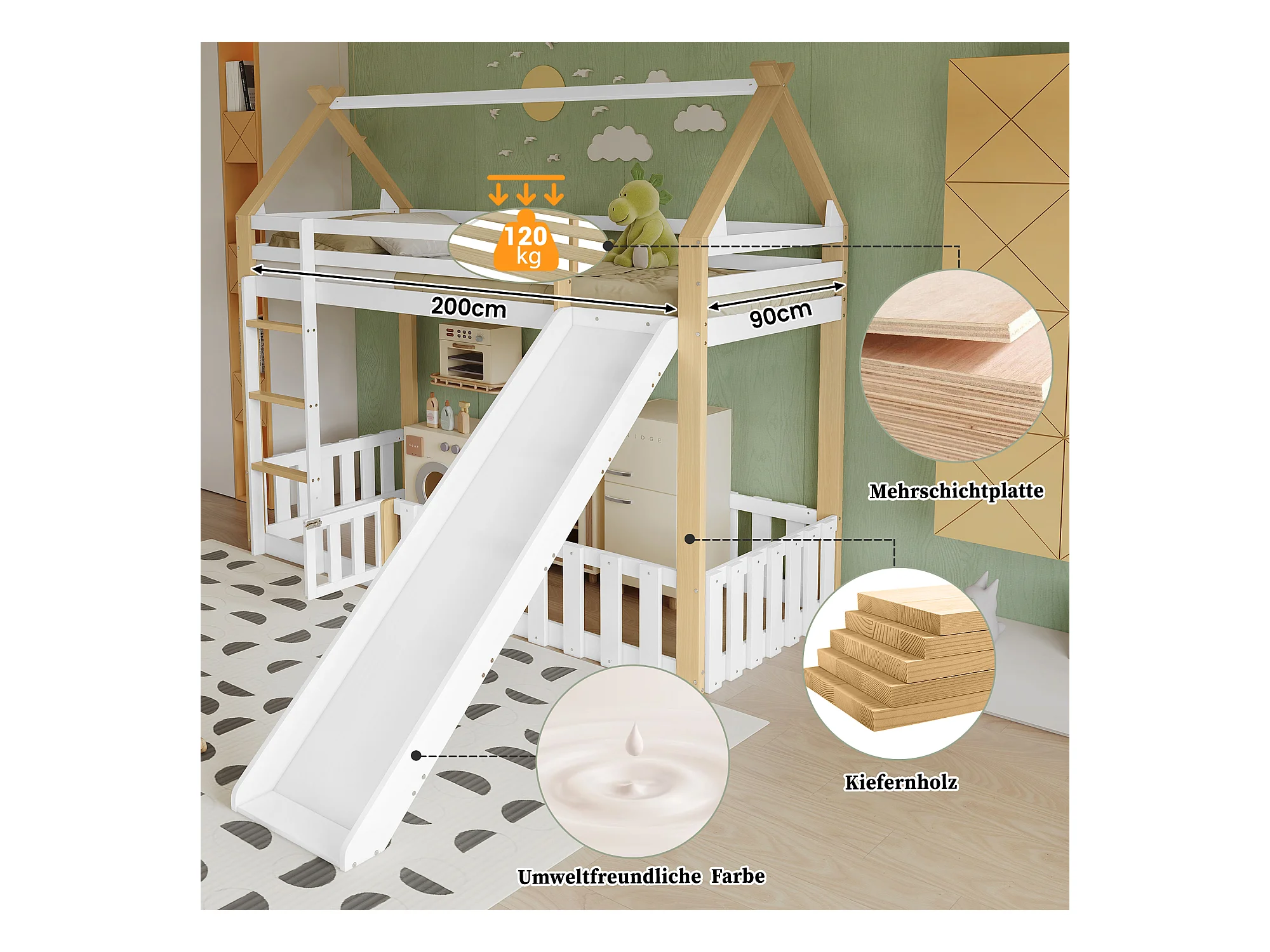 Lit superposé enfant avec toboggan, design toit élégant, pin+MDF, blanc+naturel, espace de jeu sécurisé (265x231x187cm)