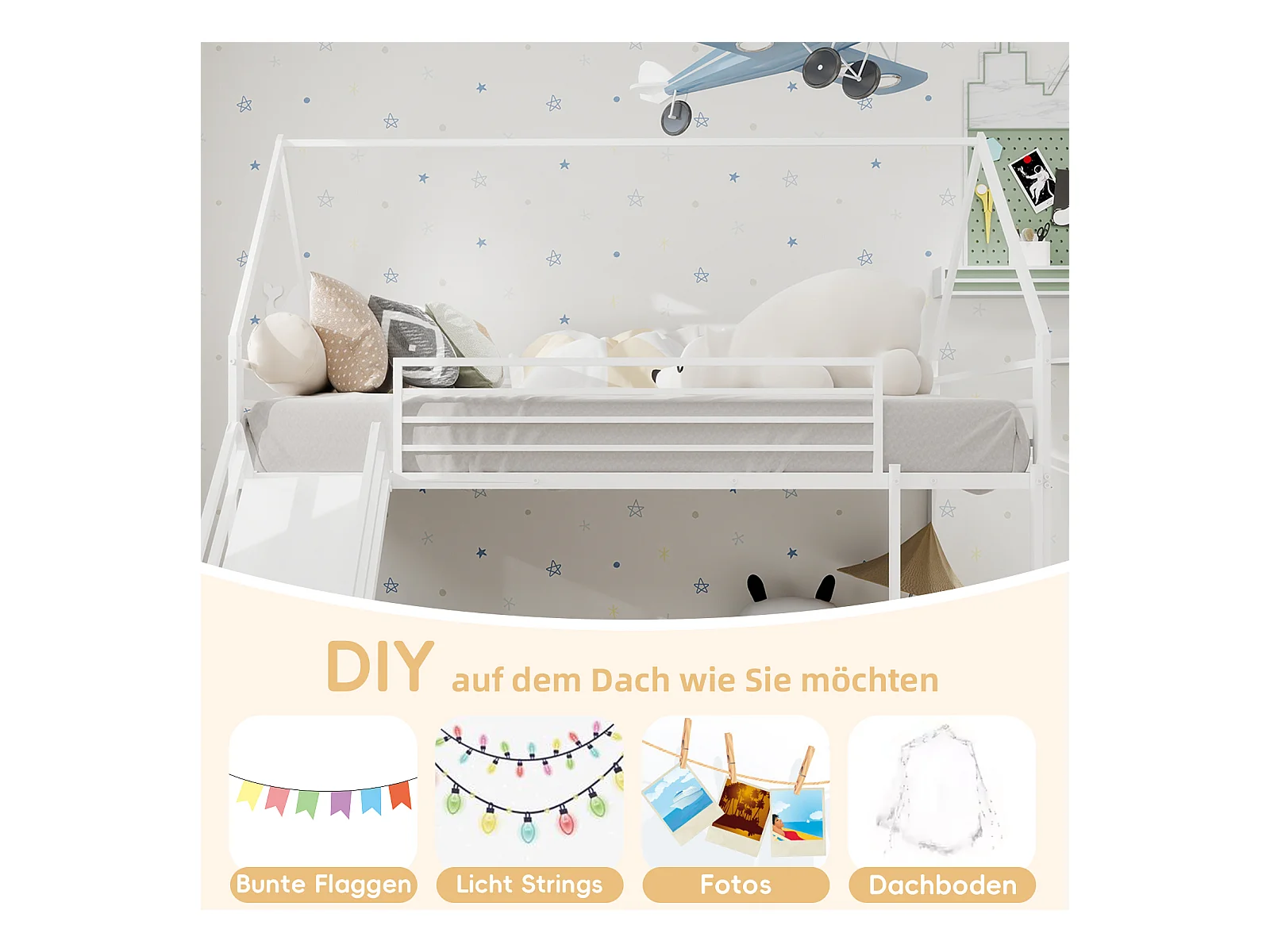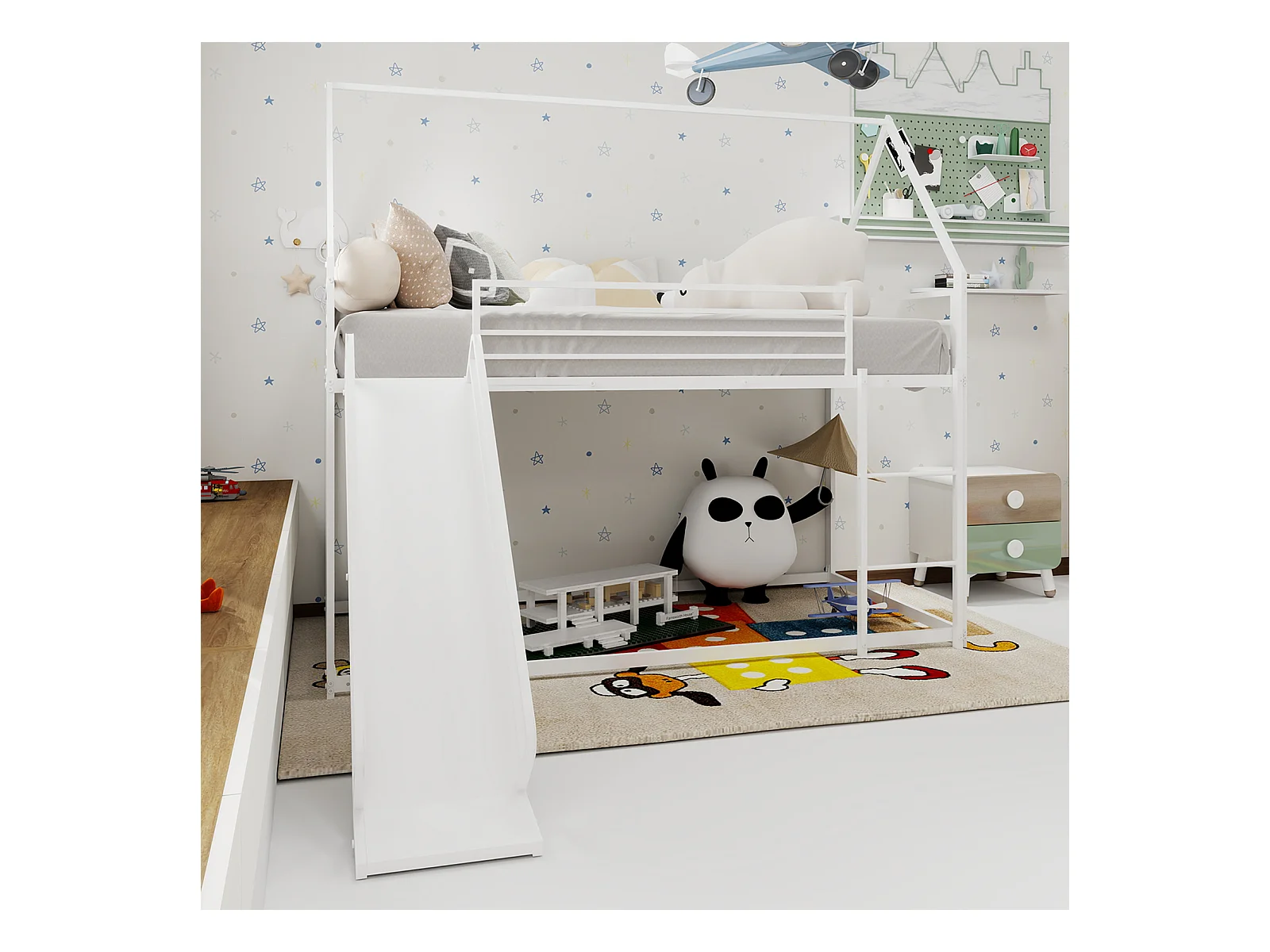 Lit superposé jumeau avec toboggan, design maison pour enfants, structure en métal, blanc (194x105x179cm)